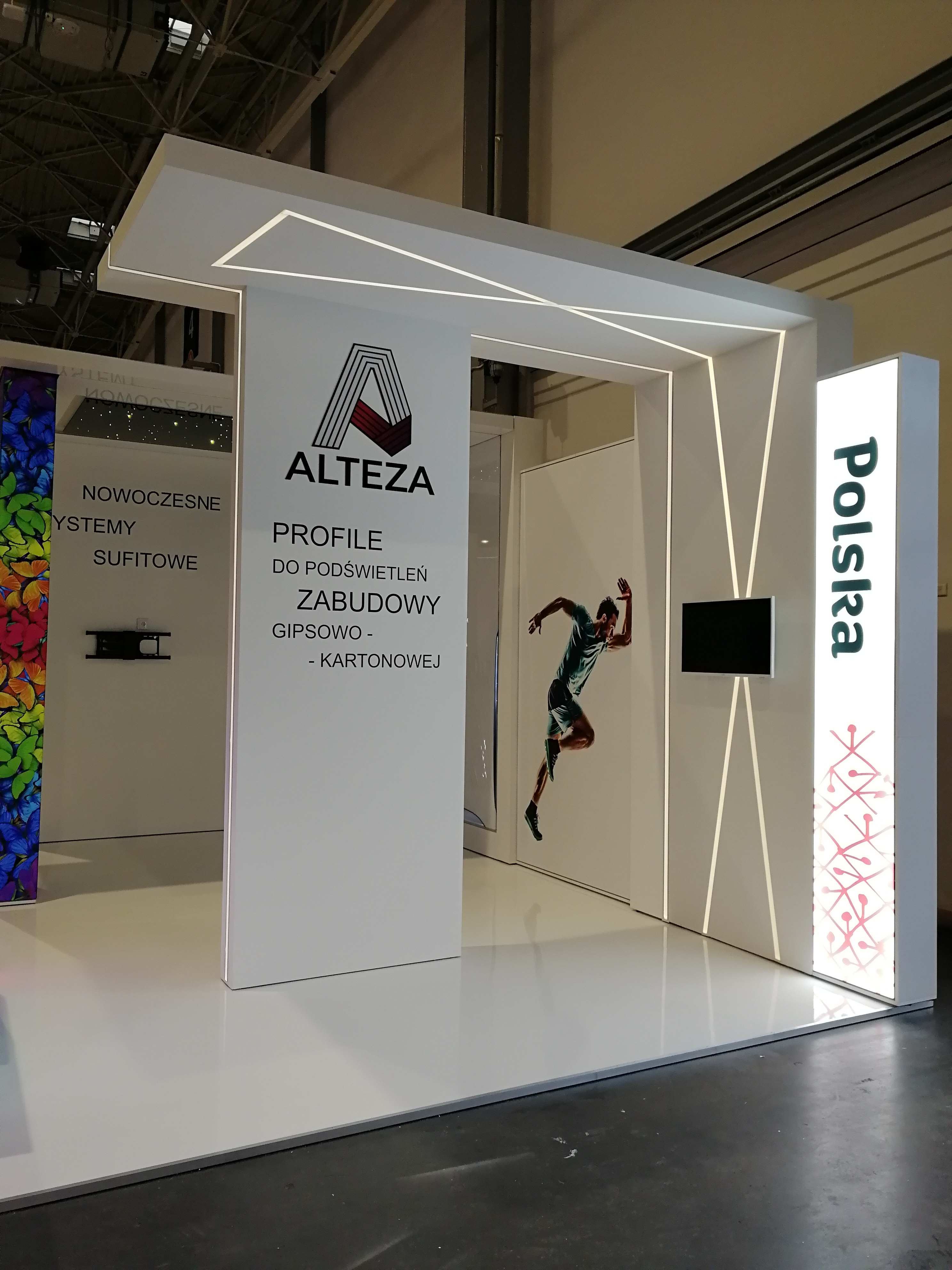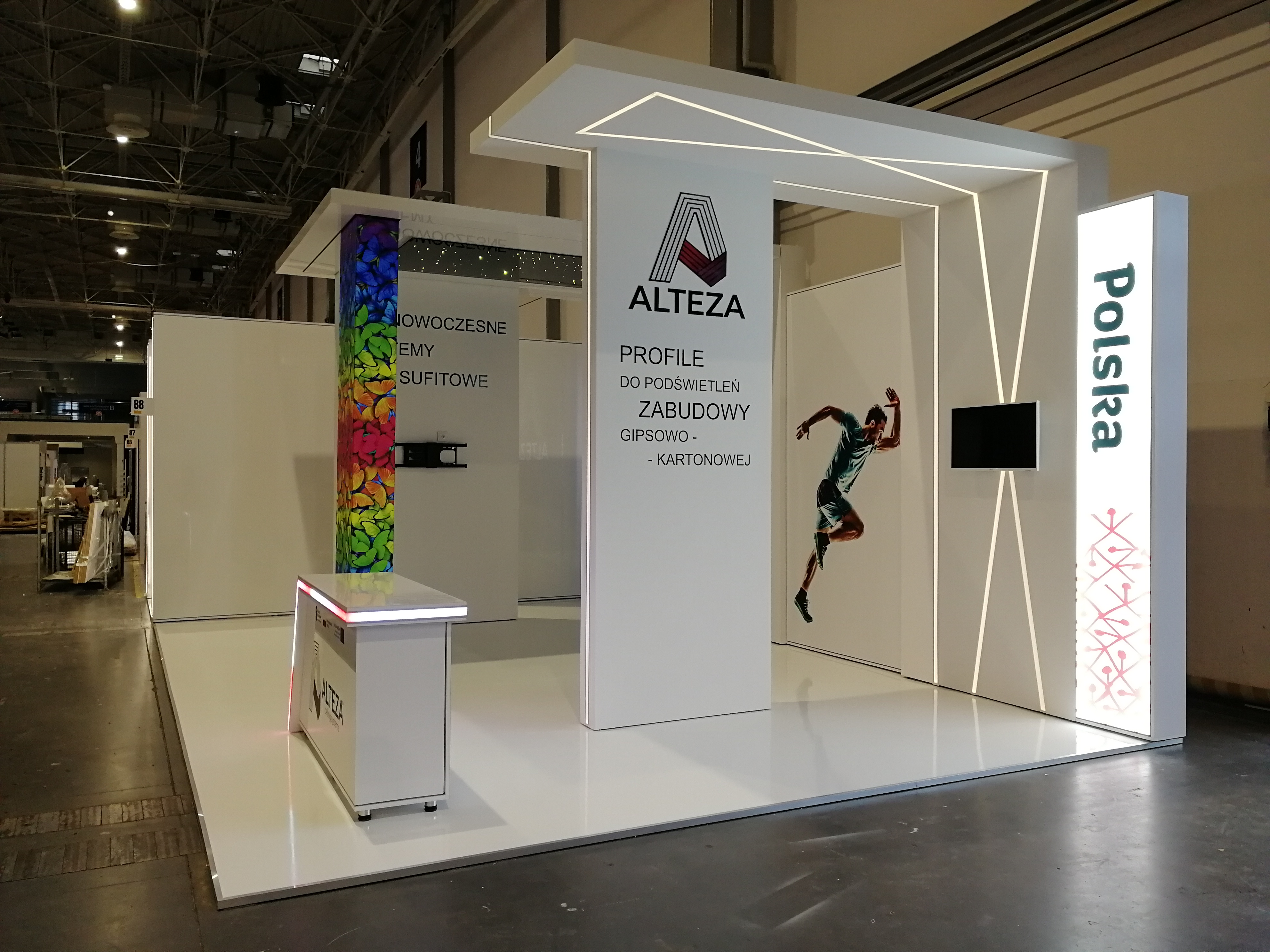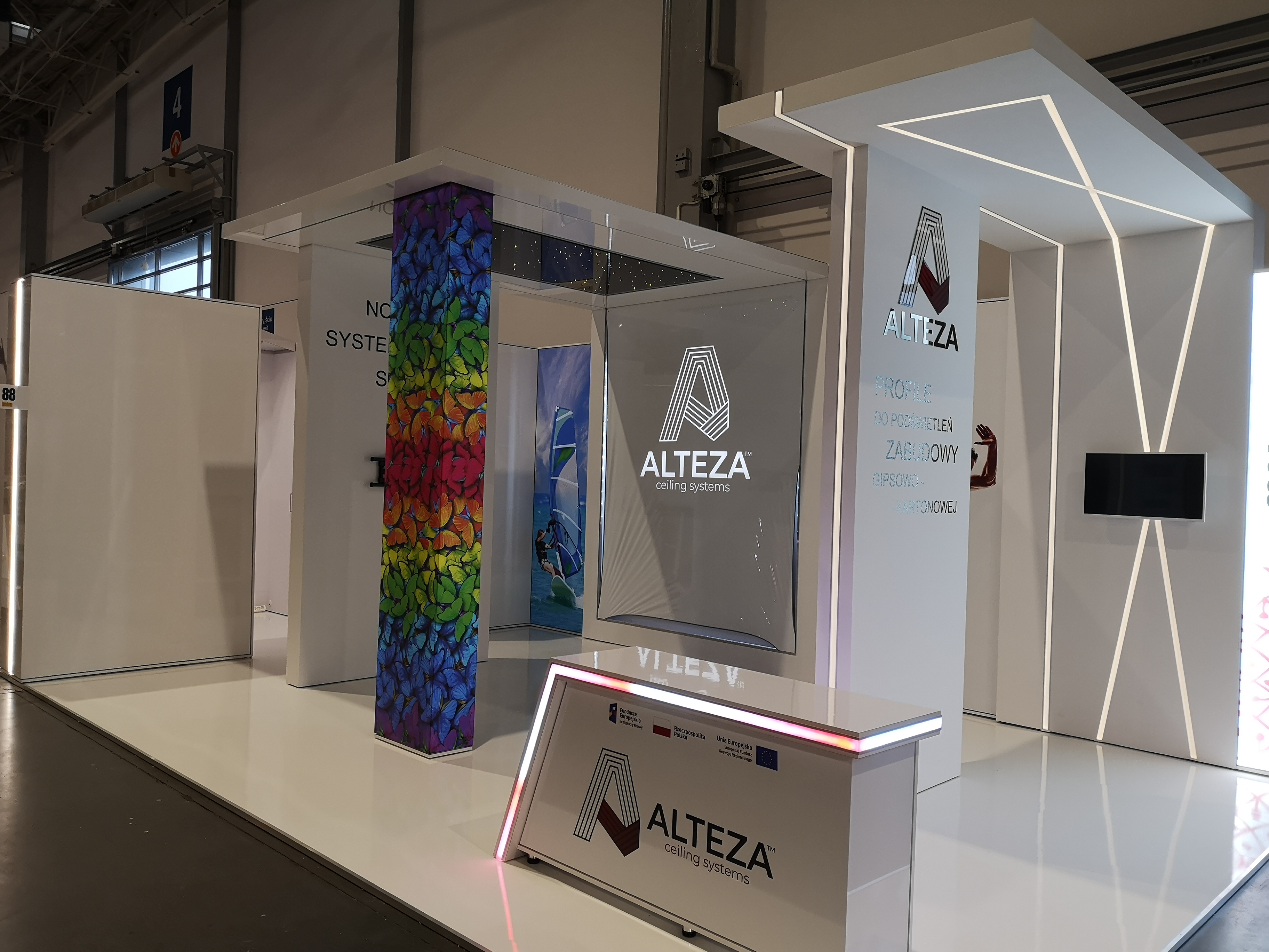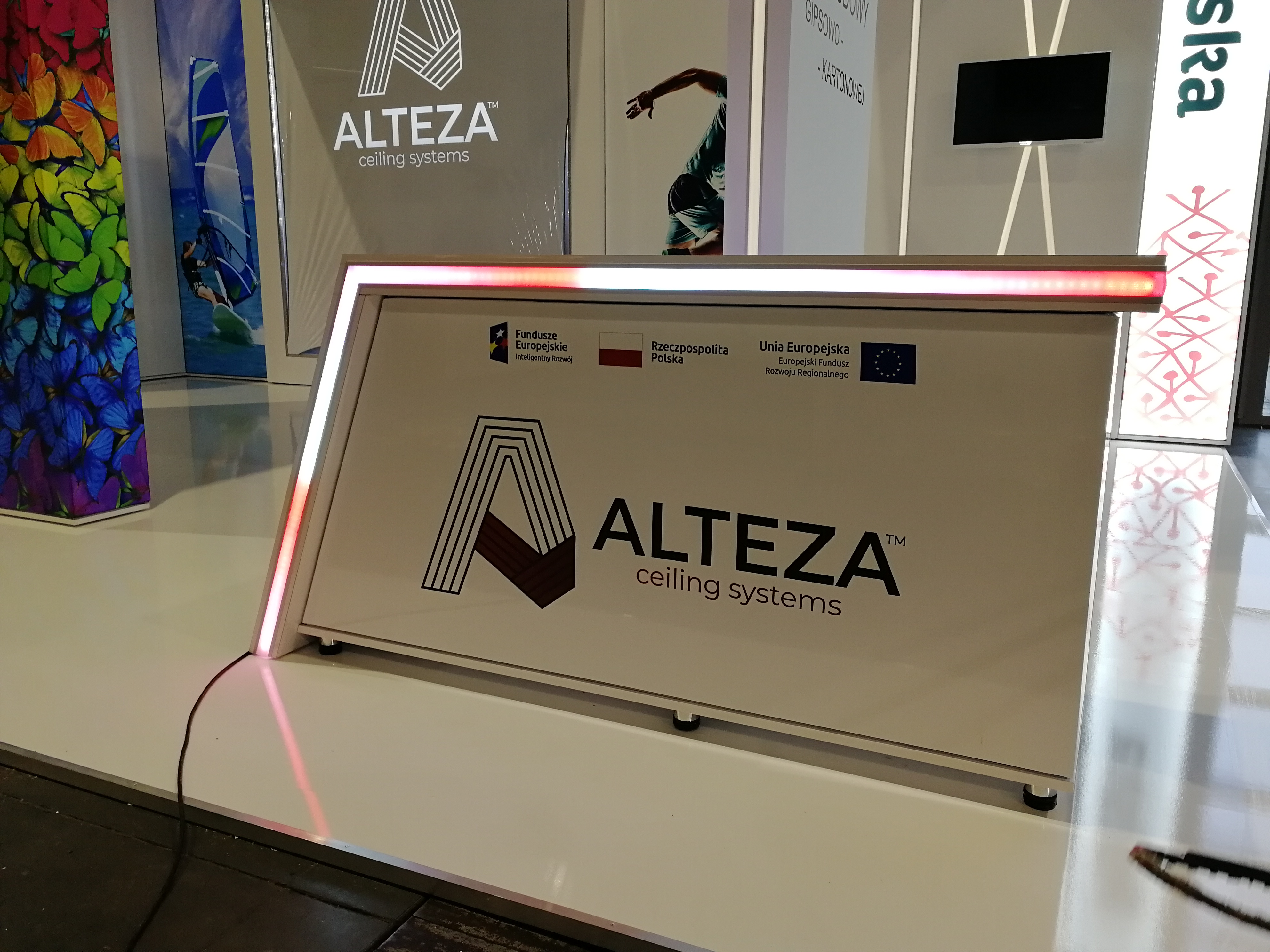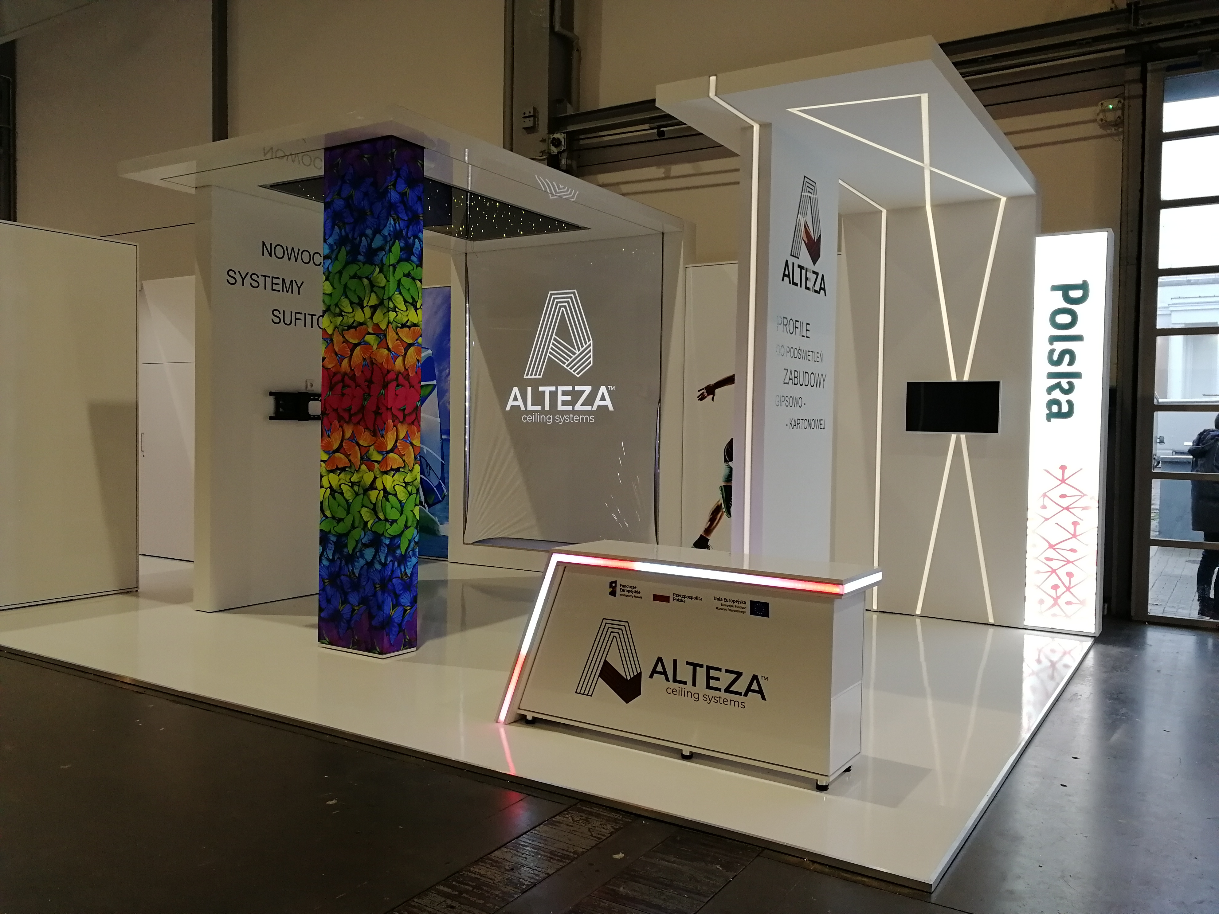 Nasz klient zajmuje się nowoczesnymi systemami sufitowymi – profilami do podświetleń zabudowy gipsowo-kartonowej. Projekt stoiska wymagał połączenia wielu zróżnicowanych technologii i profili, tak aby zaprezentować jak najszerszą gamę produktów firmy ALTEZA, zachowując przy tym jak największą precyzję. Nie było to łatwe zadanie, jednak kunszt naszego projektanta oraz doświadczenie załogi pozwoliły na osiągnięcie naprawdę spektakularnego efektu, co można zobaczyć na zdjęciach oraz filmiku: