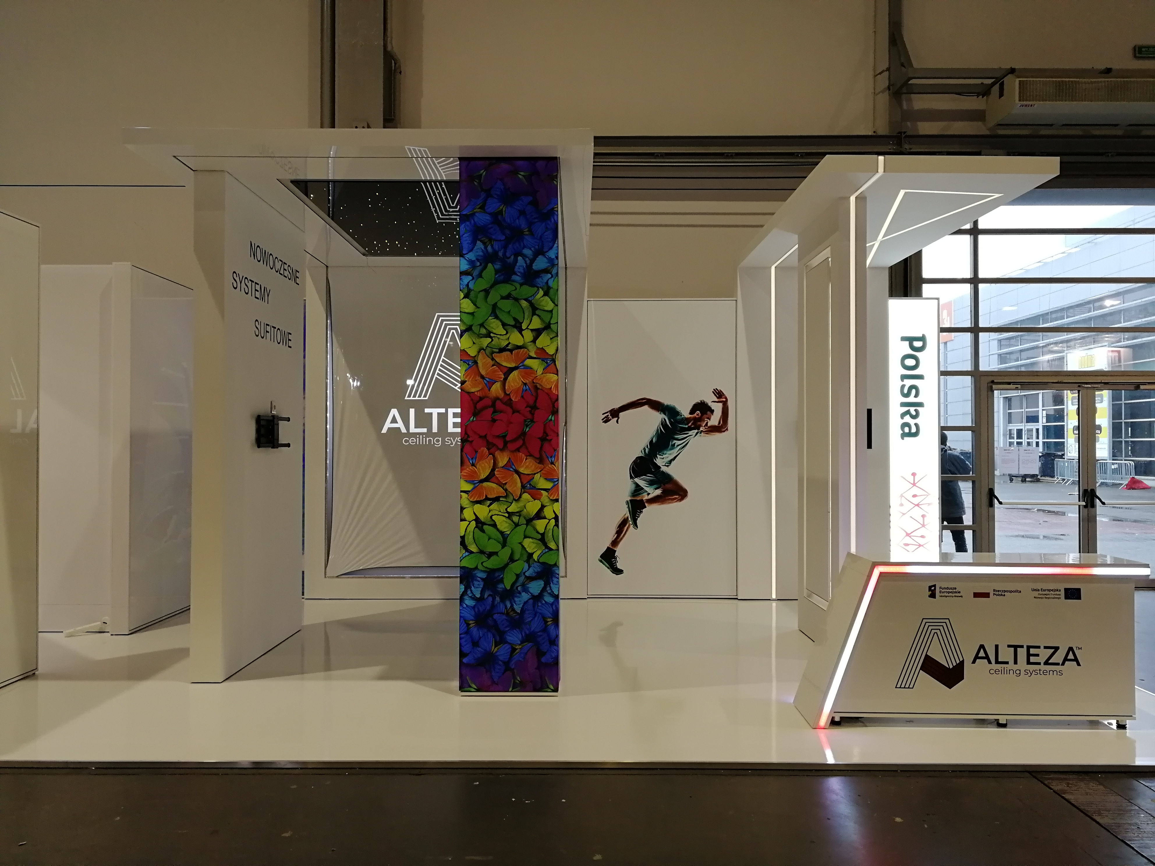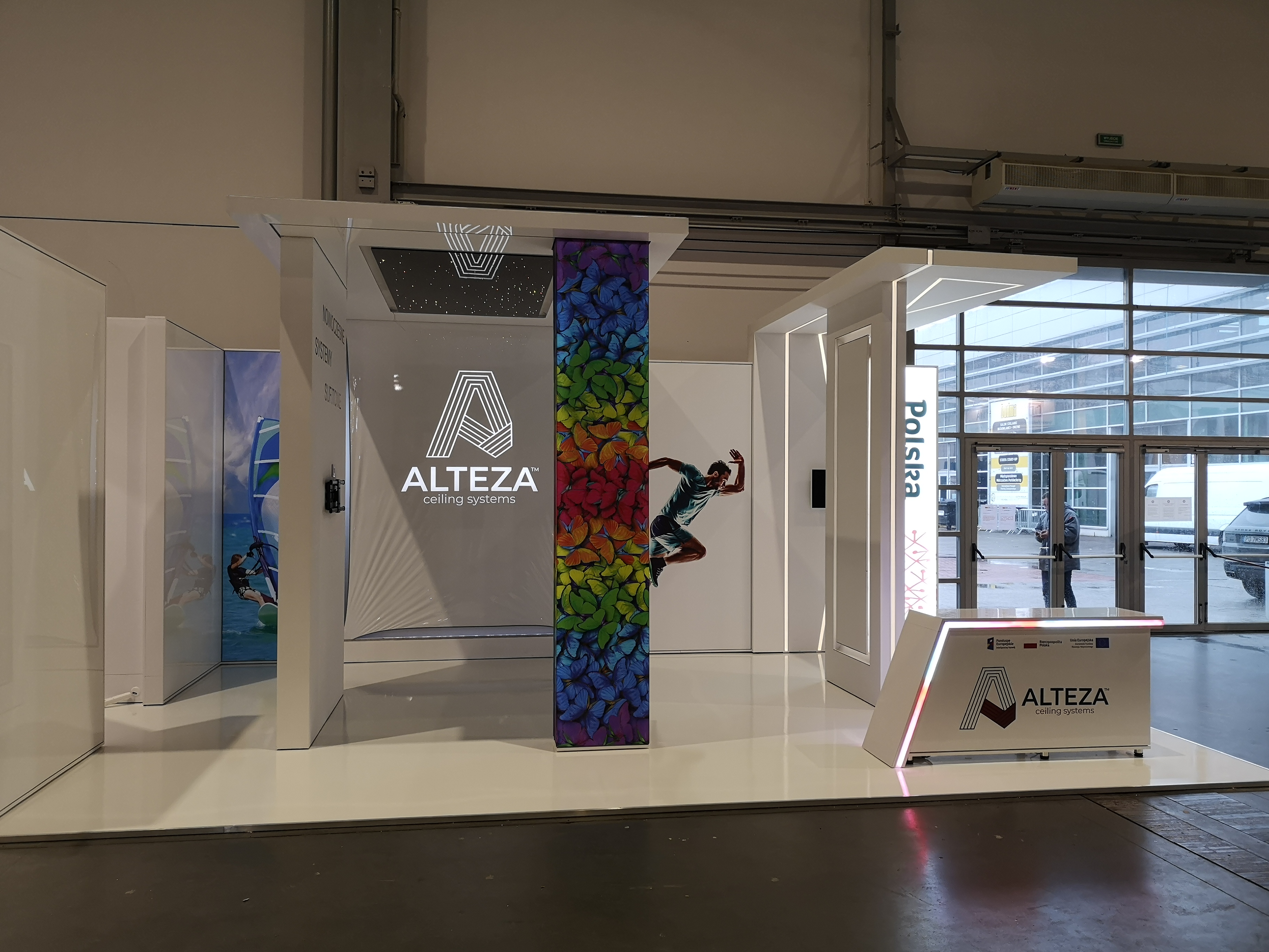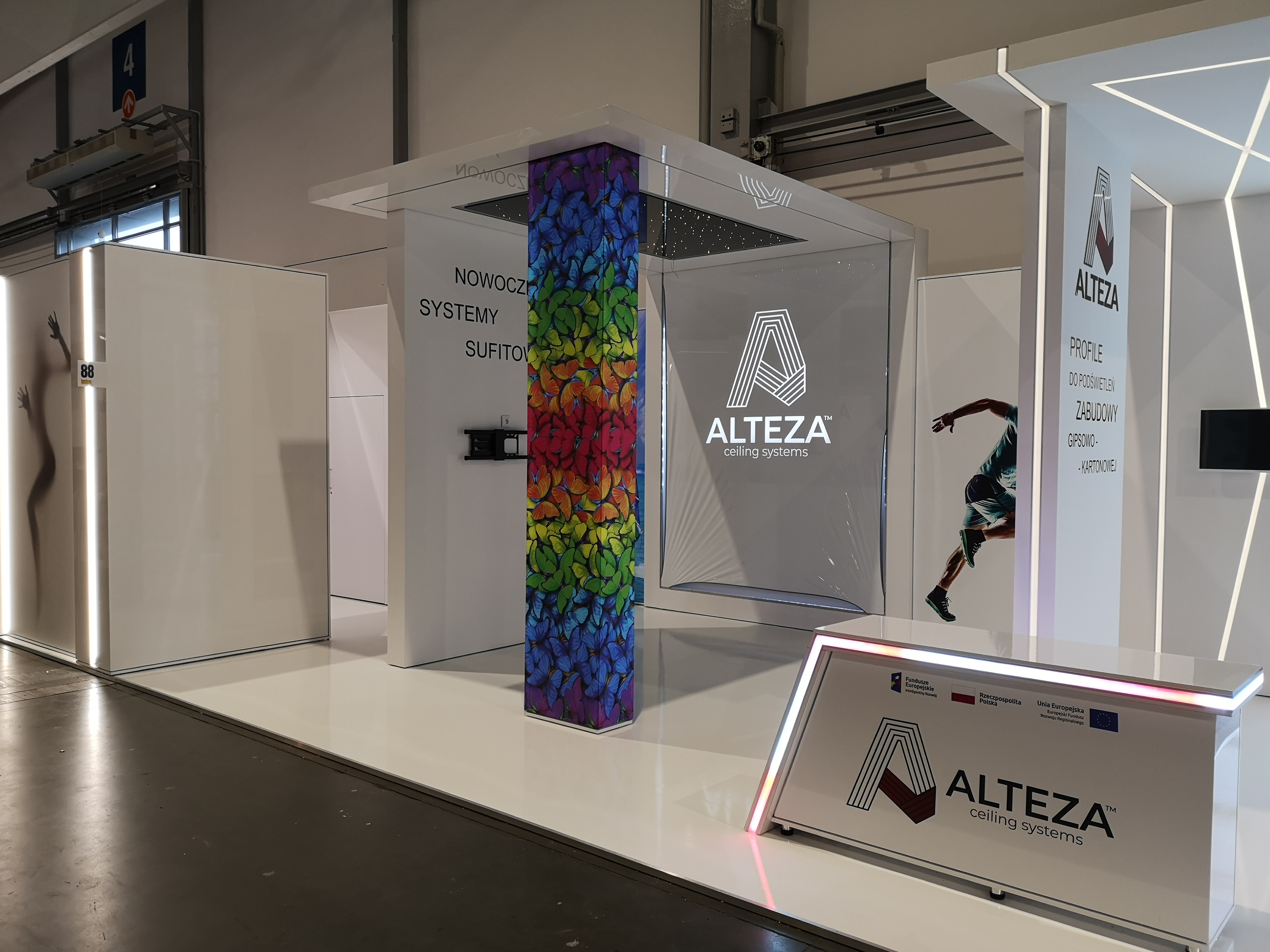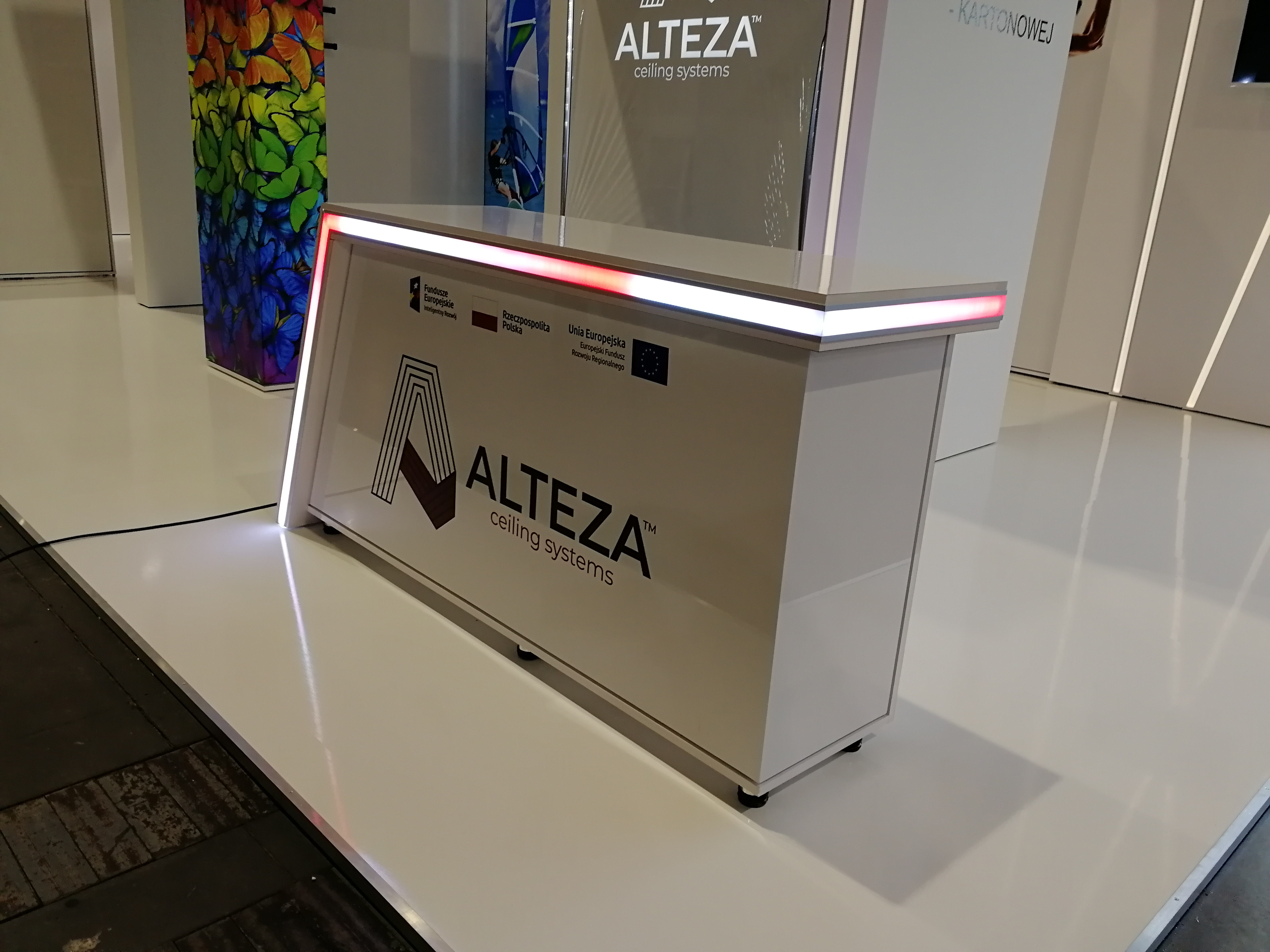 Nasz klient zajmuje się nowoczesnymi systemami sufitowymi – profilami do podświetleń zabudowy gipsowo-kartonowej. Projekt stoiska wymagał połączenia wielu zróżnicowanych technologii i profili, tak aby zaprezentować jak najszerszą gamę produktów firmy ALTEZA, zachowując przy tym jak największą precyzję. Nie było to łatwe zadanie, jednak kunszt naszego projektanta oraz doświadczenie załogi pozwoliły na osiągnięcie naprawdę spektakularnego efektu, co można zobaczyć na zdjęciach oraz filmiku: