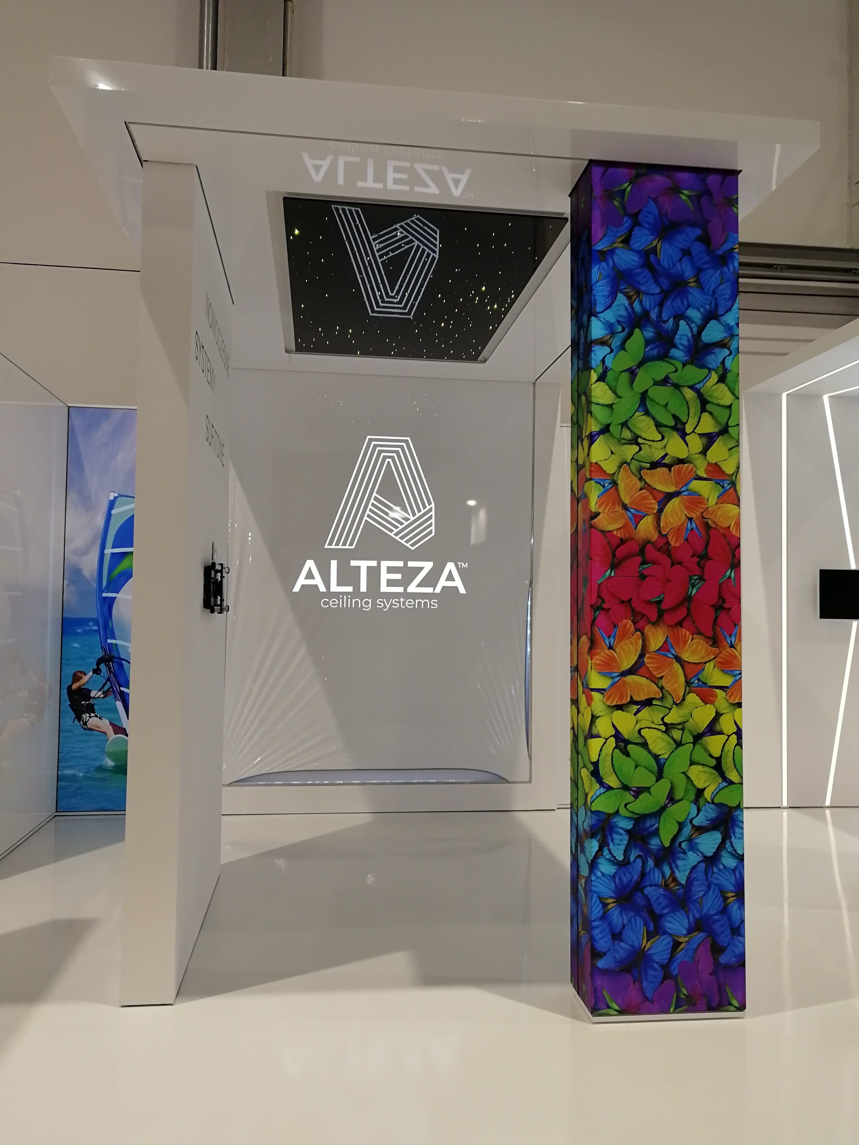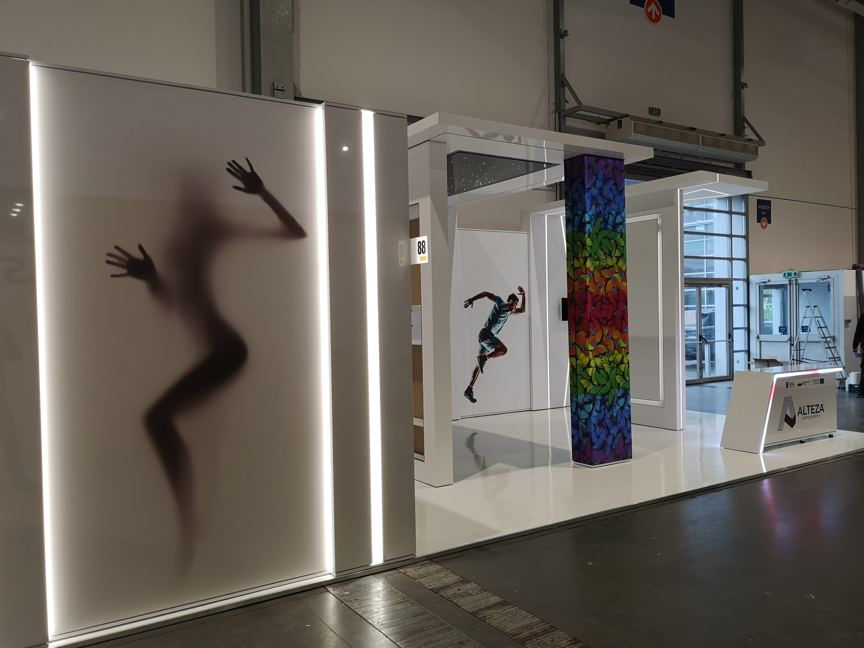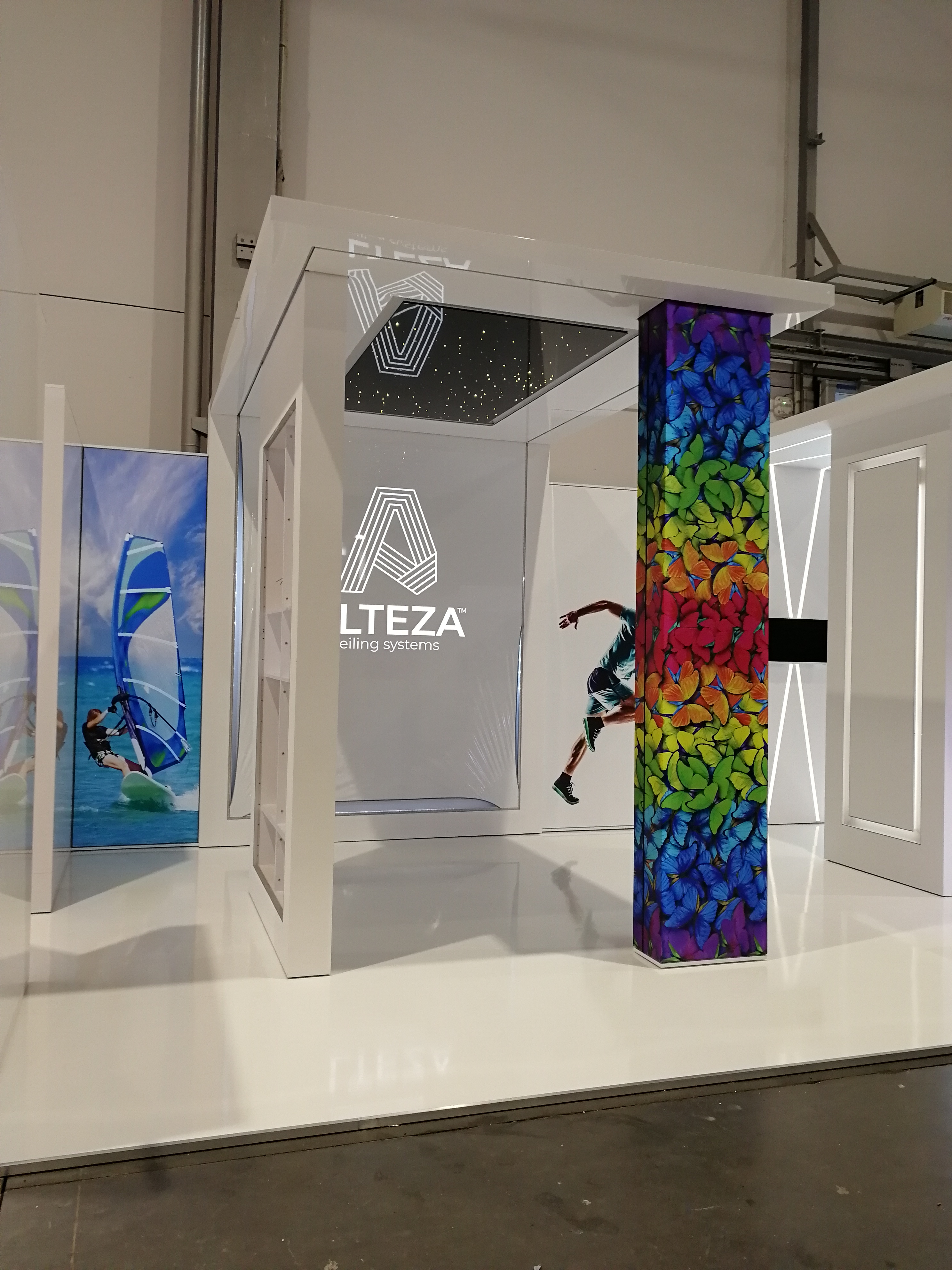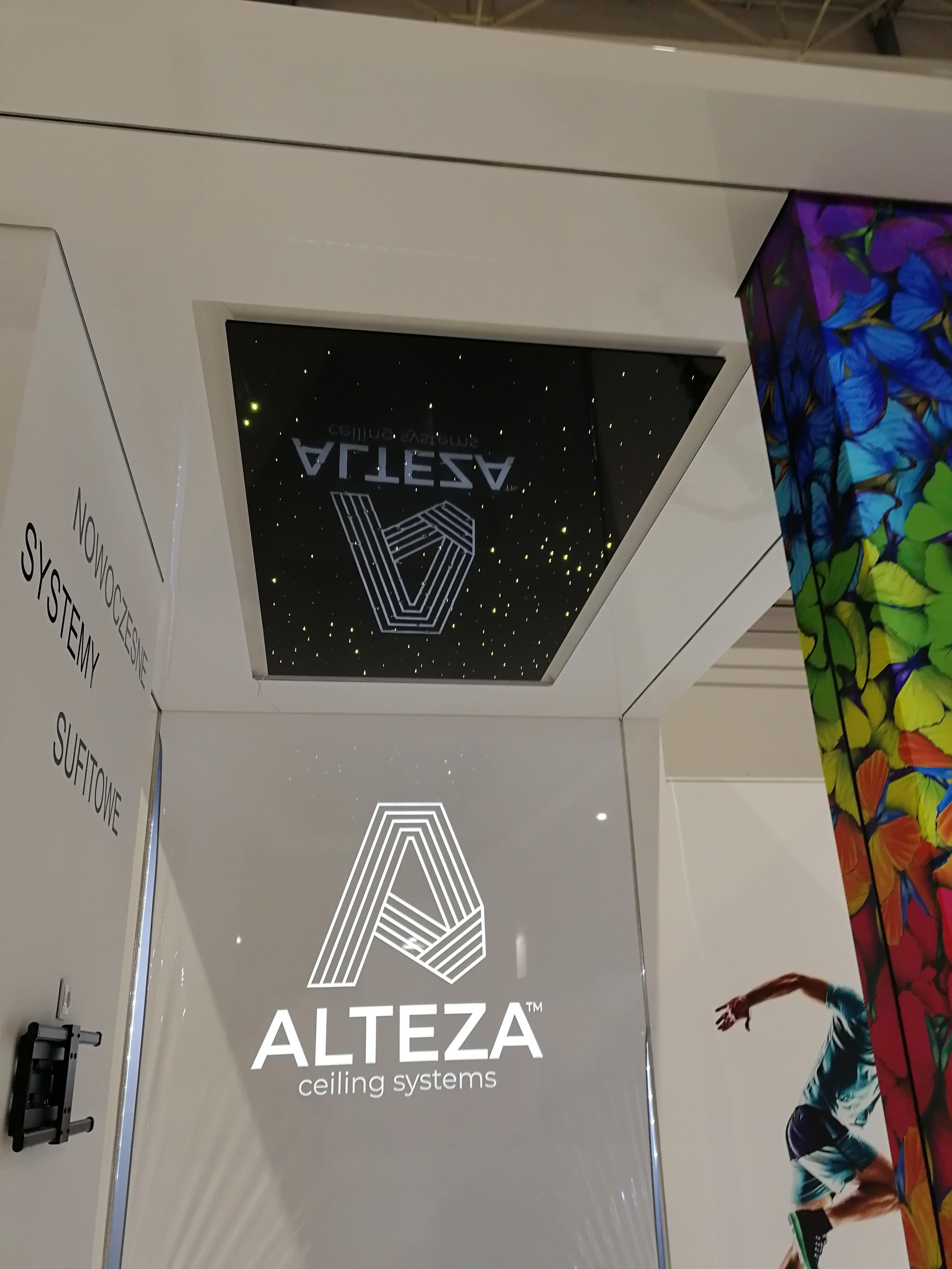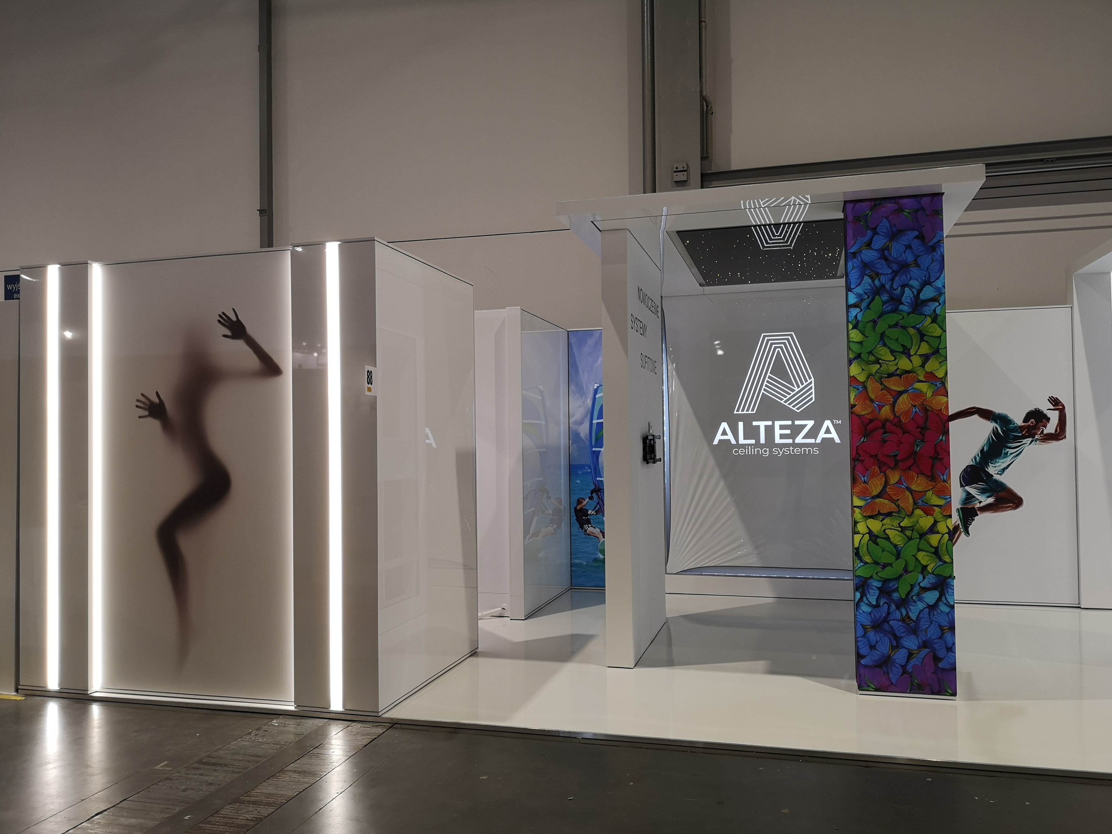 Nasz klient zajmuje się nowoczesnymi systemami sufitowymi – profilami do podświetleń zabudowy gipsowo-kartonowej. Projekt stoiska wymagał połączenia wielu zróżnicowanych technologii i profili, tak aby zaprezentować jak najszerszą gamę produktów firmy ALTEZA, zachowując przy tym jak największą precyzję. Nie było to łatwe zadanie, jednak kunszt naszego projektanta oraz doświadczenie załogi pozwoliły na osiągnięcie naprawdę spektakularnego efektu, co można zobaczyć na zdjęciach oraz filmiku: