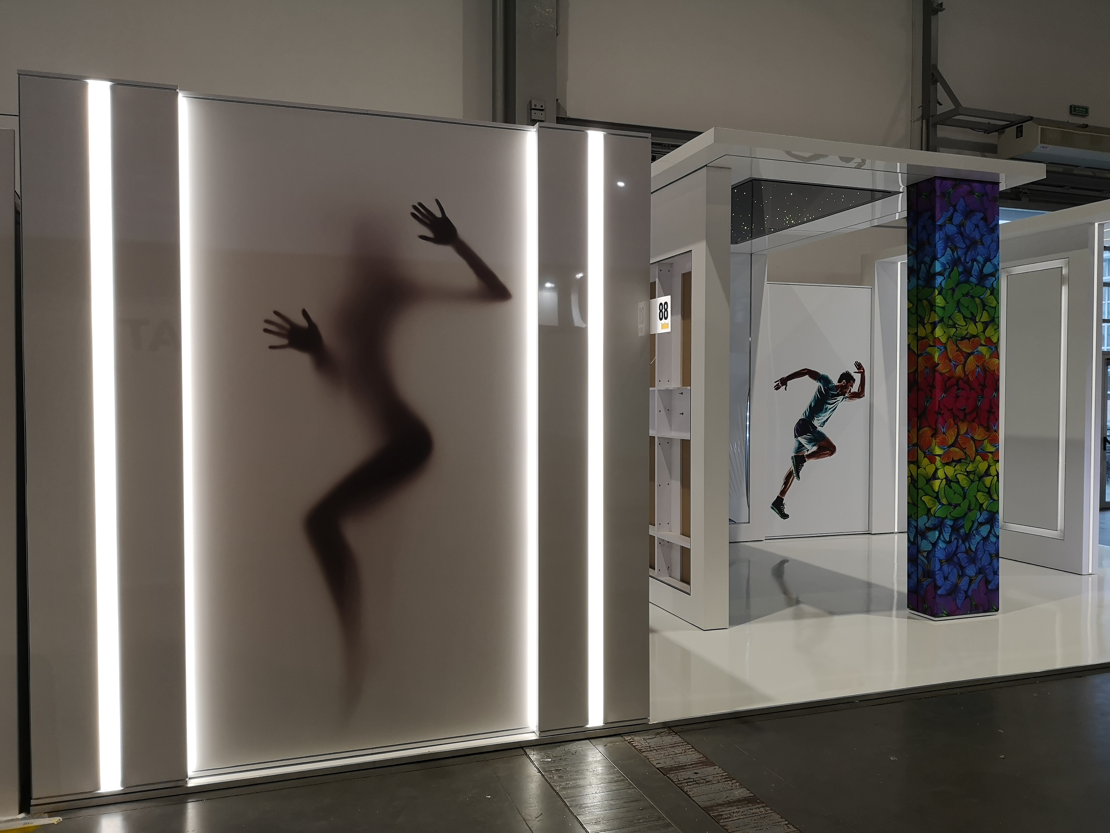 Konstrukcja ścian wykonana została z białej płyty meblowej. Wykończenie zaś szpachlowanymi, szlifowanymi i malowanymi na biało płytami GK oraz MDF. Sufity powstały w oparciu o białą płytę meblową ze wzmocnieniami w postaci profili stalowych, wykończonych adekwatnie do ścian, czasem poprzez obłożenie materiałem napinanym. Meble ruchome, takie jak regał i lada, wykonane zostały z białej płyty meblowej wykończonej od zewnątrz laminatem w połysku. Dodatkowo krawędź blatu lady po obwodzie zwieńczona została oświetleniem LED w profilu. Logo powstało z pleksiglass 3mm, napisy z folii. Prace nad stoiskiem obejmowały również rozprowadzenie elektryki.