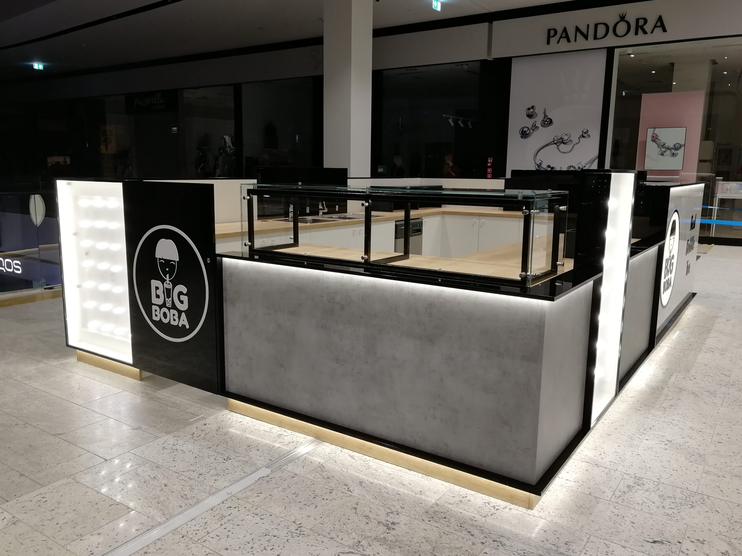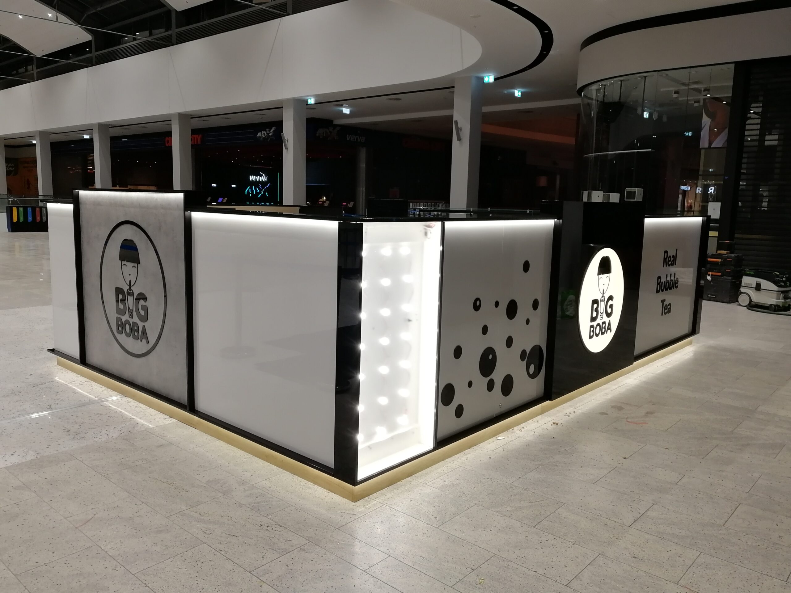 Stoisko zostało wykonane z najwyższej jakości materiałów, takich jak MDF lakierowany na wysoki połysk oraz laminat drewnopodobny, co gwarantuje trwałość i elegancki wygląd. Wewnątrz znajduje się pełna technologia do przygotowania, produkcji i sprzedaży bubble tea, w tym przestrzenie do magazynowania, szafki, lodówki oraz technologia produkcyjna z pełną hydrauliką i skomplikowaną, w pełni zabezpieczoną elektryką 3-fazową z tablicą rozdzielczą z wymaganymi zabezpieczeniami.