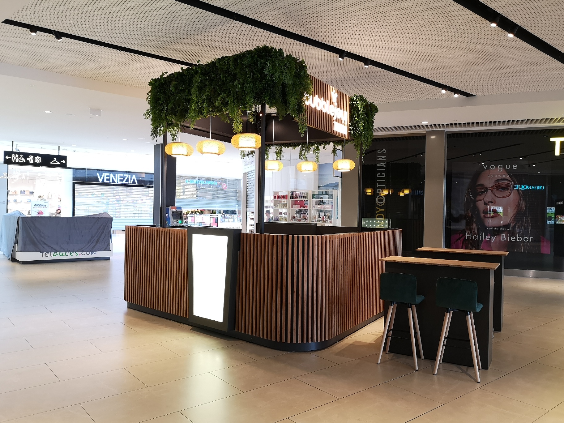 Zewnętrzna część stoiska ozdobiona jest lakierowanymi kasetonami podświetlanymi LED, przyciągającymi wzrok klientów. Witryna na dodatki, wykonana z konstrukcji stalowej i szkła hartowanego, stanowi elegancką ekspozycję produktów. Konstrukcja stalowa nad stoiskiem jest obudowana płytami laminowanymi w czerni, uzupełnionymi bambusowymi lamelami, sztuczną roślinnością oraz przestrzennymi ledonami.