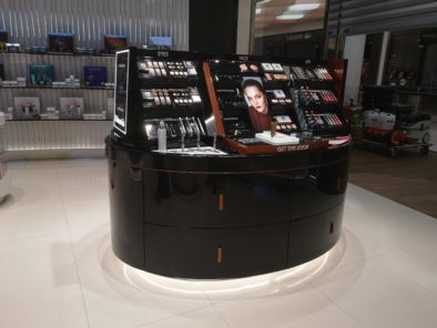 Przedstawiamy dwa bardzo skomplikowane i ekskluzywne meble kosmetyczne. Cały show-room zlokalizowany w renomowanej galerii w Warszawie był zaprojektowany przez znanego na całym świecie designera i projektanta. Meble na rzucie w kształcie elipsy posiadały szuflady w korpusie, zaokrąglone cokoły z podświetleniem LED oraz TOP z częścią ekspozycyjną. Stand tester bar posiadał dodatkowo nadstawkę z bardzo skomplikowanymi elementami POS /POSM z ologowaniem, logotypami, kategoryzacją i grafikami oraz nietypowymi rozwiązaniami na indywidualne zamówienie.