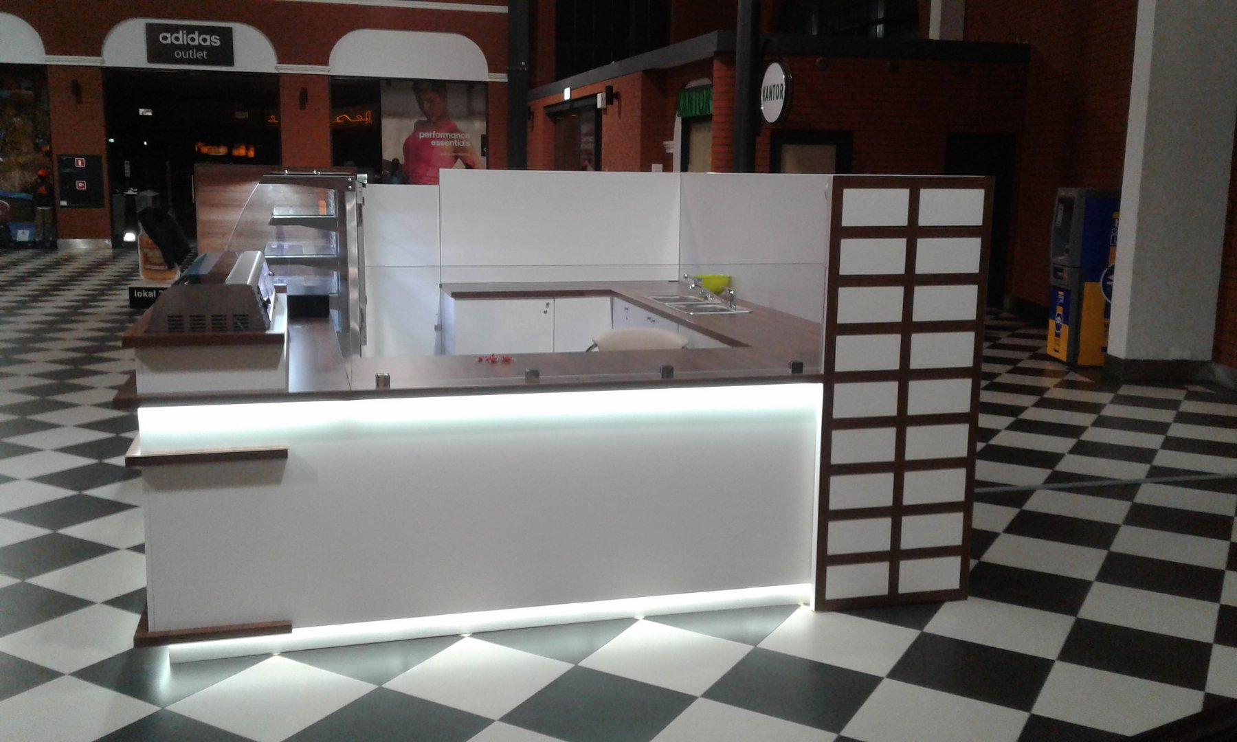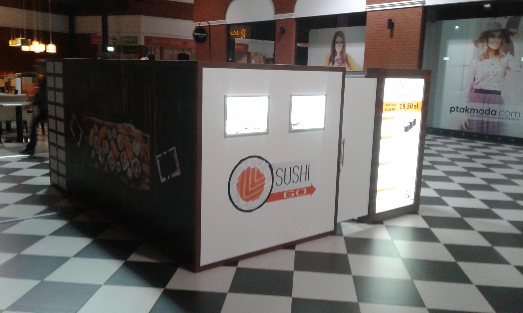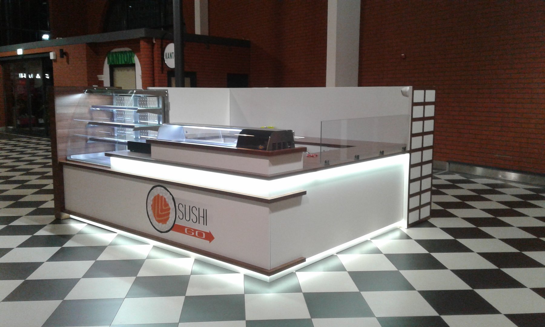 Wyspa z pełnym węzłem sanitarnym oferująca dania sushi na miejscu.