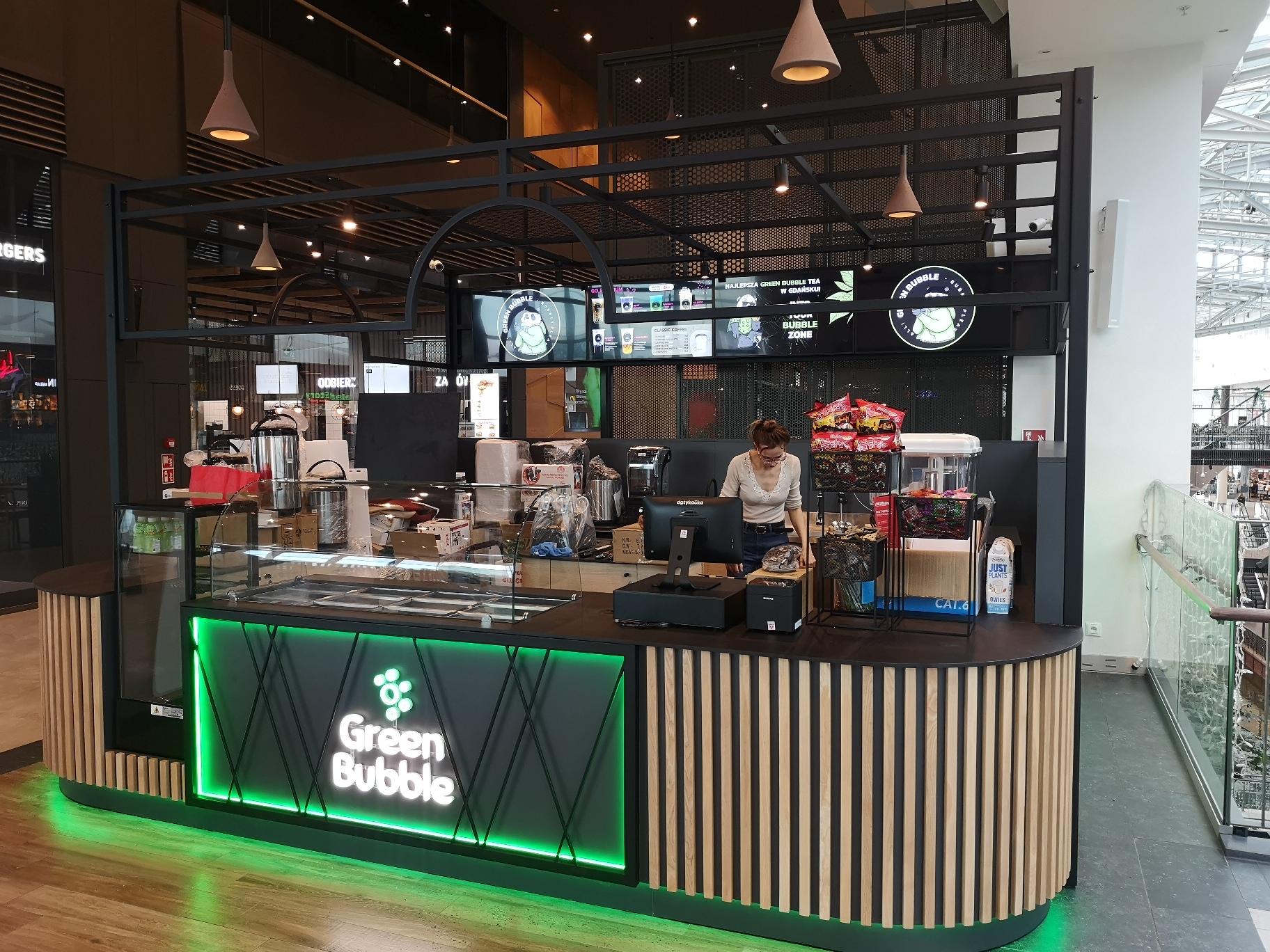 Green Bubble, marka znana z doskonałych napojów Bubble Tea, powróciła do nas, zlecając produkcję stoiska gastronomicznego do Galerii Handlowej Forum w Gdańsku. Nasza firma, przywiązana do najwyższej jakości i unikalnego designu, z dumą przedstawia 16-metrowe stoisko o wyjątkowym charakterze.