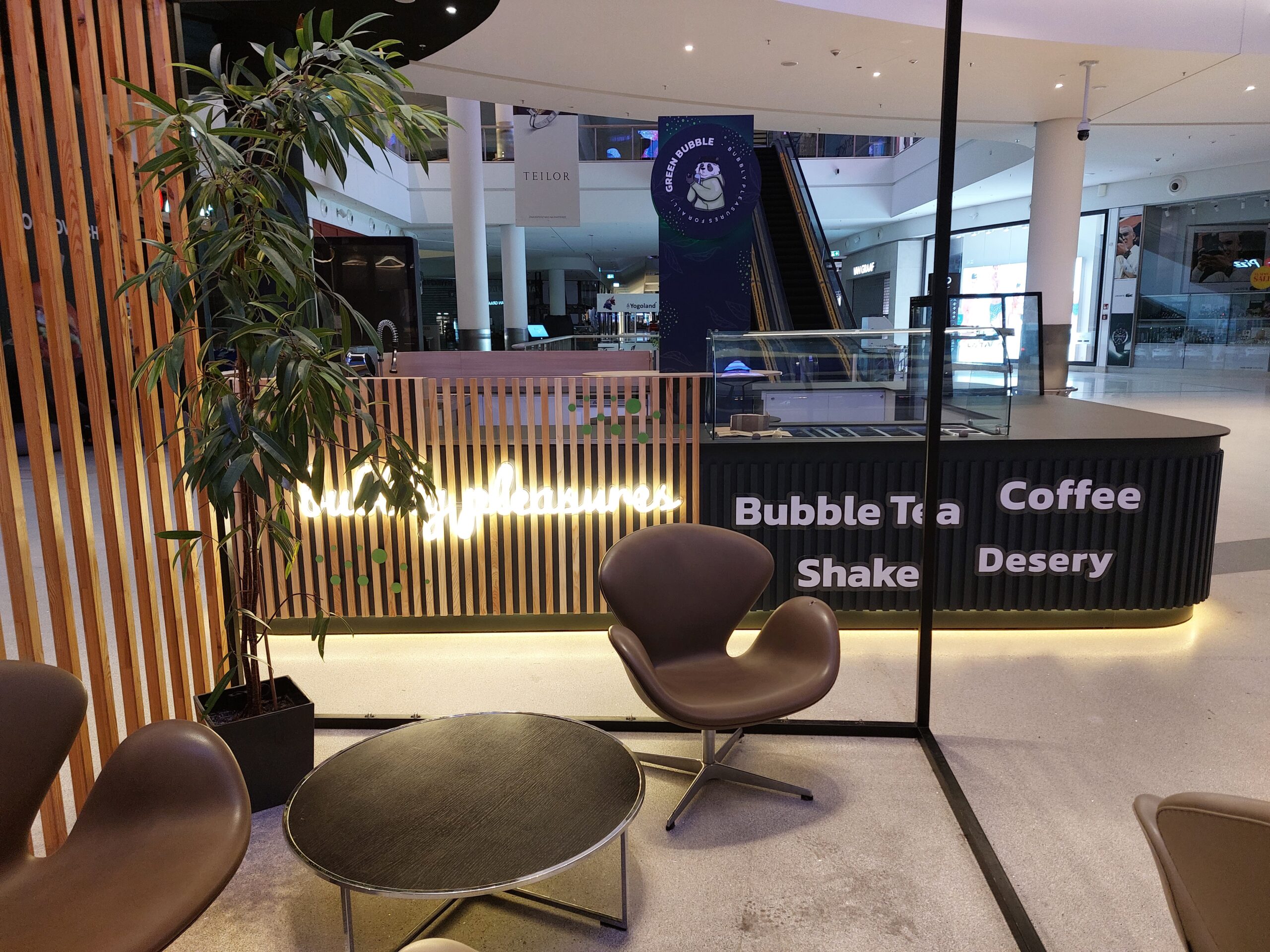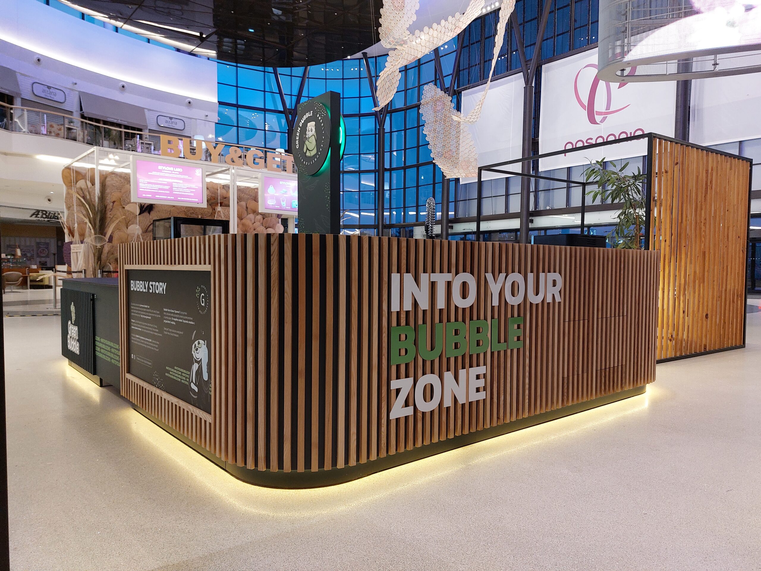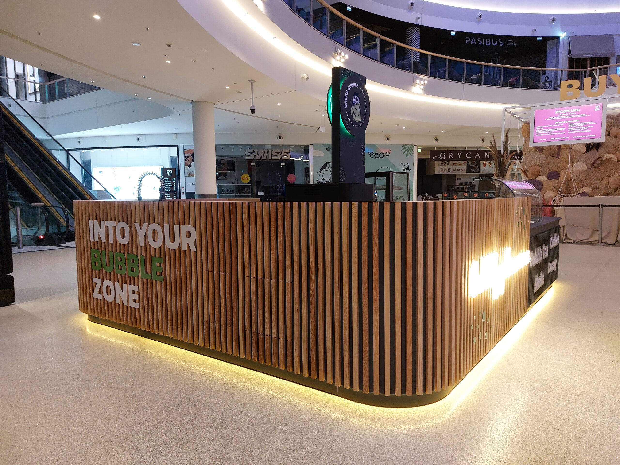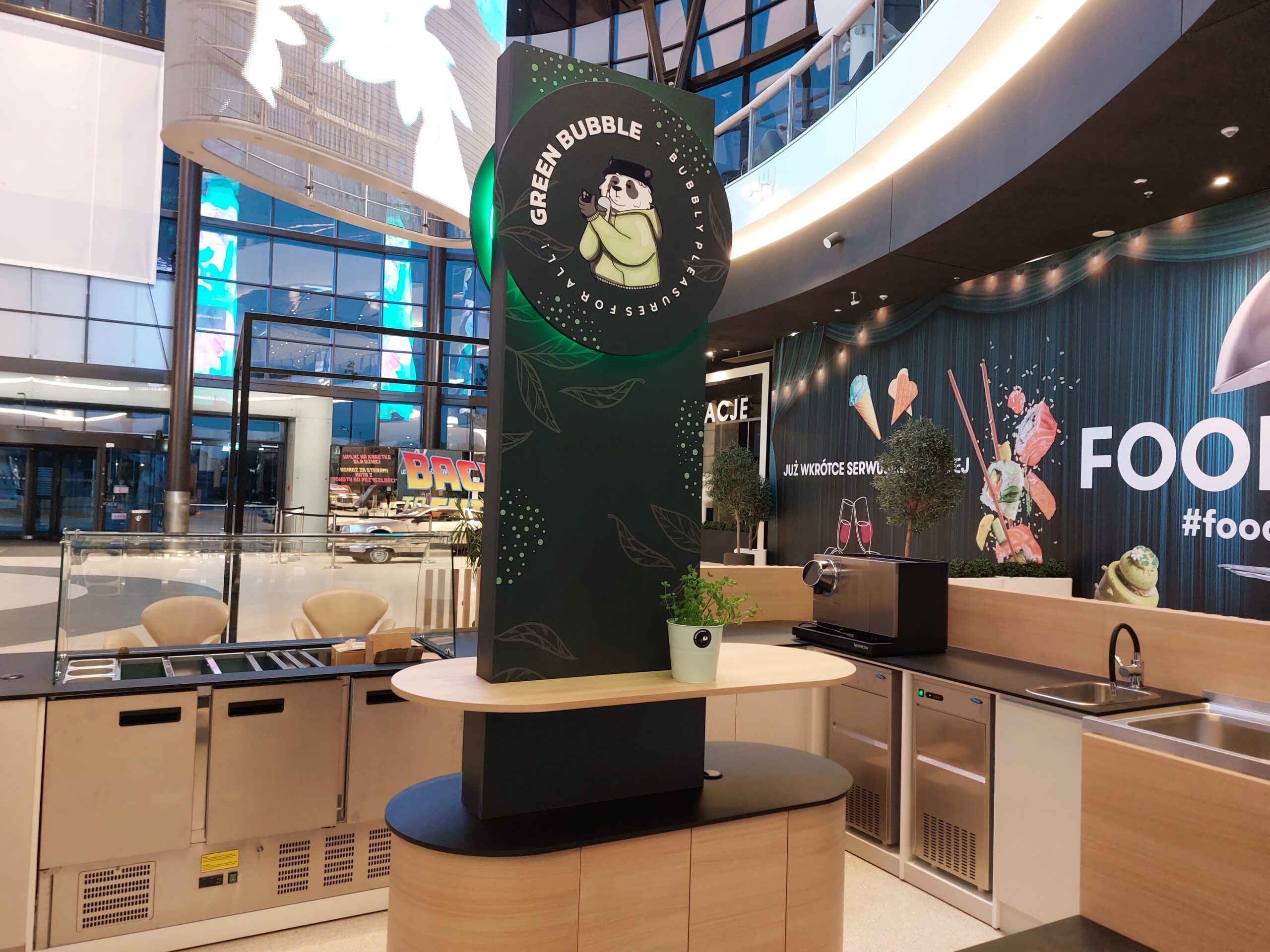 Stoisko Green Bubble to punkt gastronomiczny, zaprojektowany na planie prostokąta z dodatkową wyspą / totemem wewnątrz.. Wymiary wyspy to 5 x 4 m. Taka powierzchnia pozwala na wygodną produkcję, przygotowanie produktów do sprzedaży oraz obsługę klientów. Ciemne blaty są wykonane z cienkiej płyty HPL kompakt, są bardzo wytrzymałe i wręcz idealne dla gastronomii – łatwe w utrzymaniu czystości, odporne na zarysowania i odporne na wodę.