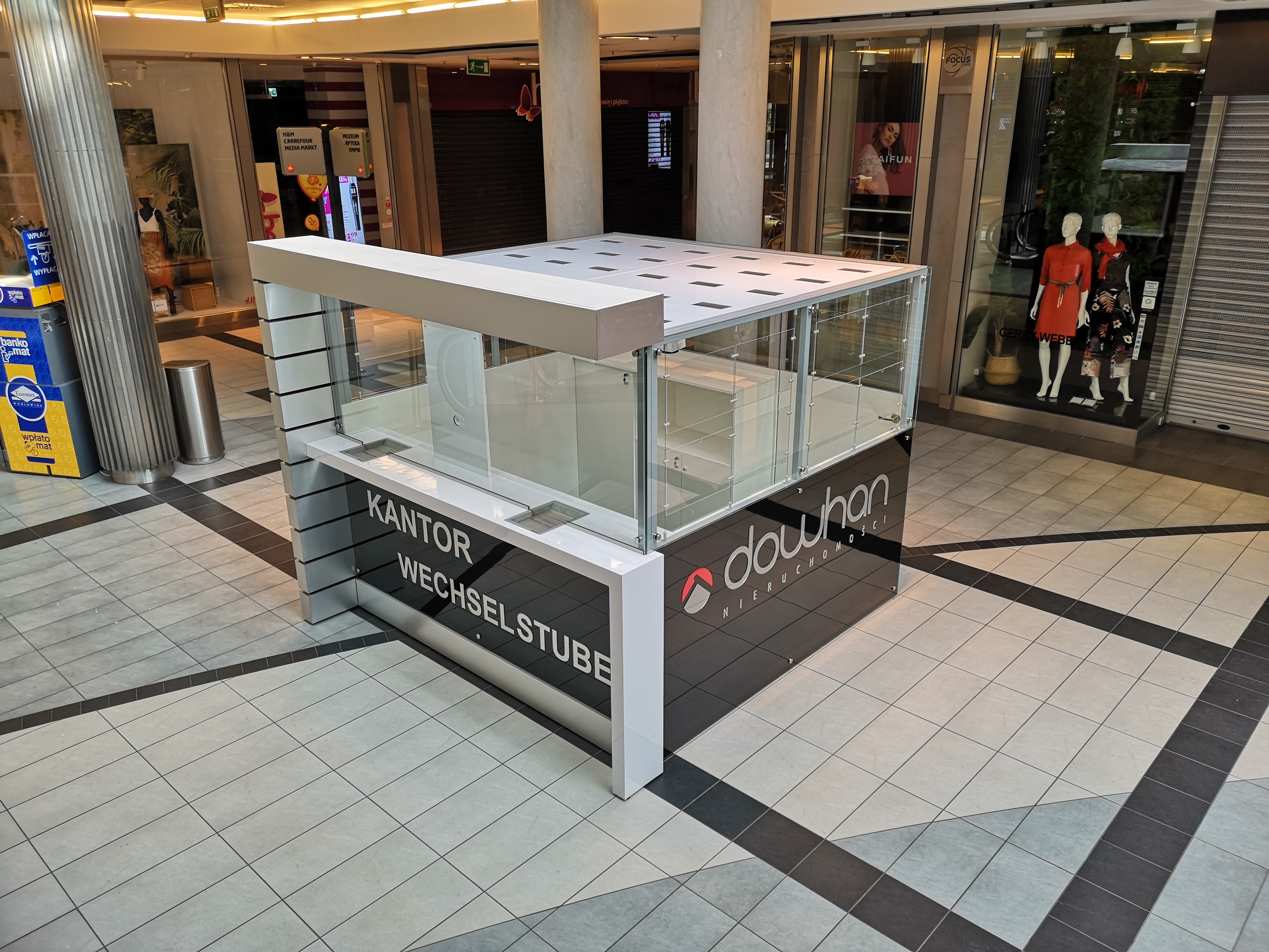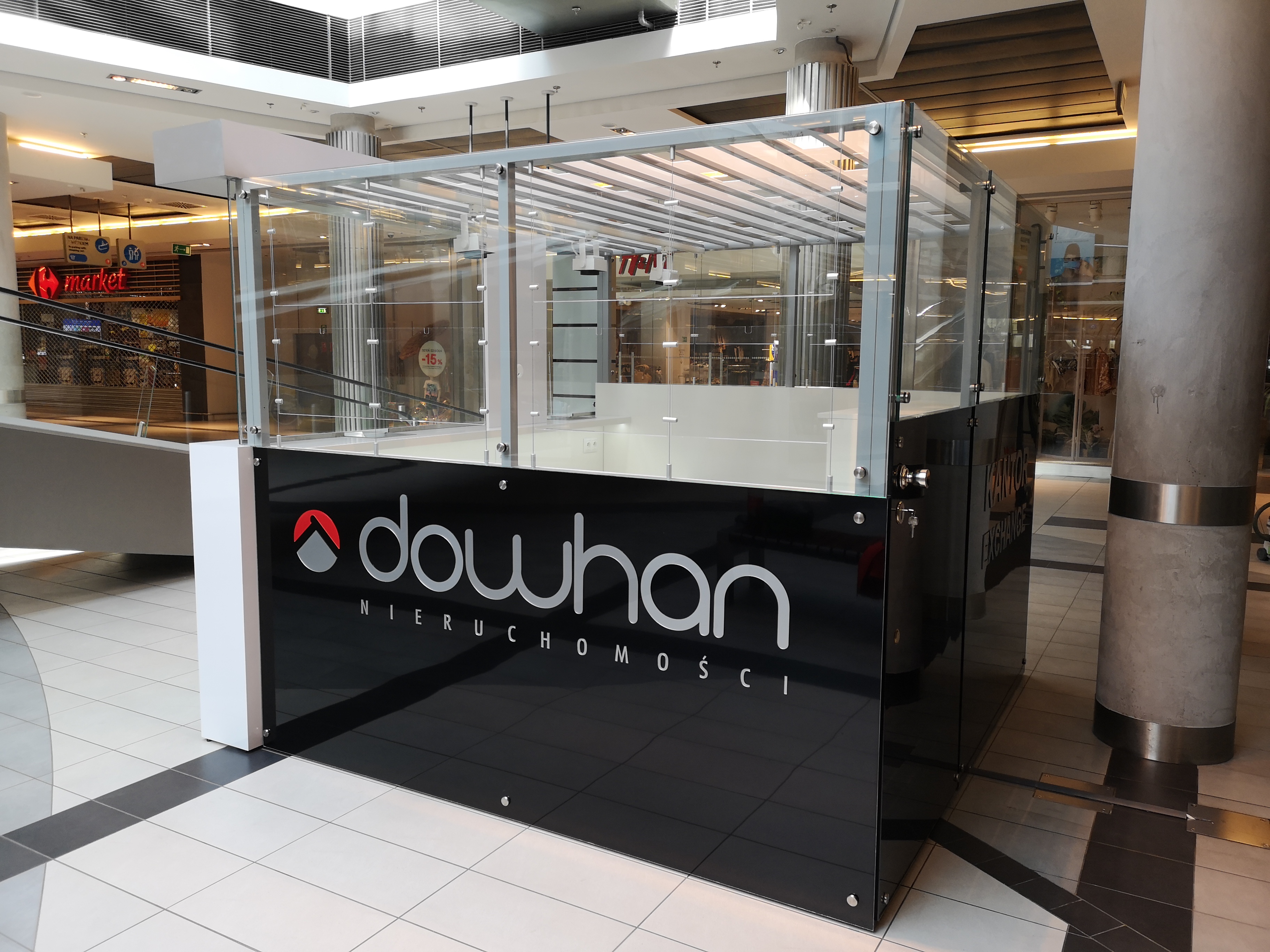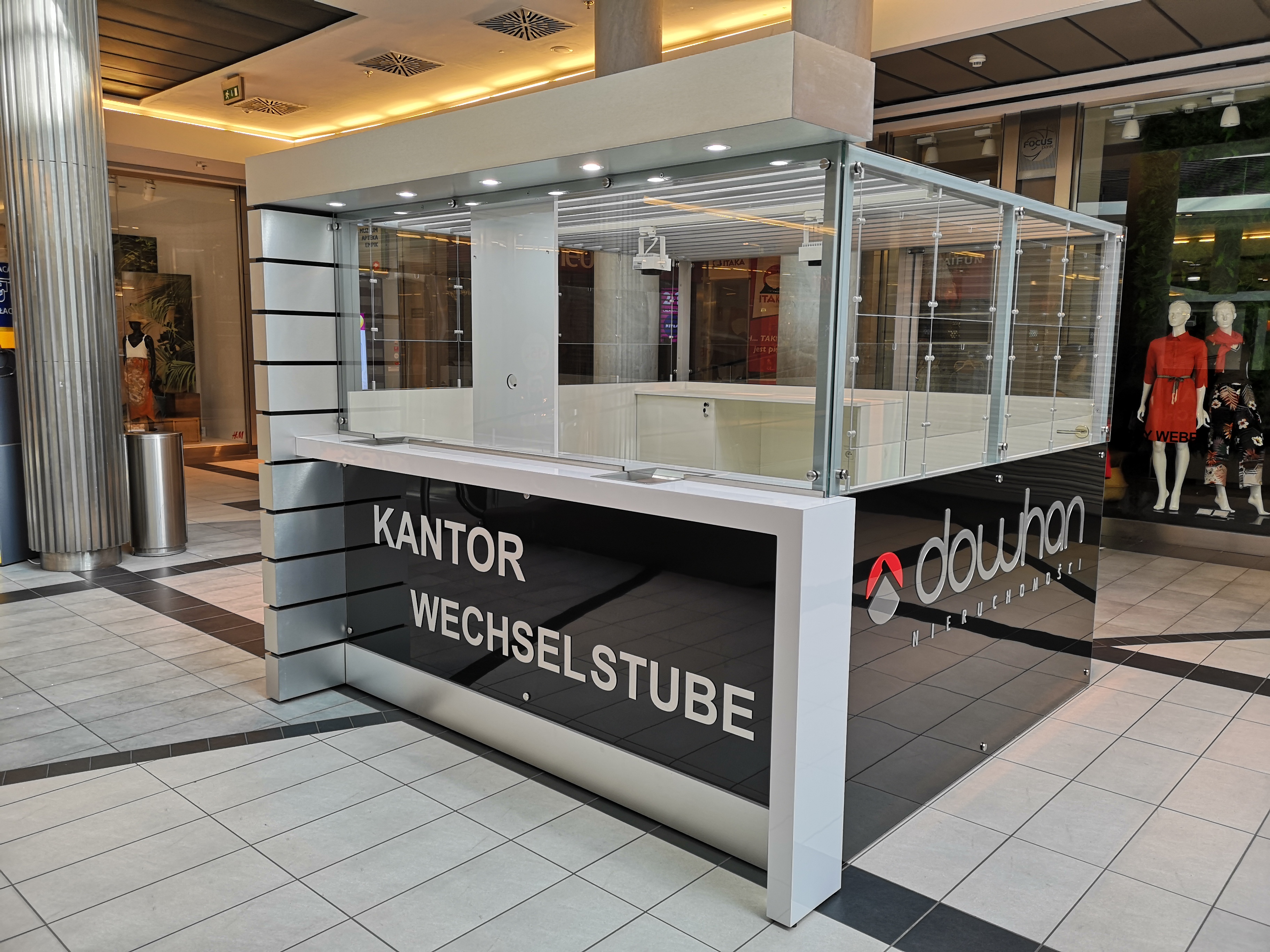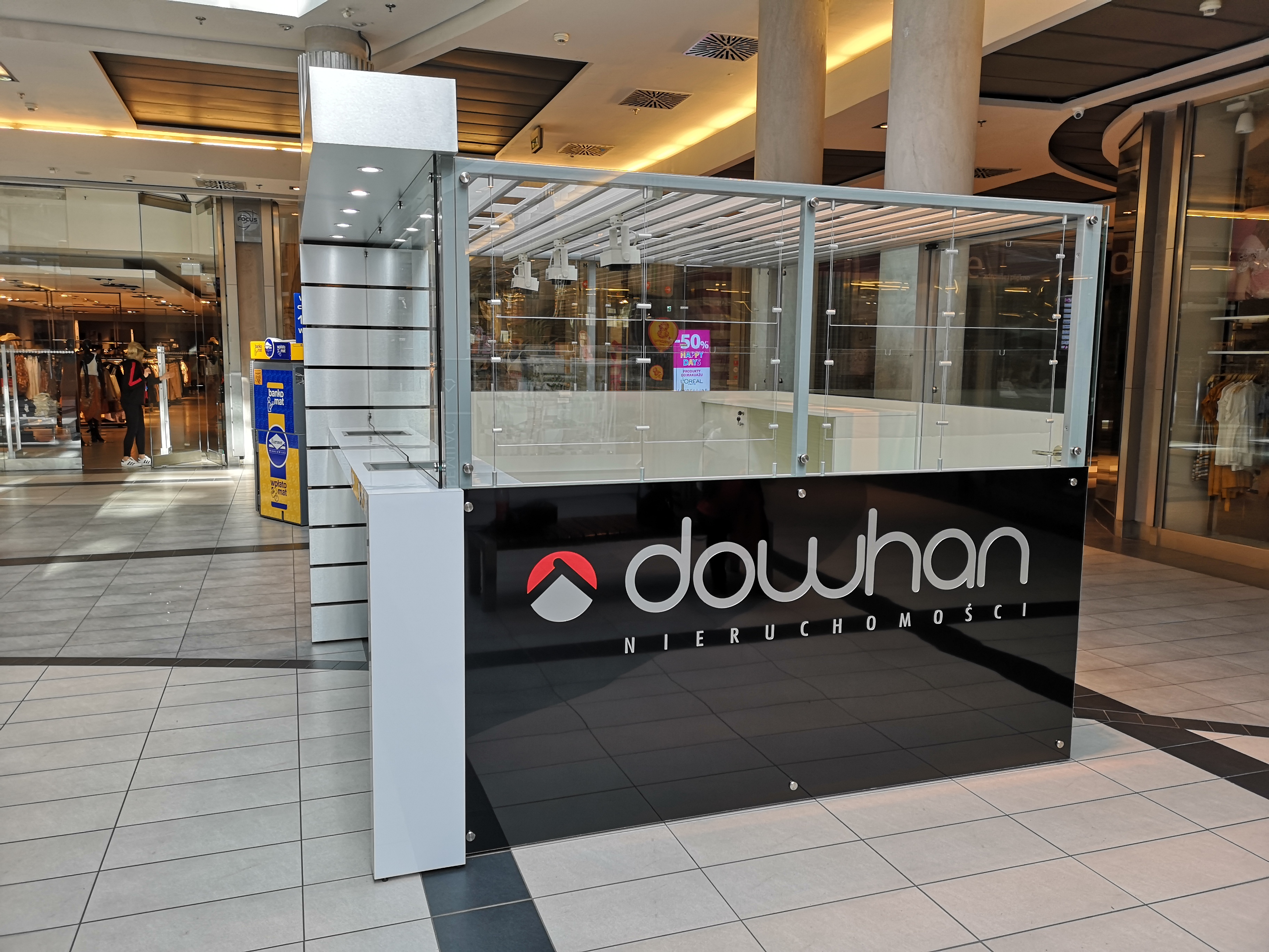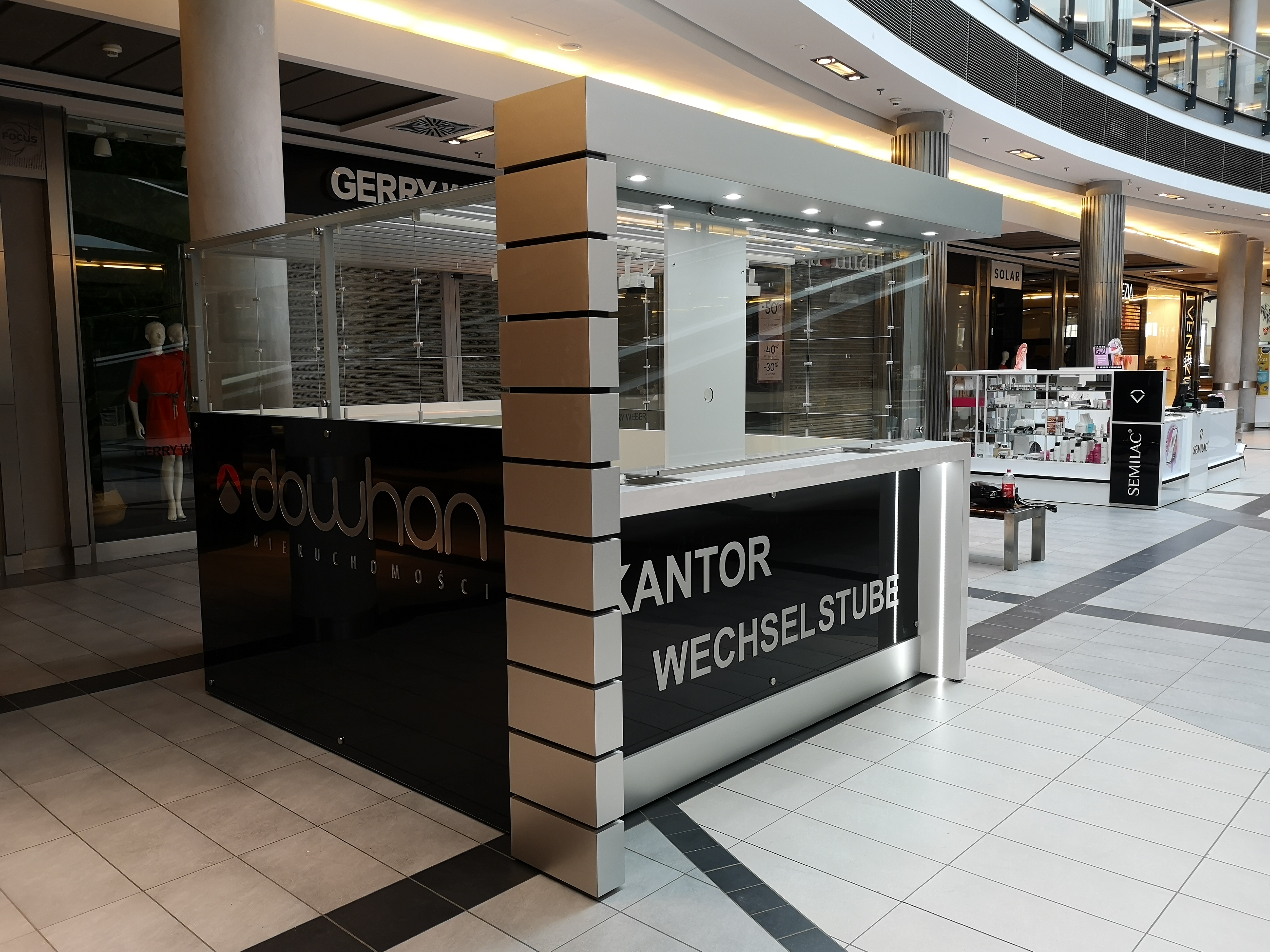 Oto nasza kolejna realizacja stoiska usługowego typu kantor. Stoisko zostało postawione na przełomie maja i czerwca 2019 roku w Centrum Handlowym Focus Mall w Zielonej Górze. Stoisko Dowhan Nieruchomości o powierzchni około 10 m2 spełnia rolę kantoru wymiany walut oraz agencji nieruchomości.