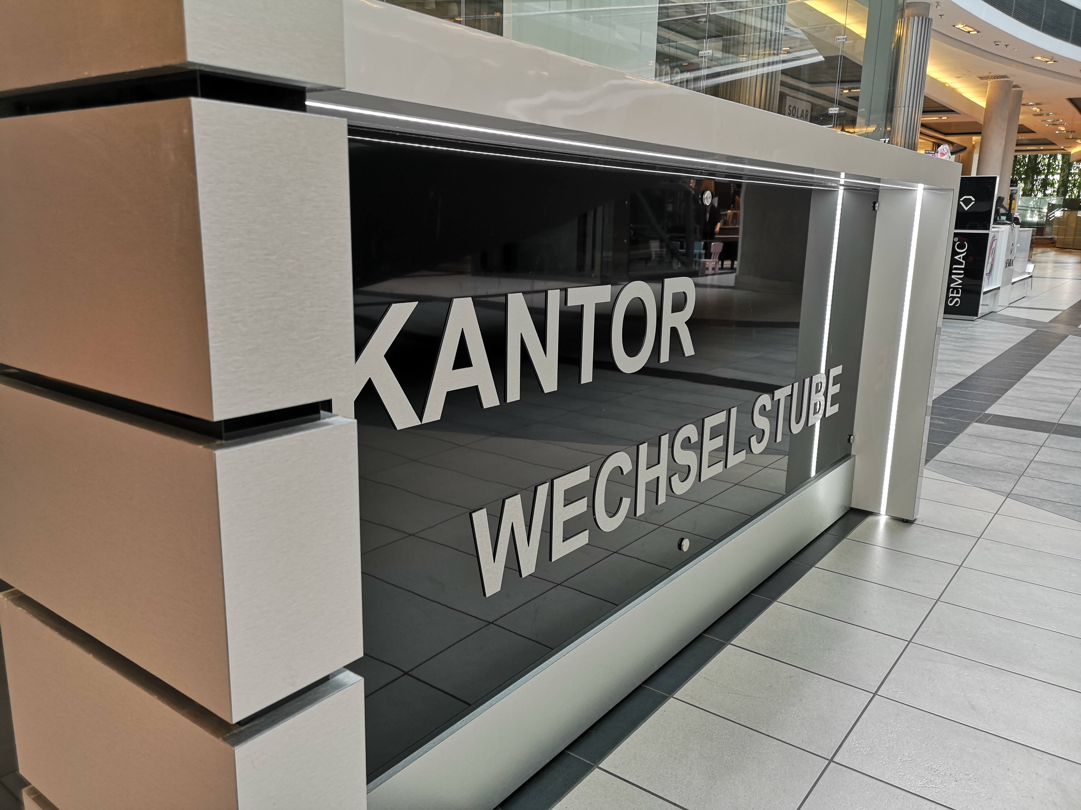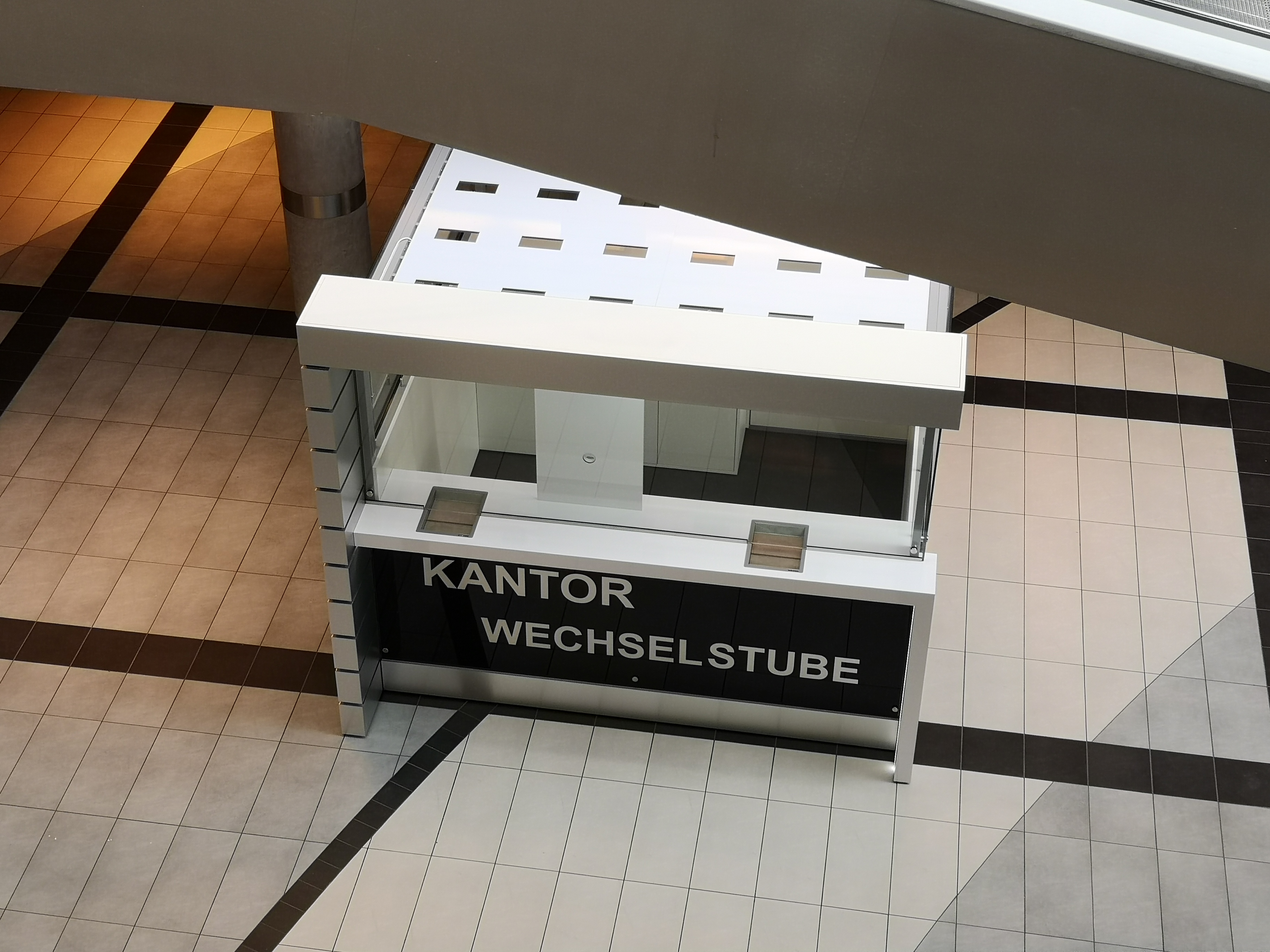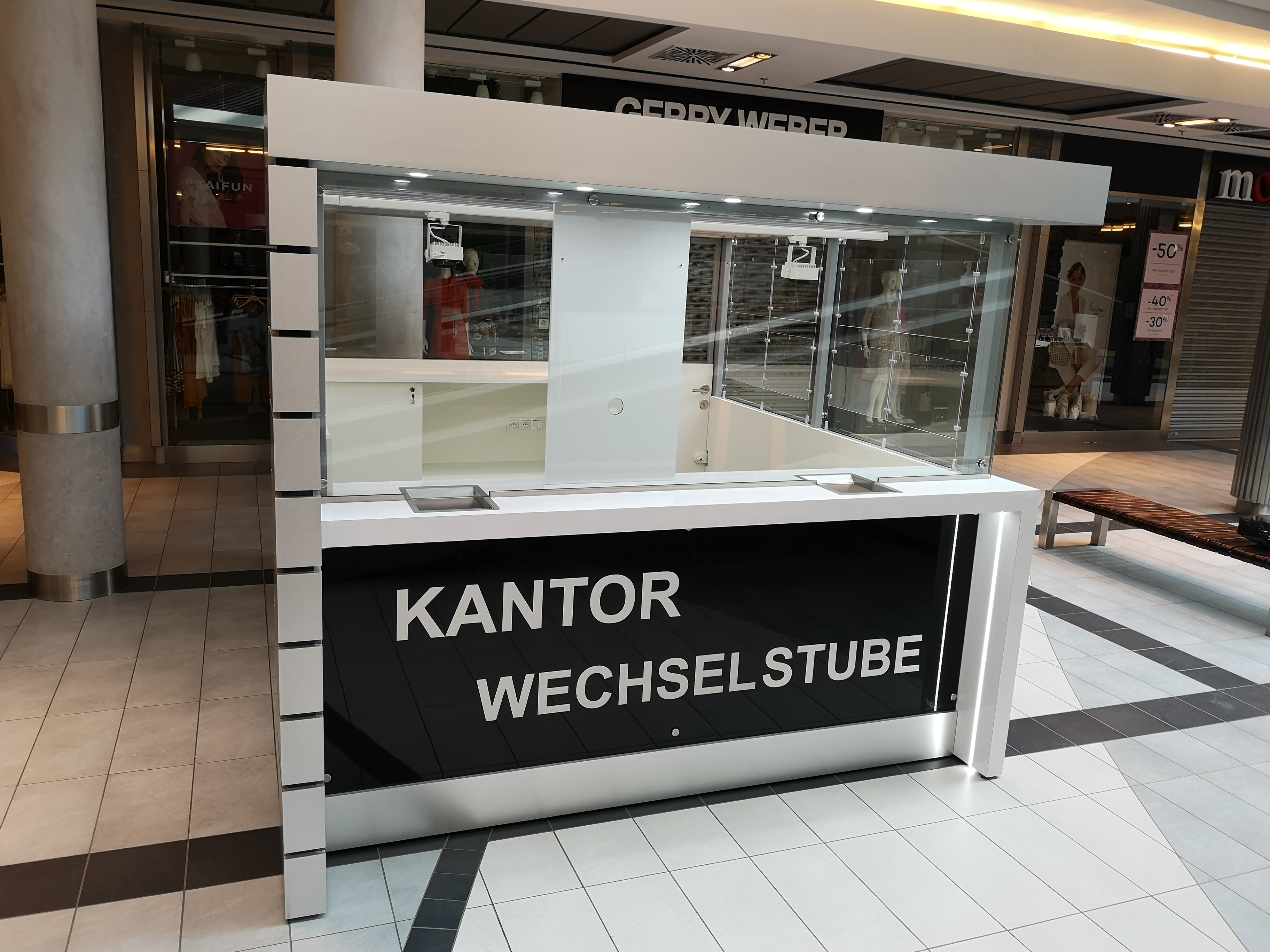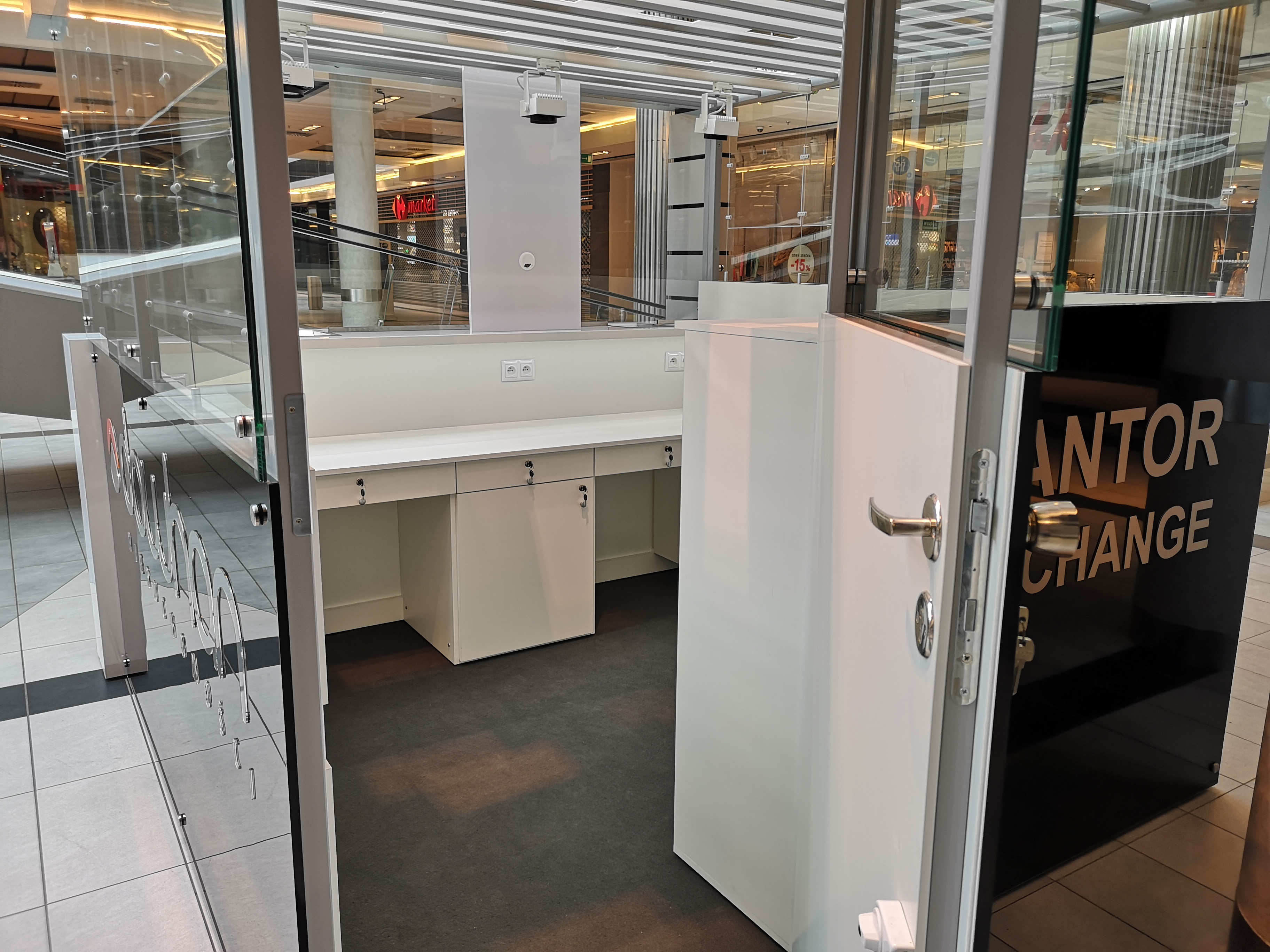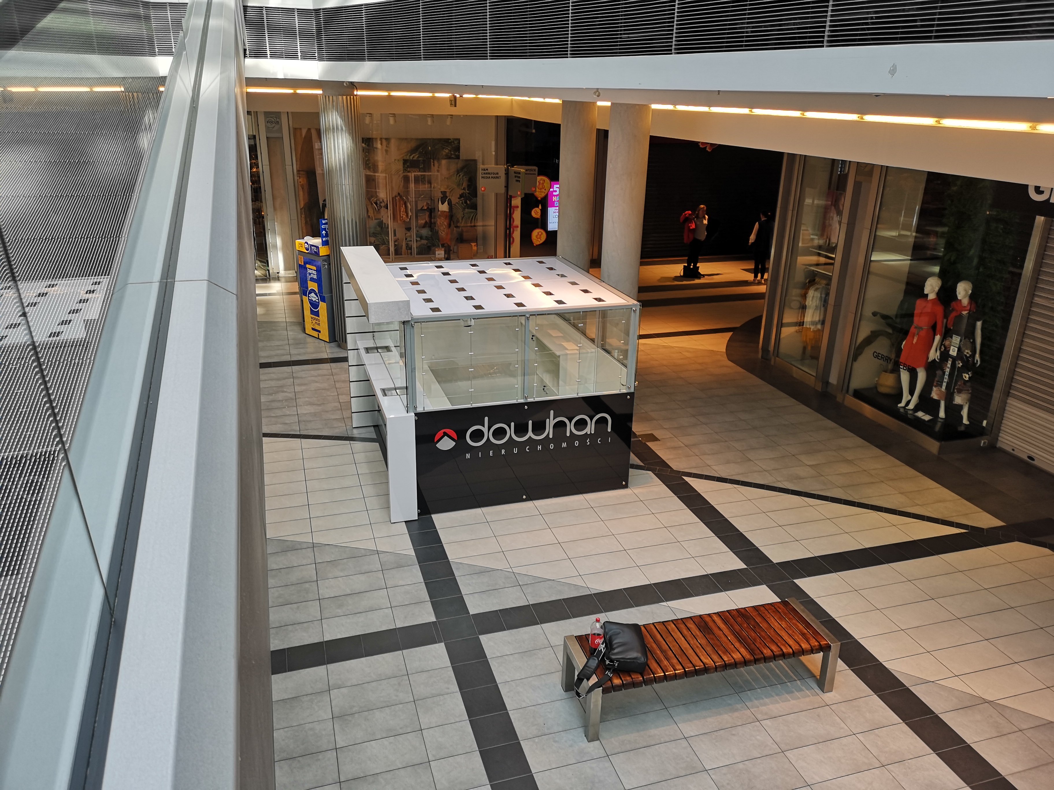 Oto nasza kolejna realizacja stoiska usługowego typu kantor. Stoisko zostało postawione na przełomie maja i czerwca 2019 roku w Centrum Handlowym Focus Mall w Zielonej Górze. Stoisko Dowhan Nieruchomości o powierzchni około 10 m2 spełnia rolę kantoru wymiany walut oraz agencji nieruchomości.