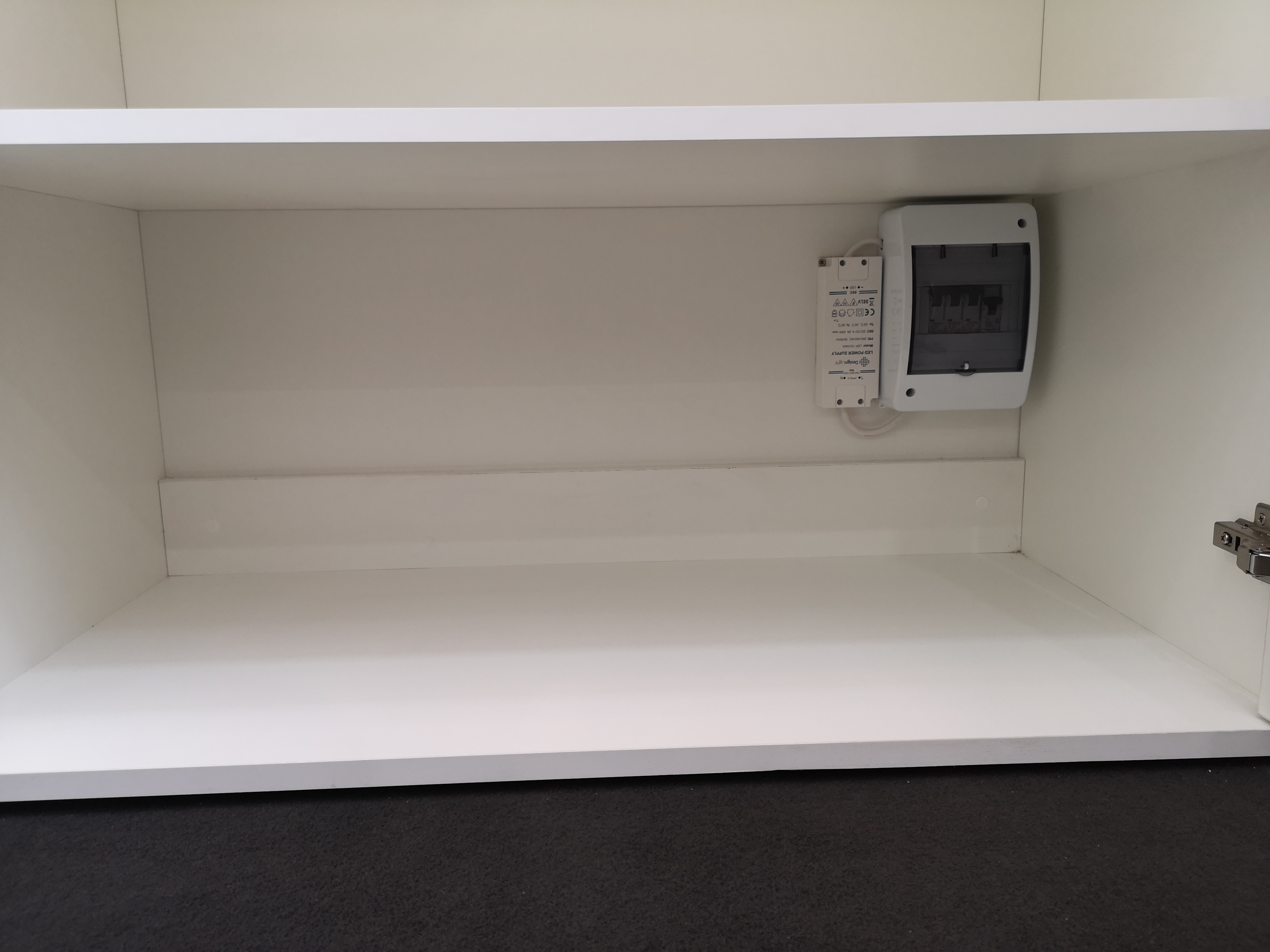 Podłączenie elektryczne do przyłącza dostarczonego przez galerię zostało przez nas podzielone na obwody – ogólny, komputerowy, oświetleniowy, a każdy obwód odpowiednio zabezpieczony w tablicy rozdzielczej wewnątrz stoiska.