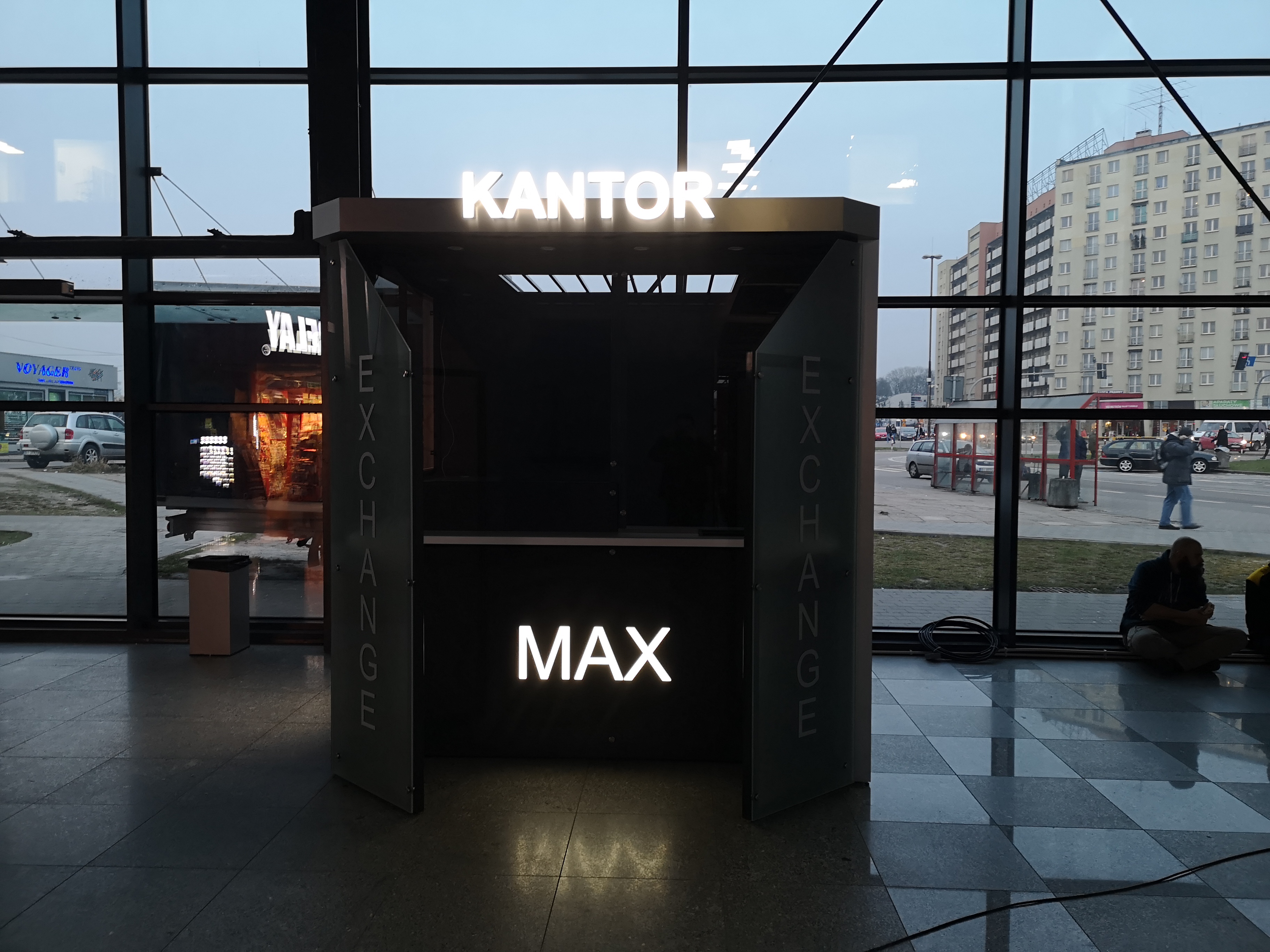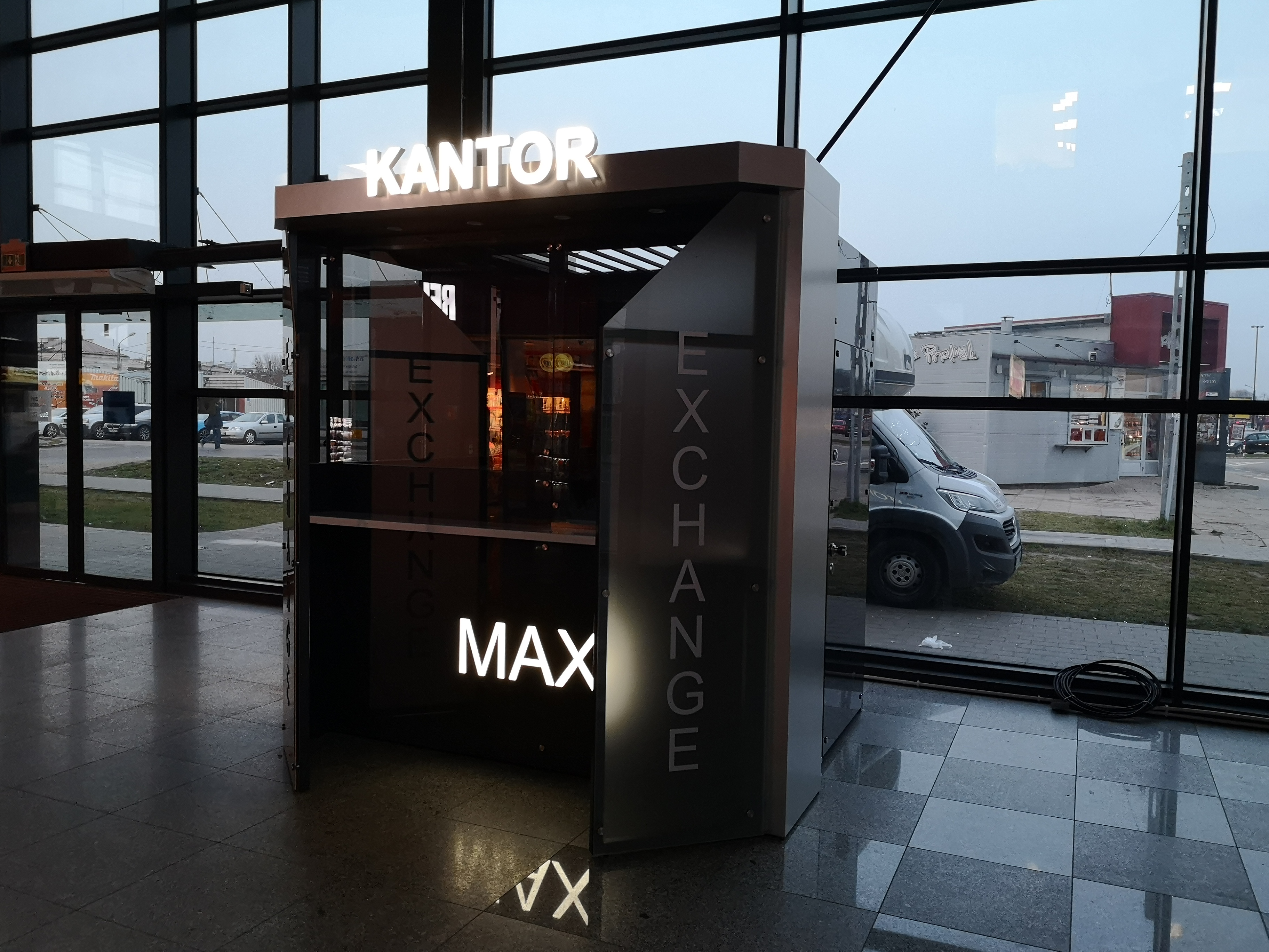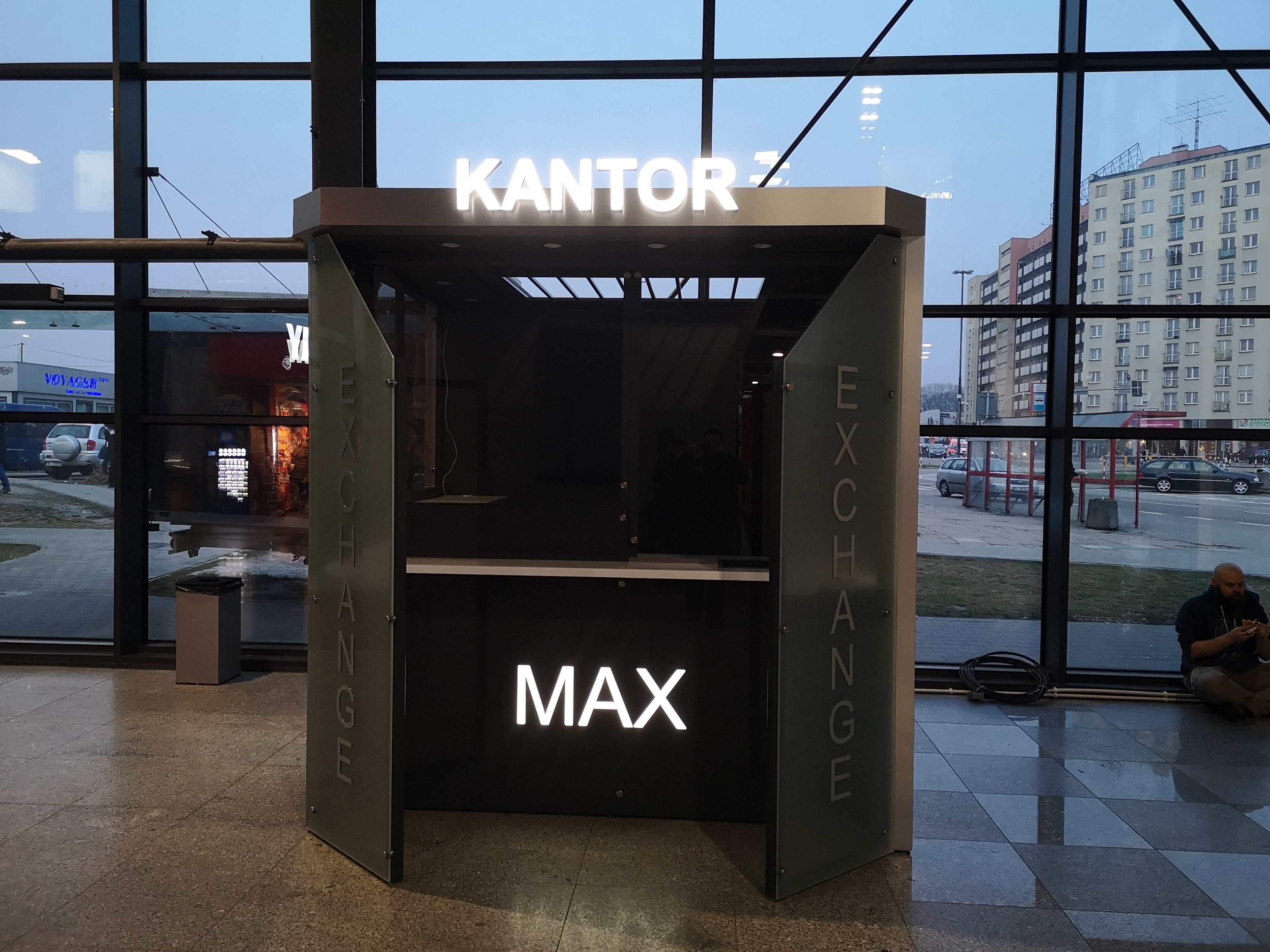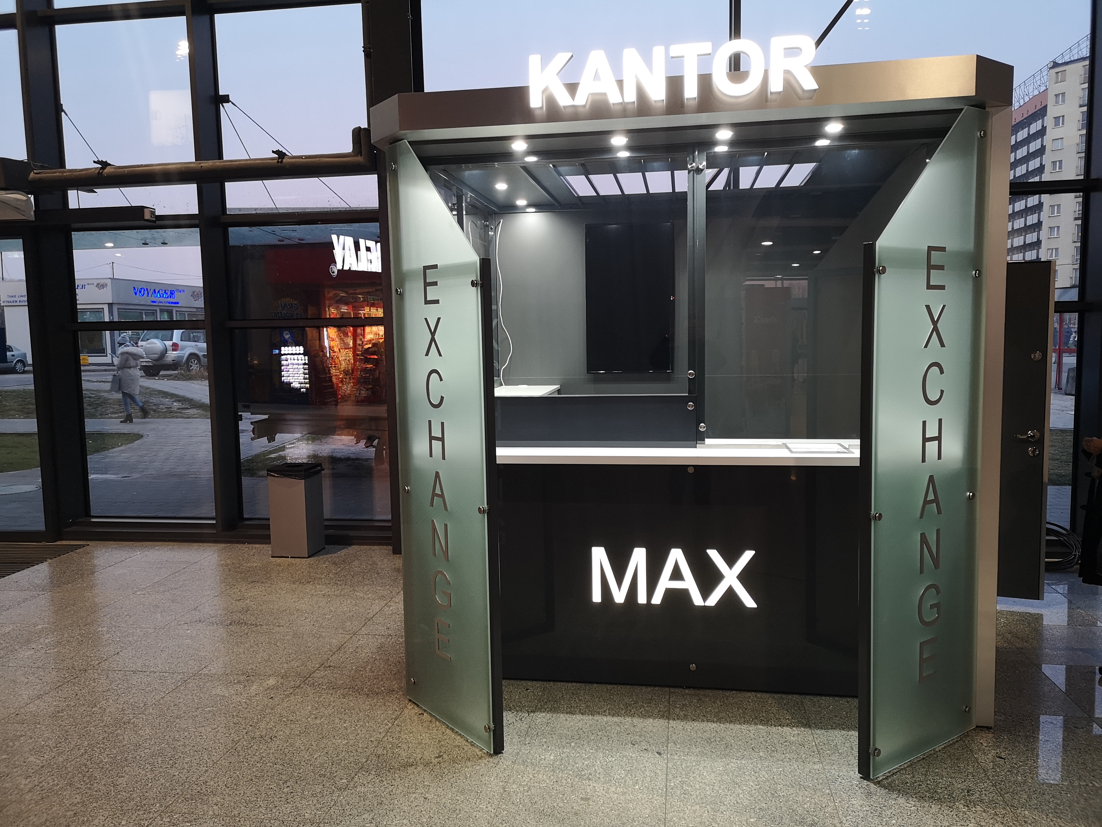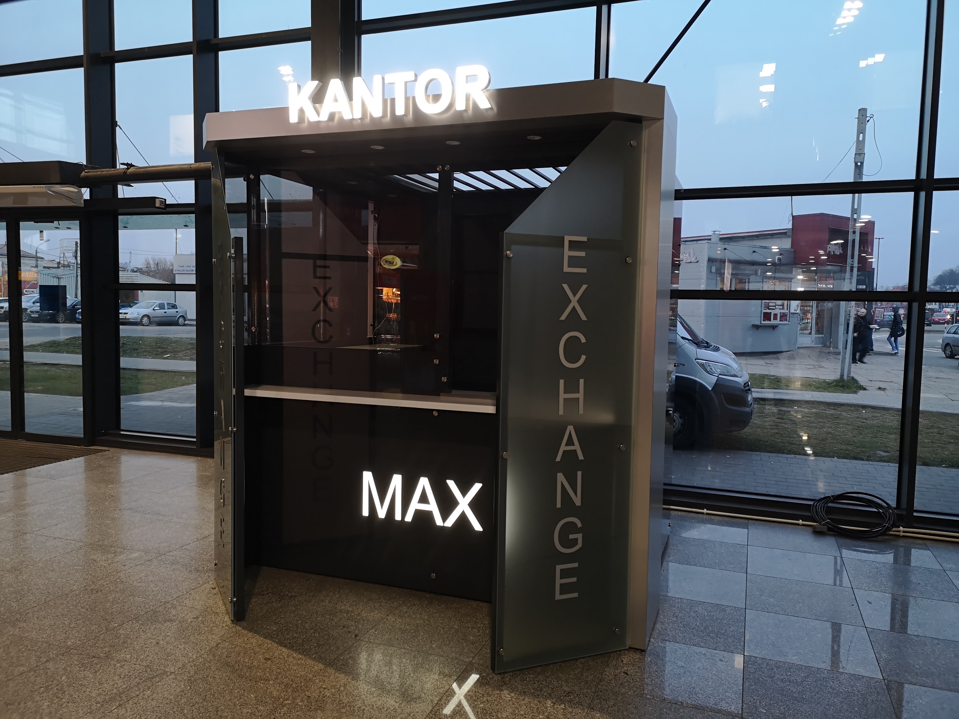 Prezentujemy Państwu stoisko handlowo-usługowe typu kantor przygotowanego dla naszego klienta, Kantor MAX. Jest to wolnostojący shop-in-shop wystawiony w przestrzeni ogólnodostępnej dworca PKS Nova w Białystoku. Powierzchnia całkowita to około 7,5 m2, przy wymiarach stoiska 270x270cm i wysokości 270 cm. Stoisko zostało przez nas zaprojektowane pod kątem wykonawczym. Zapewniliśmy uzgodnienia, kontakt z Galerią, projekty branżowe i pomiary oraz kompletną dokumentację powykonawczą.