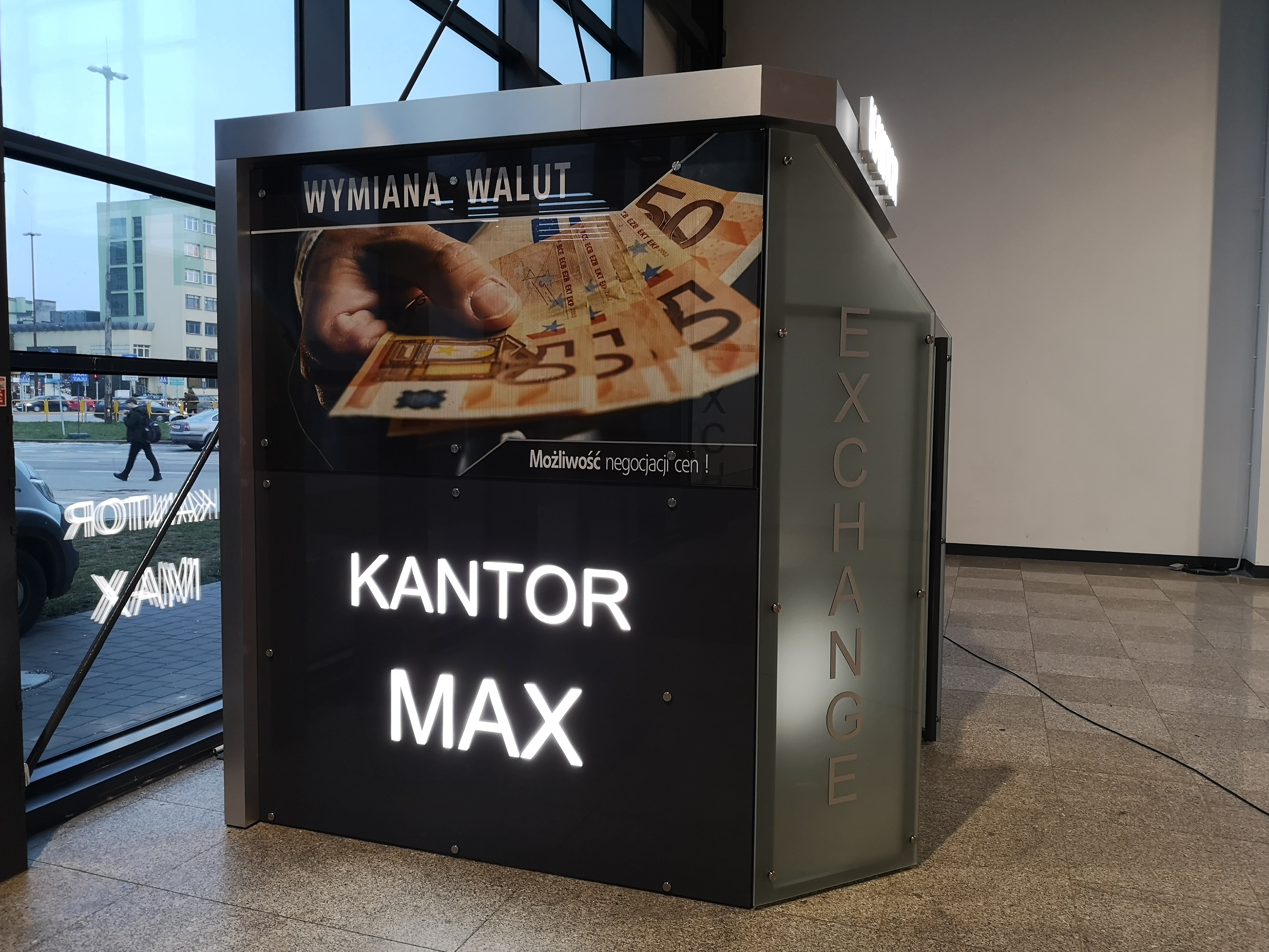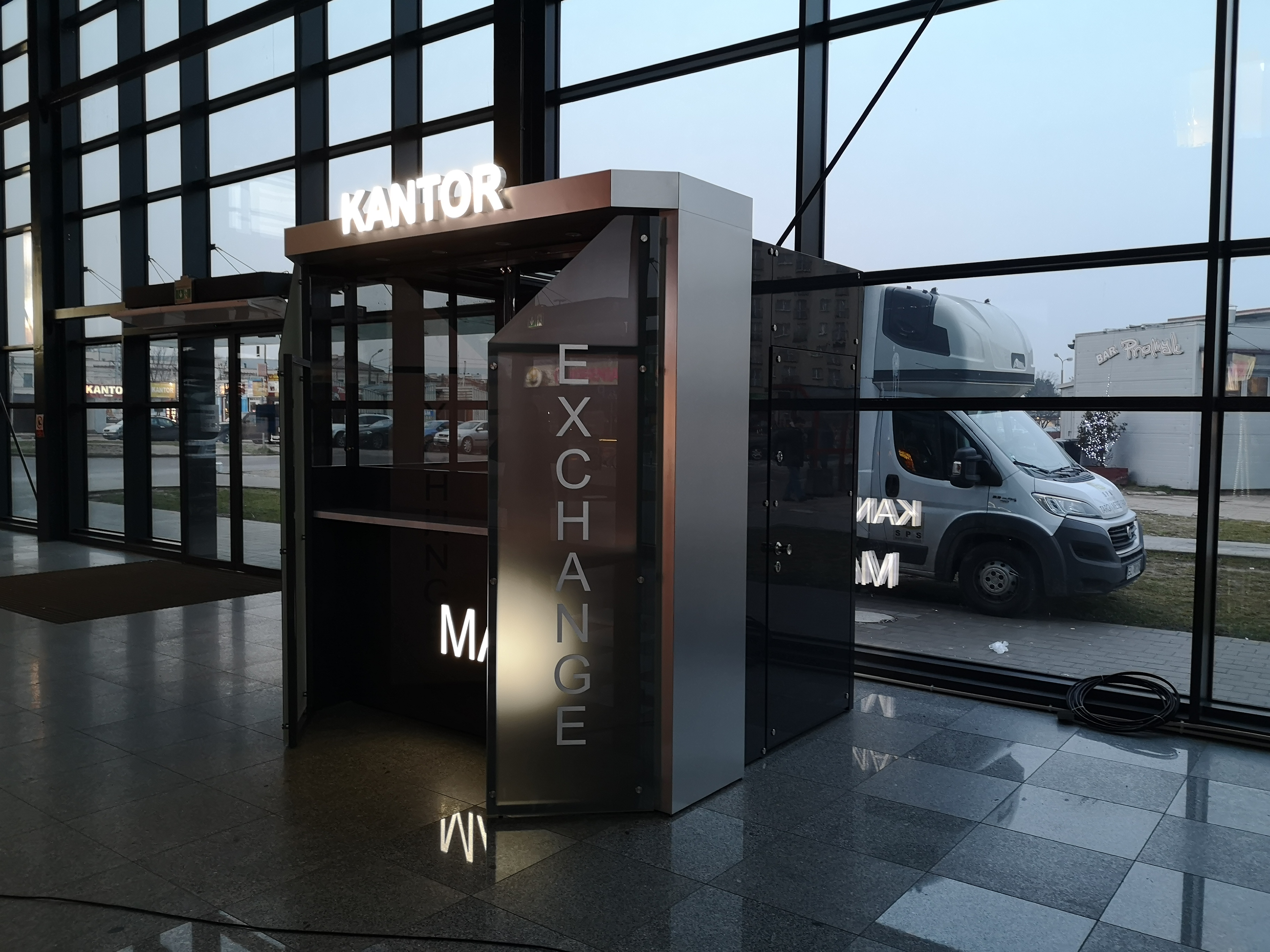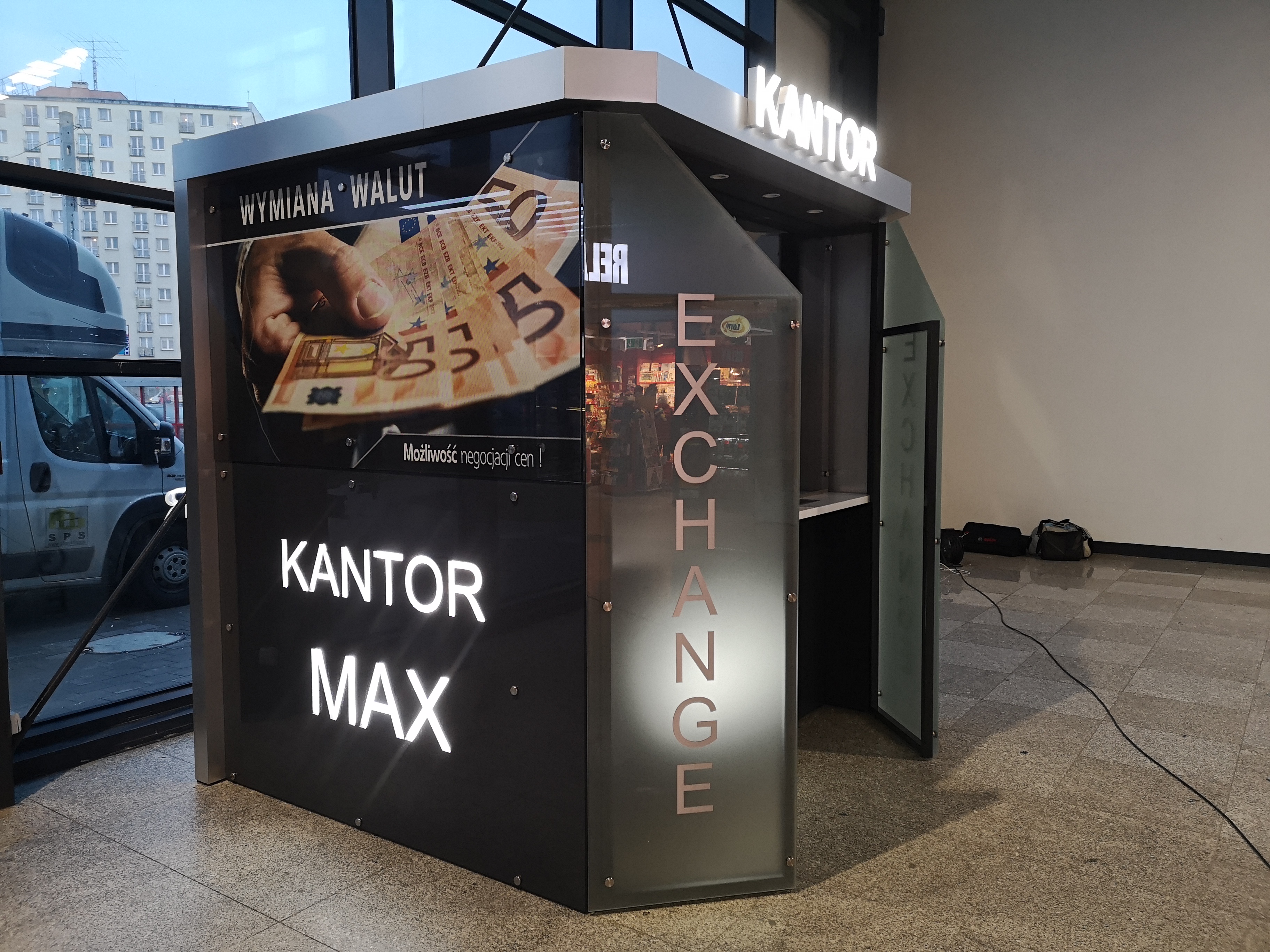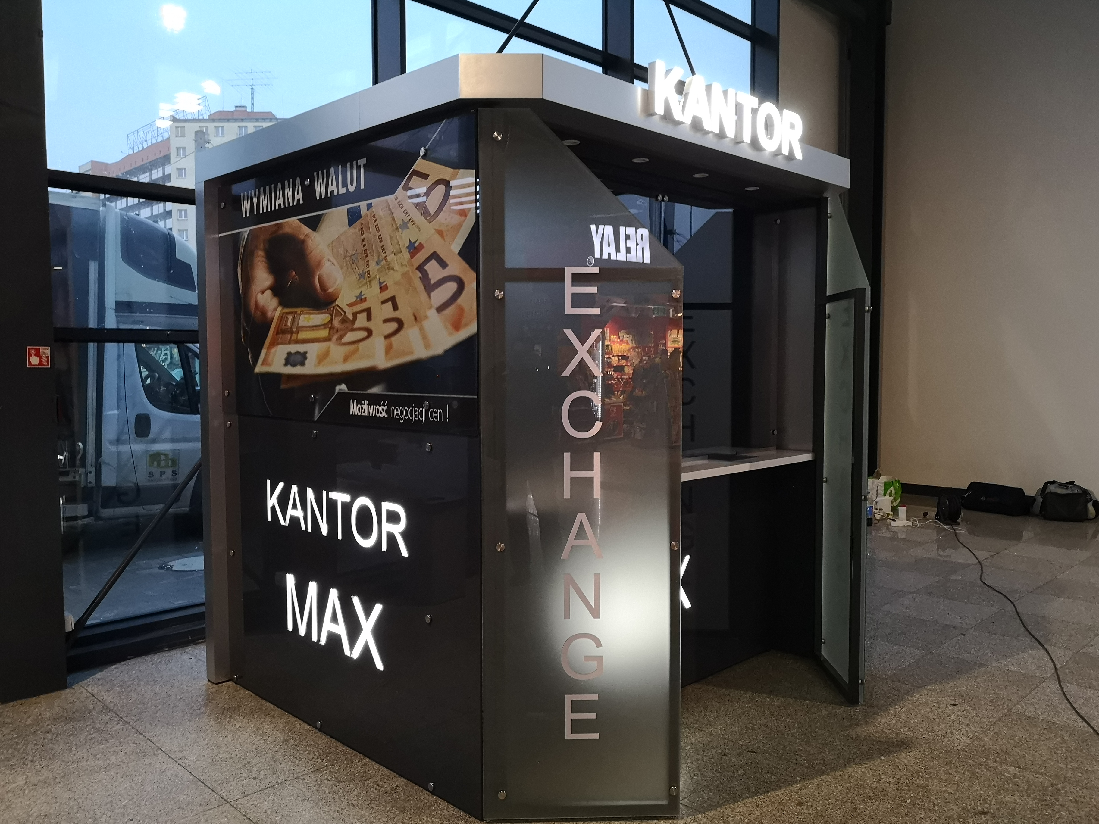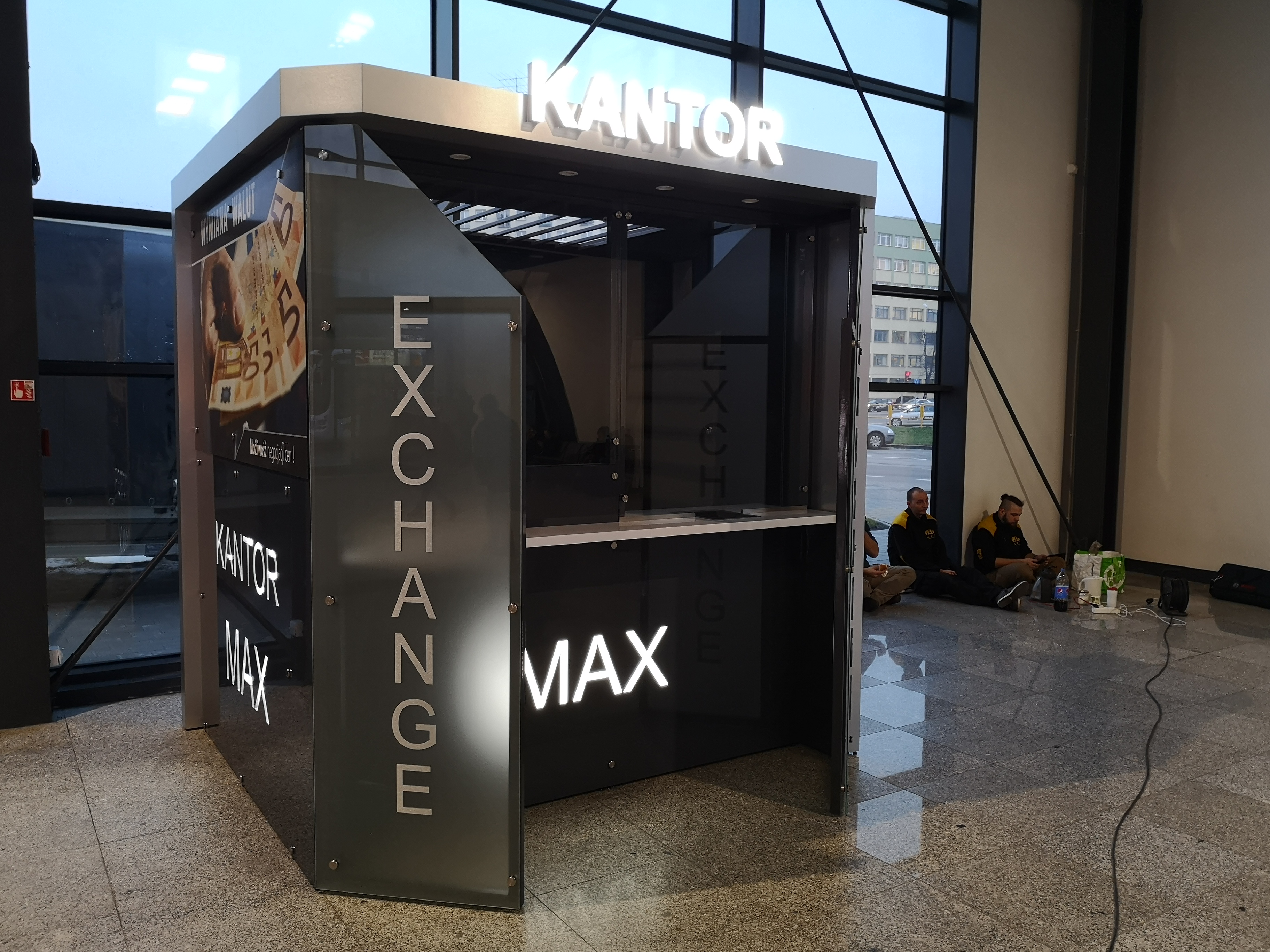 Prezentujemy Państwu stoisko handlowo-usługowe typu kantor przygotowanego dla naszego klienta, Kantor MAX. Jest to wolnostojący shop-in-shop wystawiony w przestrzeni ogólnodostępnej dworca PKS Nova w Białystoku. Powierzchnia całkowita to około 7,5 m2, przy wymiarach stoiska 270x270cm i wysokości 270 cm. Stoisko zostało przez nas zaprojektowane pod kątem wykonawczym. Zapewniliśmy uzgodnienia, kontakt z Galerią, projekty branżowe i pomiary oraz kompletną dokumentację powykonawczą.