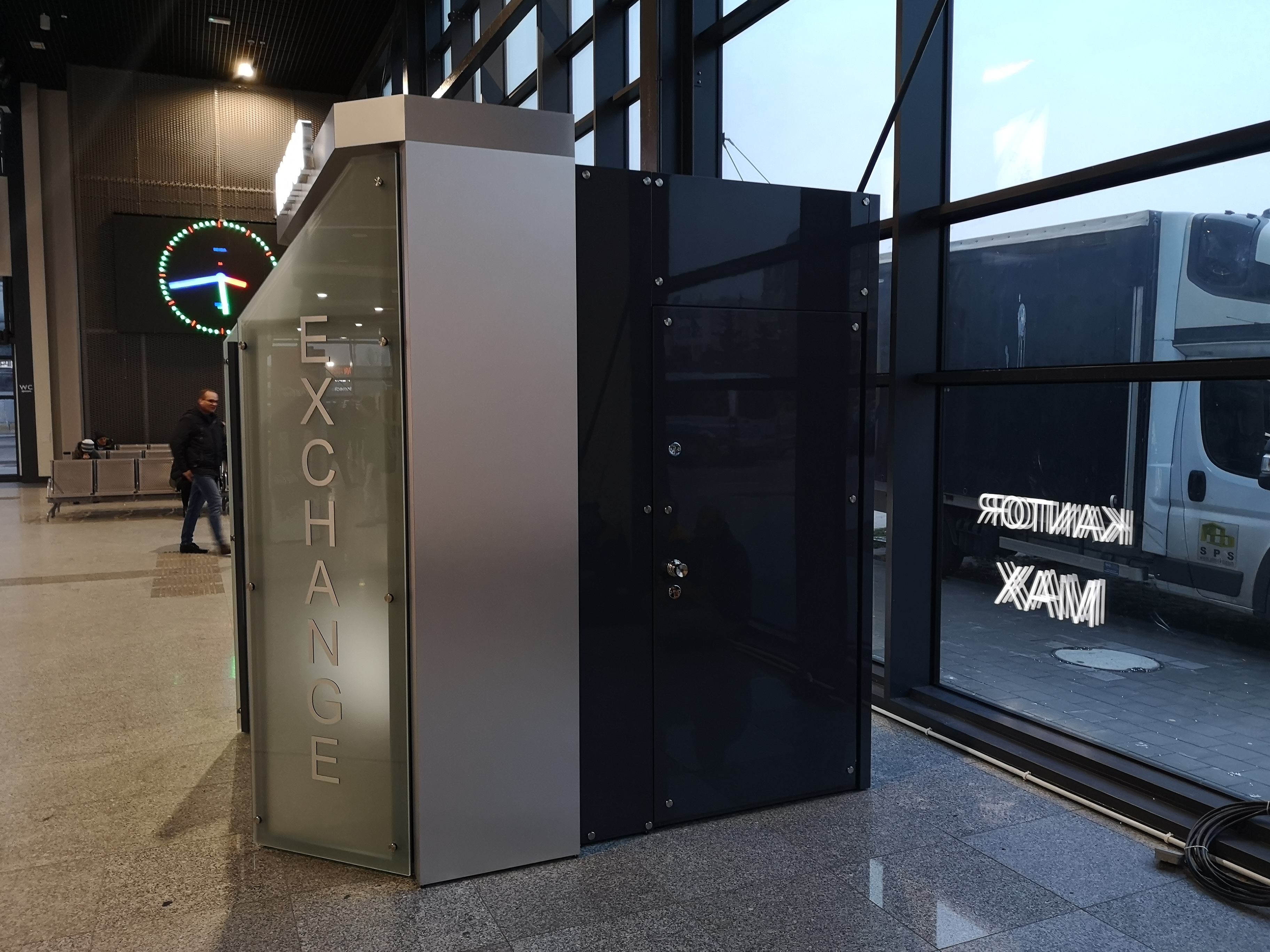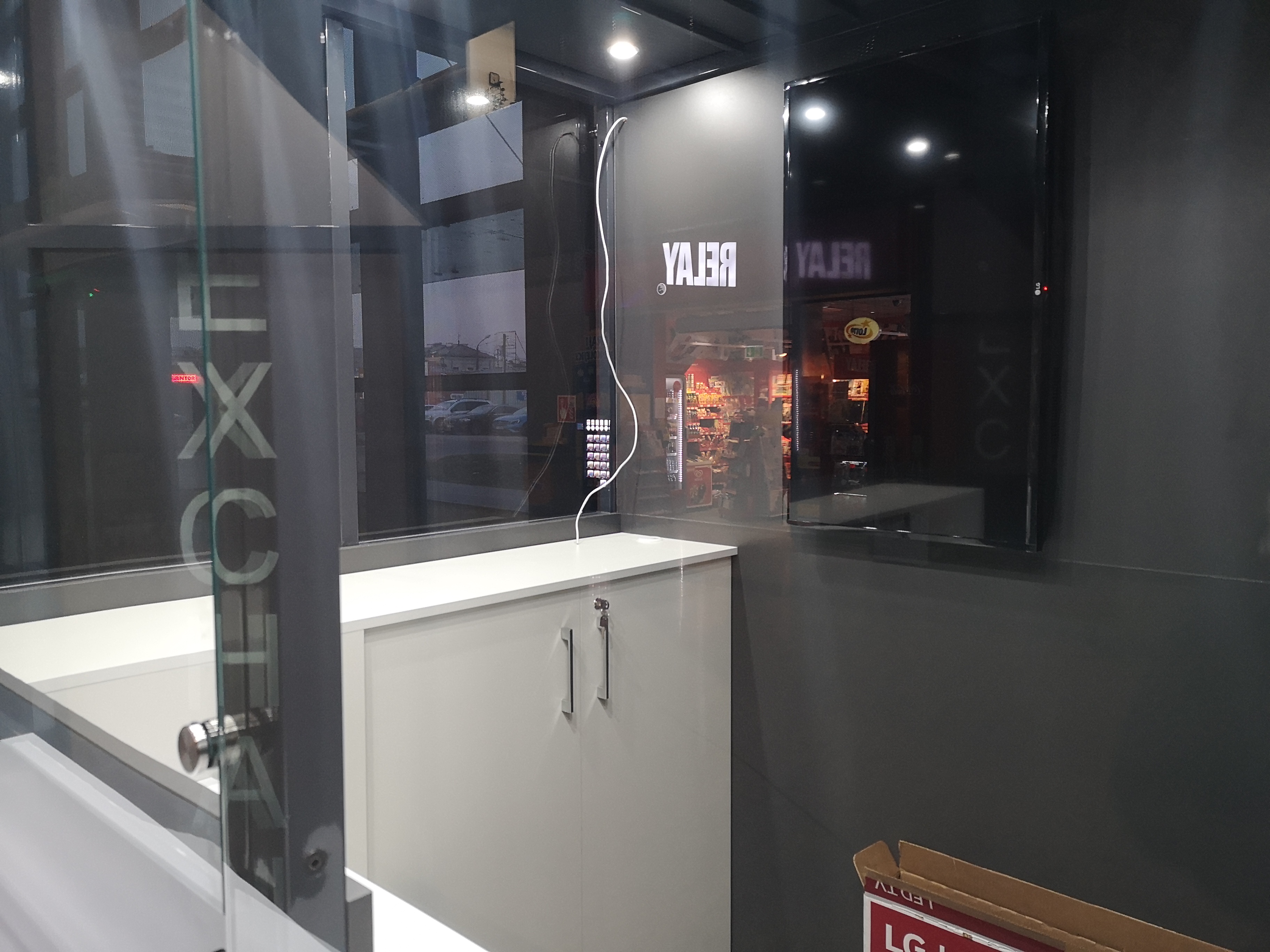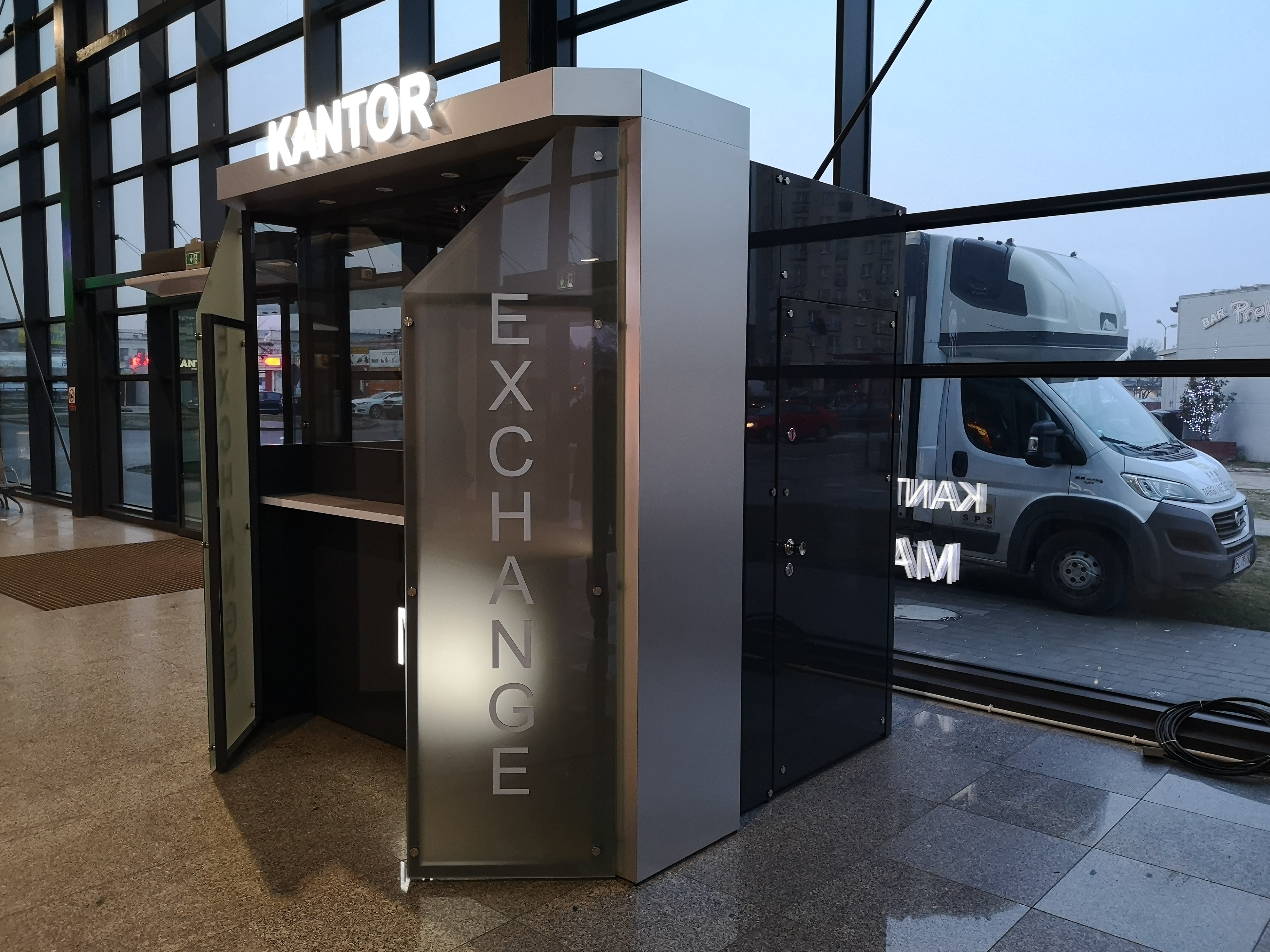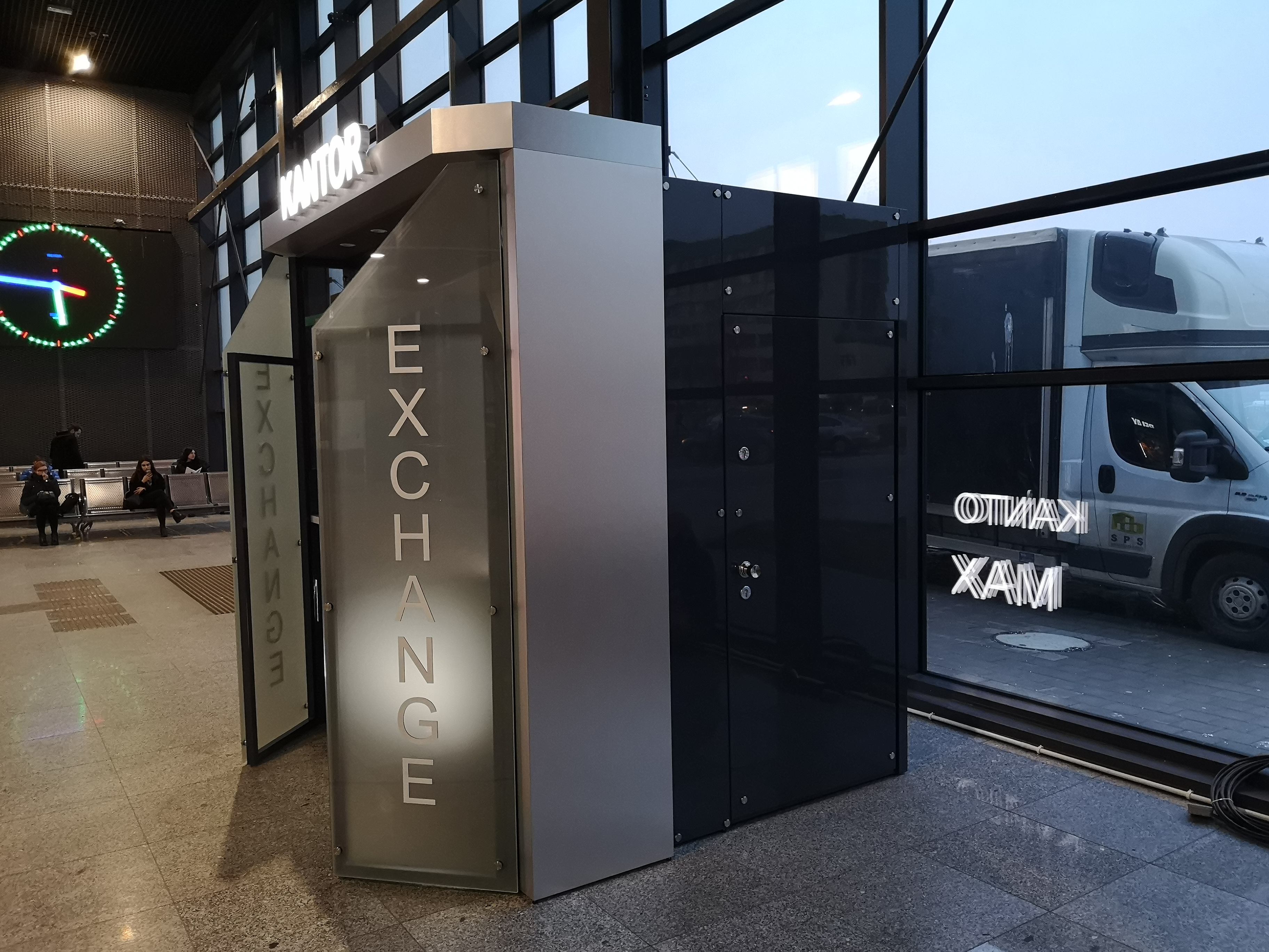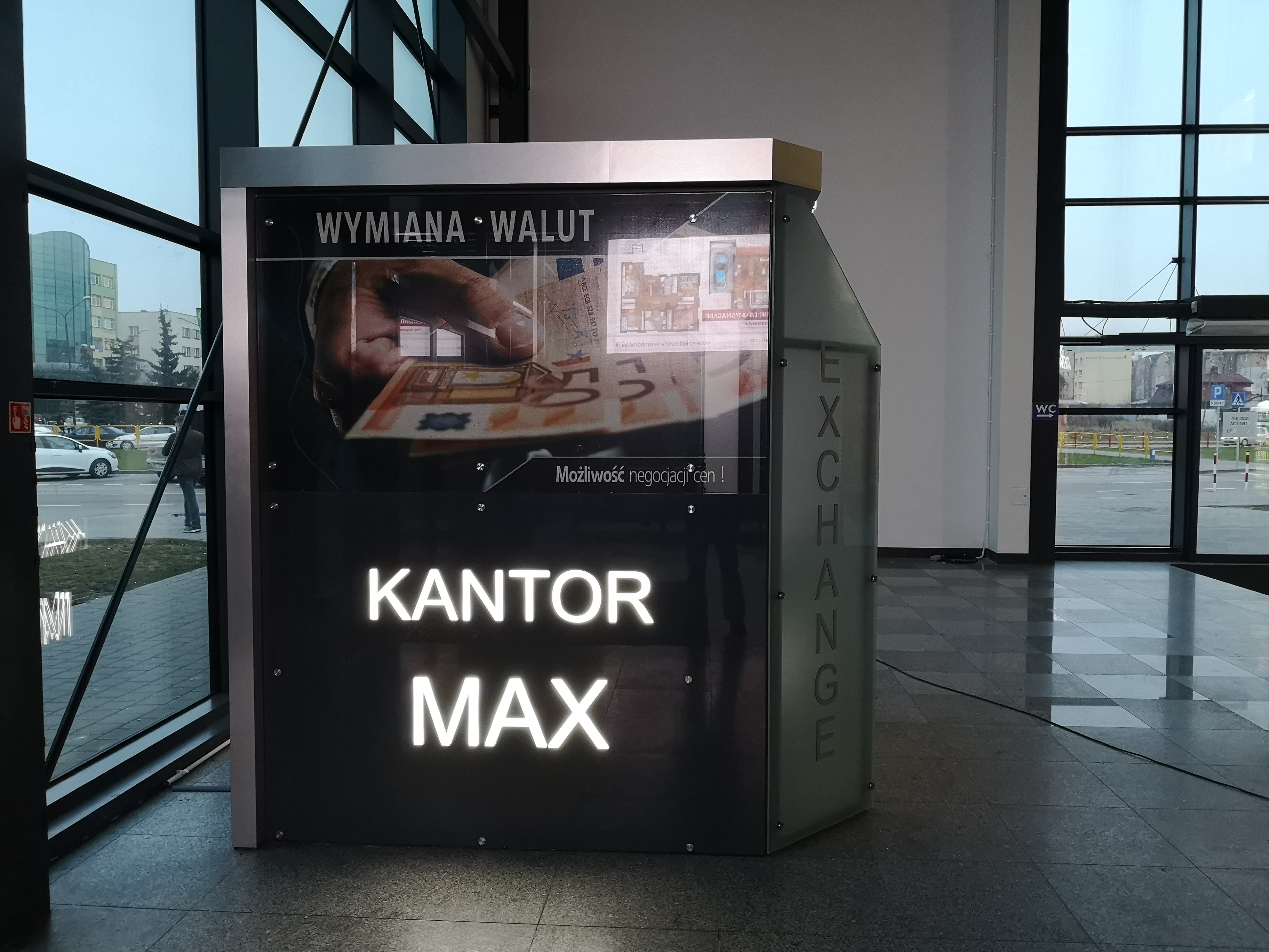 Prezentujemy Państwu stoisko handlowo-usługowe typu kantor przygotowanego dla naszego klienta, Kantor MAX. Jest to wolnostojący shop-in-shop wystawiony w przestrzeni ogólnodostępnej dworca PKS Nova w Białystoku. Powierzchnia całkowita to około 7,5 m2, przy wymiarach stoiska 270x270cm i wysokości 270 cm. Stoisko zostało przez nas zaprojektowane pod kątem wykonawczym. Zapewniliśmy uzgodnienia, kontakt z Galerią, projekty branżowe i pomiary oraz kompletną dokumentację powykonawczą.