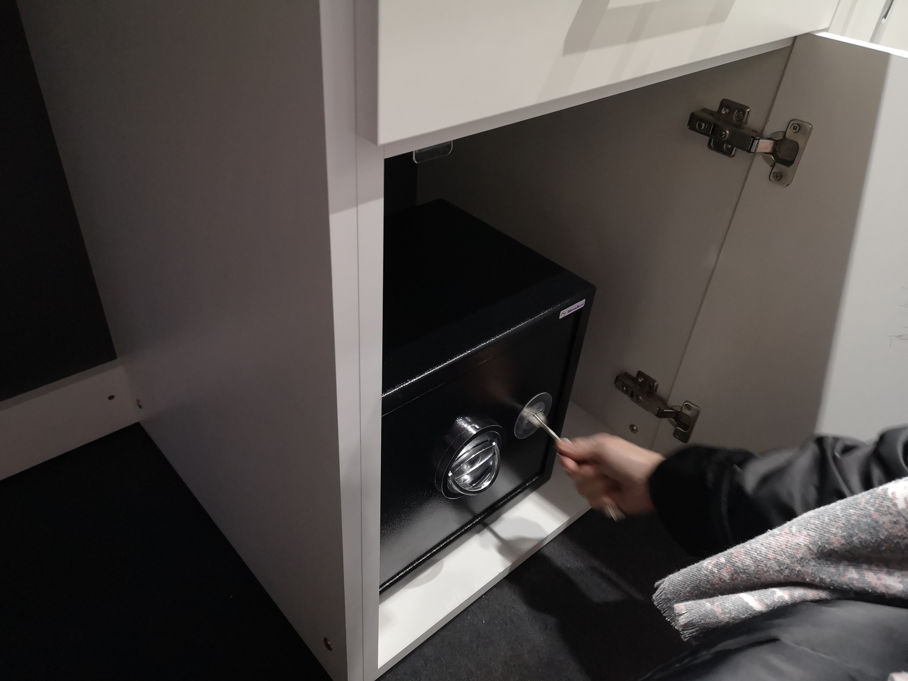 Wykończenie zewnętrzne stanowi płyta MDF trudno zapalna 18 mm lakierowana oraz laminat HPL na płycie wiórowej. Wewnętrzne zaś powstało z płyty szarej, gotowej laminowanej, trudno zapalnej. Meble wykonane z płyty białej trudno zapalnej Egger Flammex. Szklenia powstały w formie szkła 2x5mm hartowanego podwójnie laminowanego – 5/5/2. Całości dopełniają litery kasetonowe podświetlane oraz frezowany dibond + pleksi Opal.
