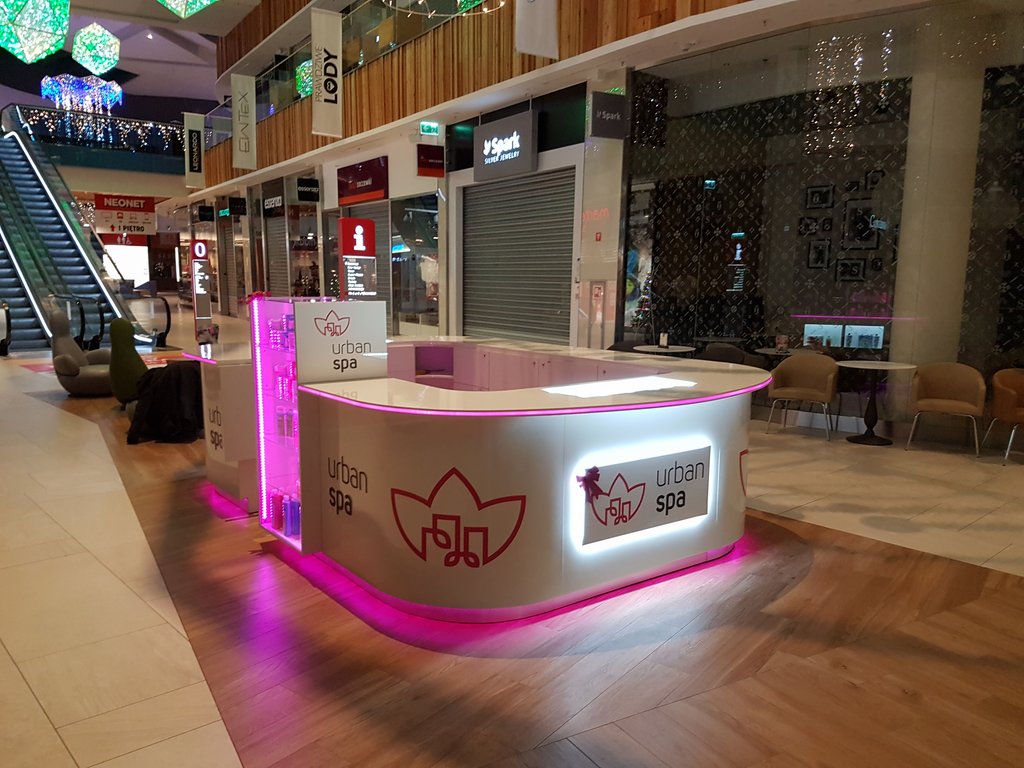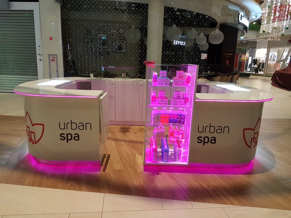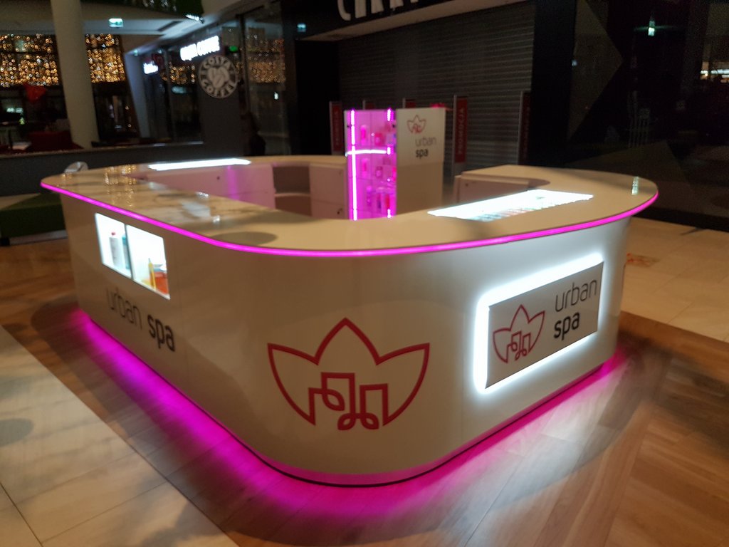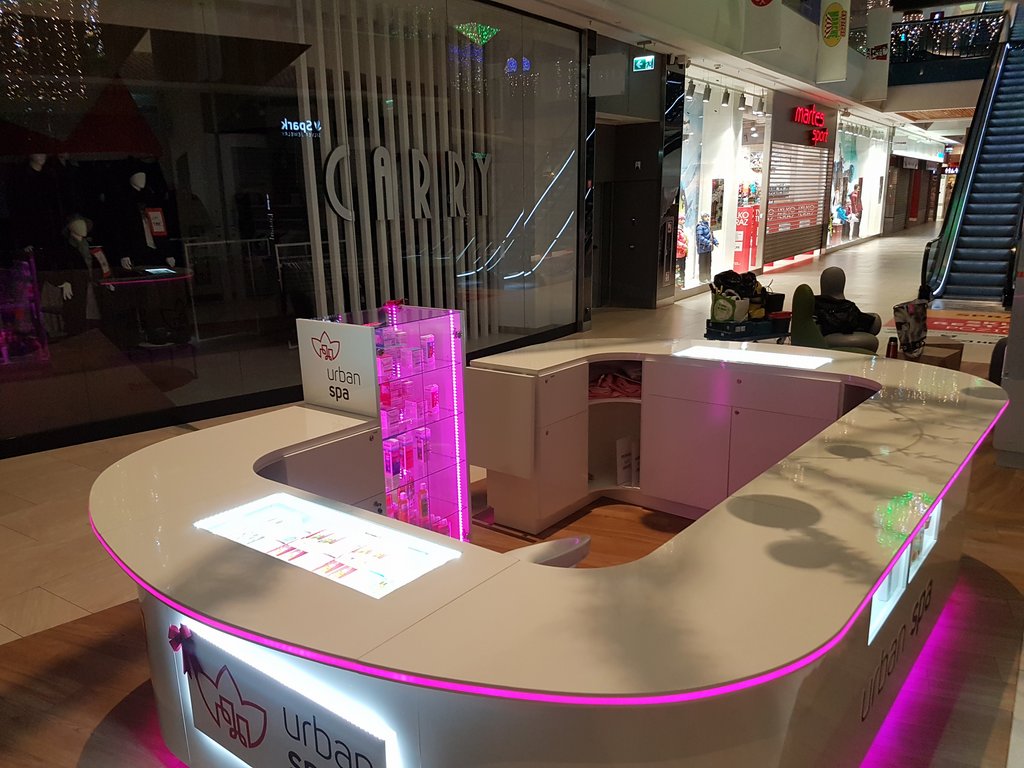 Kosmetyczna wyspa handlowa podświetlona ledami w galerii handlowej