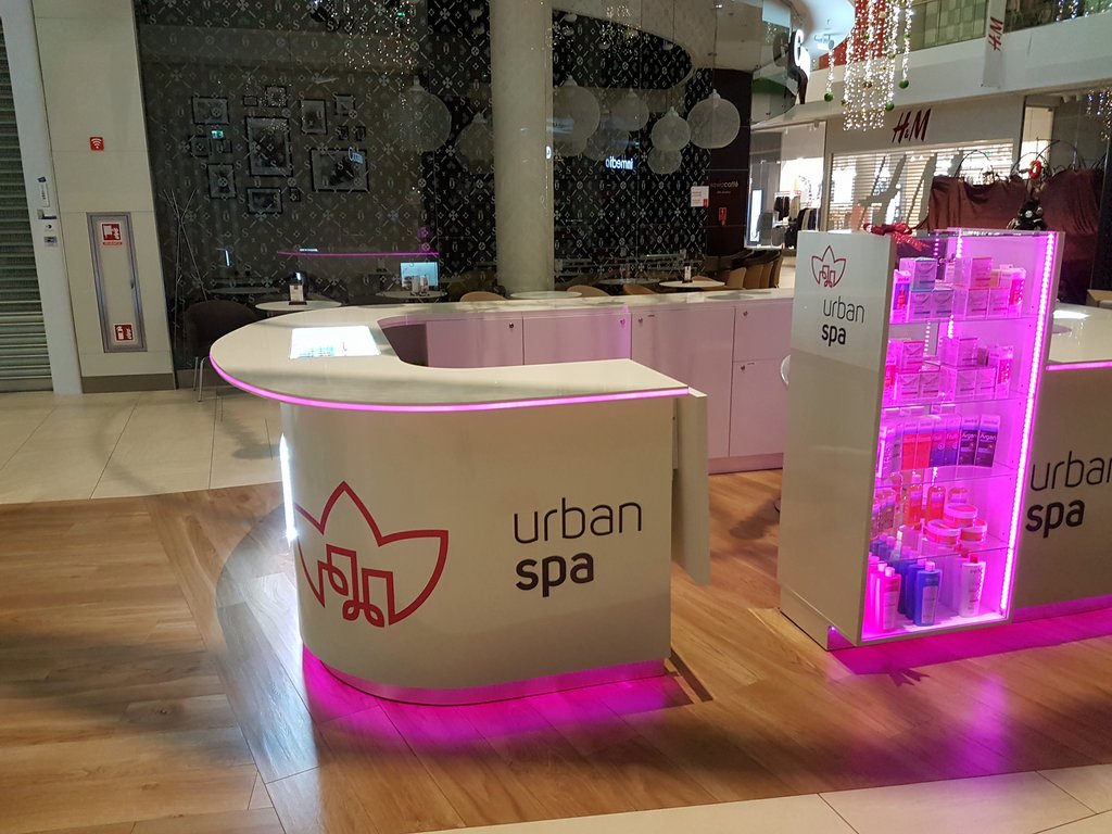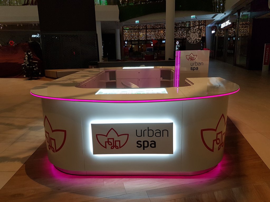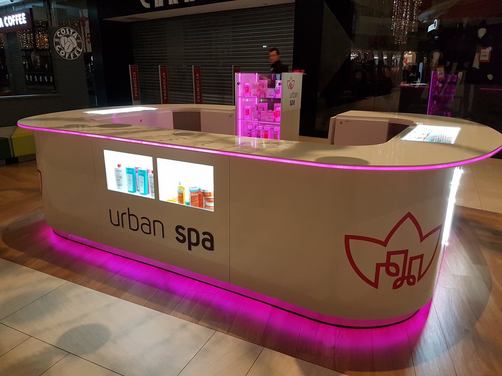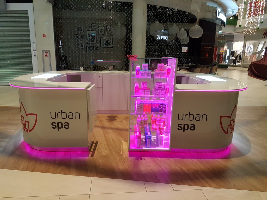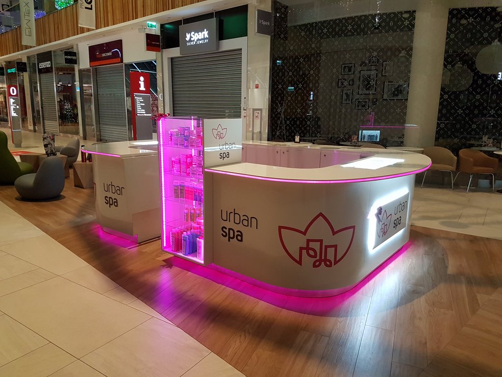 Kosmetyczna wyspa handlowa podświetlona ledami w galerii handlowej