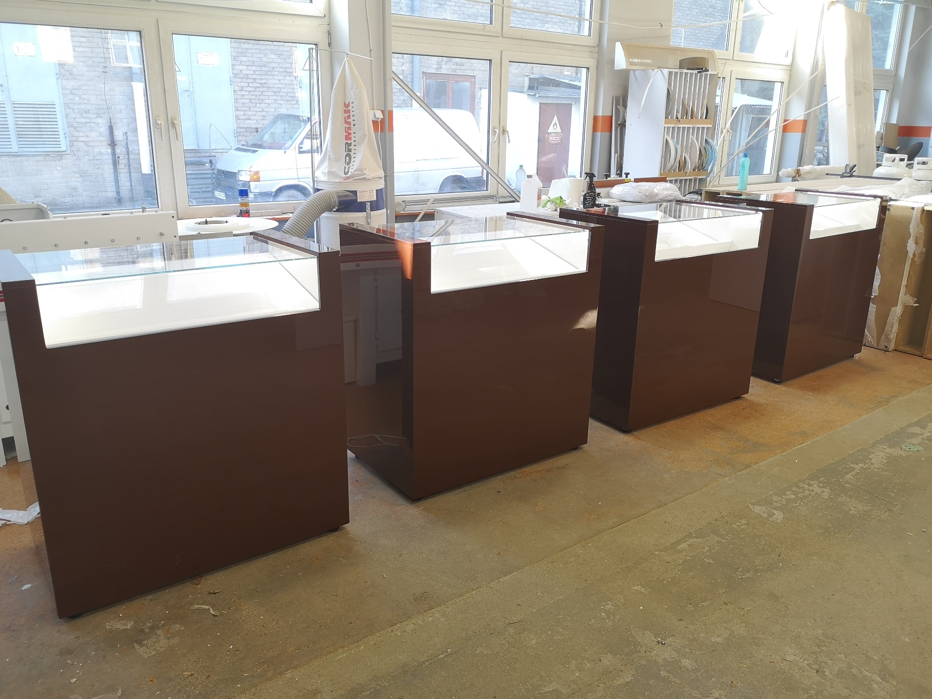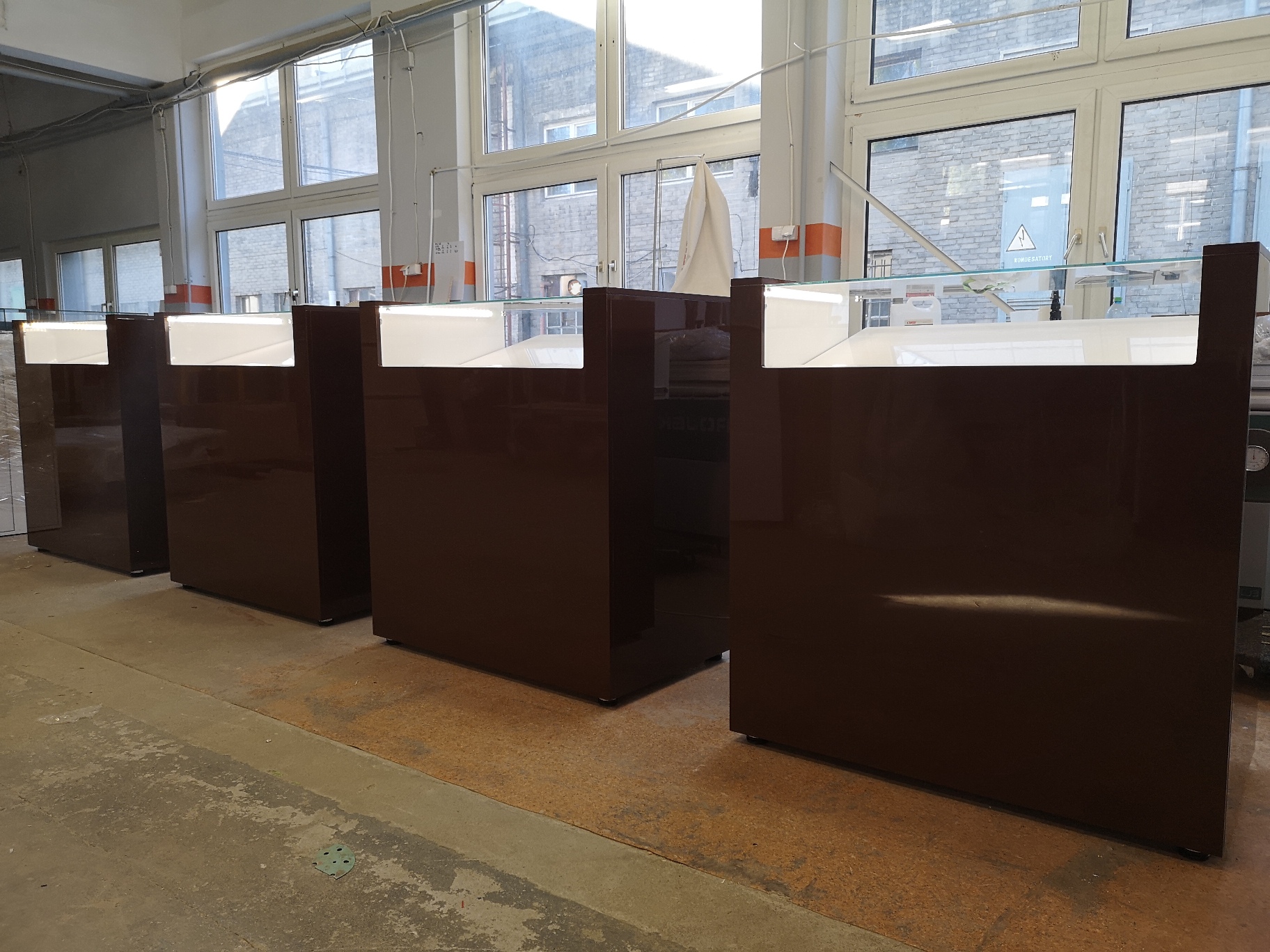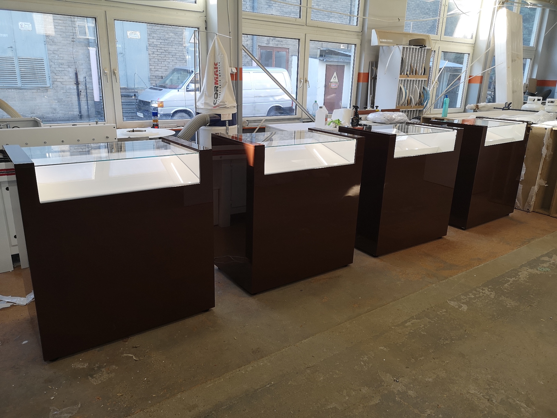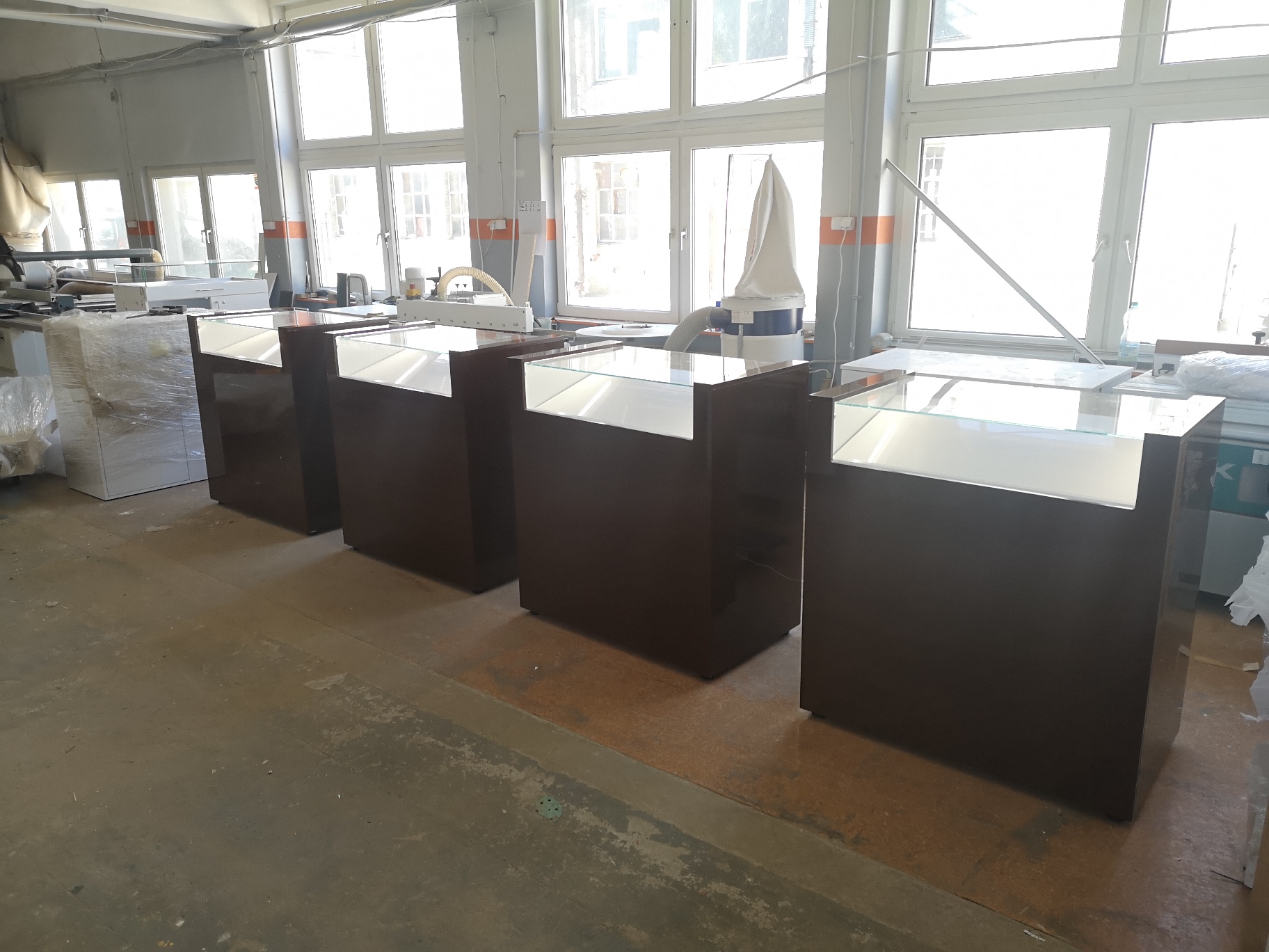 Dla firmy Łazur z branży jubilerskiej przygotowaliśmy cztery indywidualne meble targowe. Meble te zostały wykonane z przeznaczeniem na ekspozycję towarów jubilerskich podczas targów. Lady przystosowane są do wielokrotnego użytku, pierwszy raz pojawiły się w Hali Expo w Łodzi, na targach Interstone.