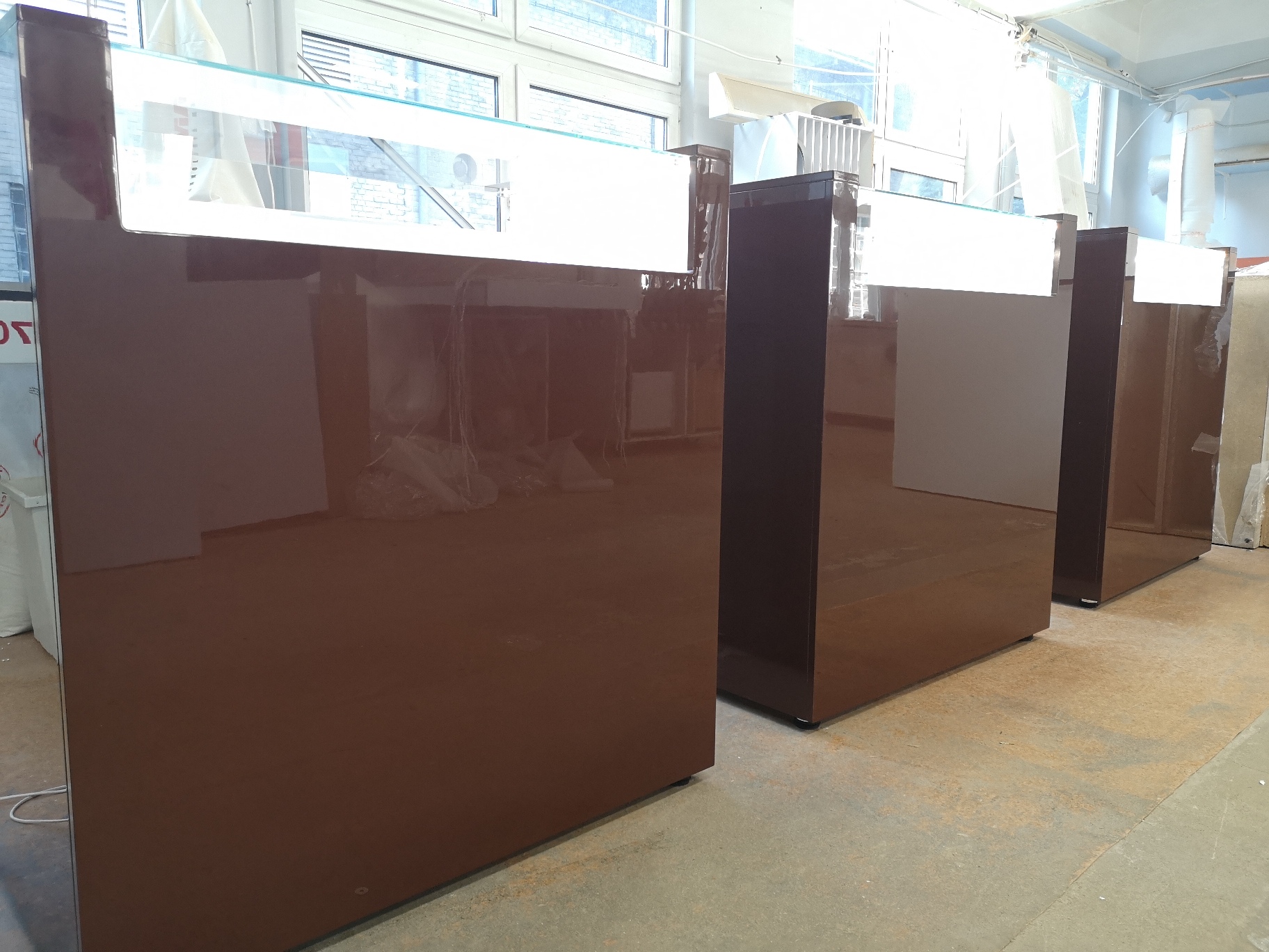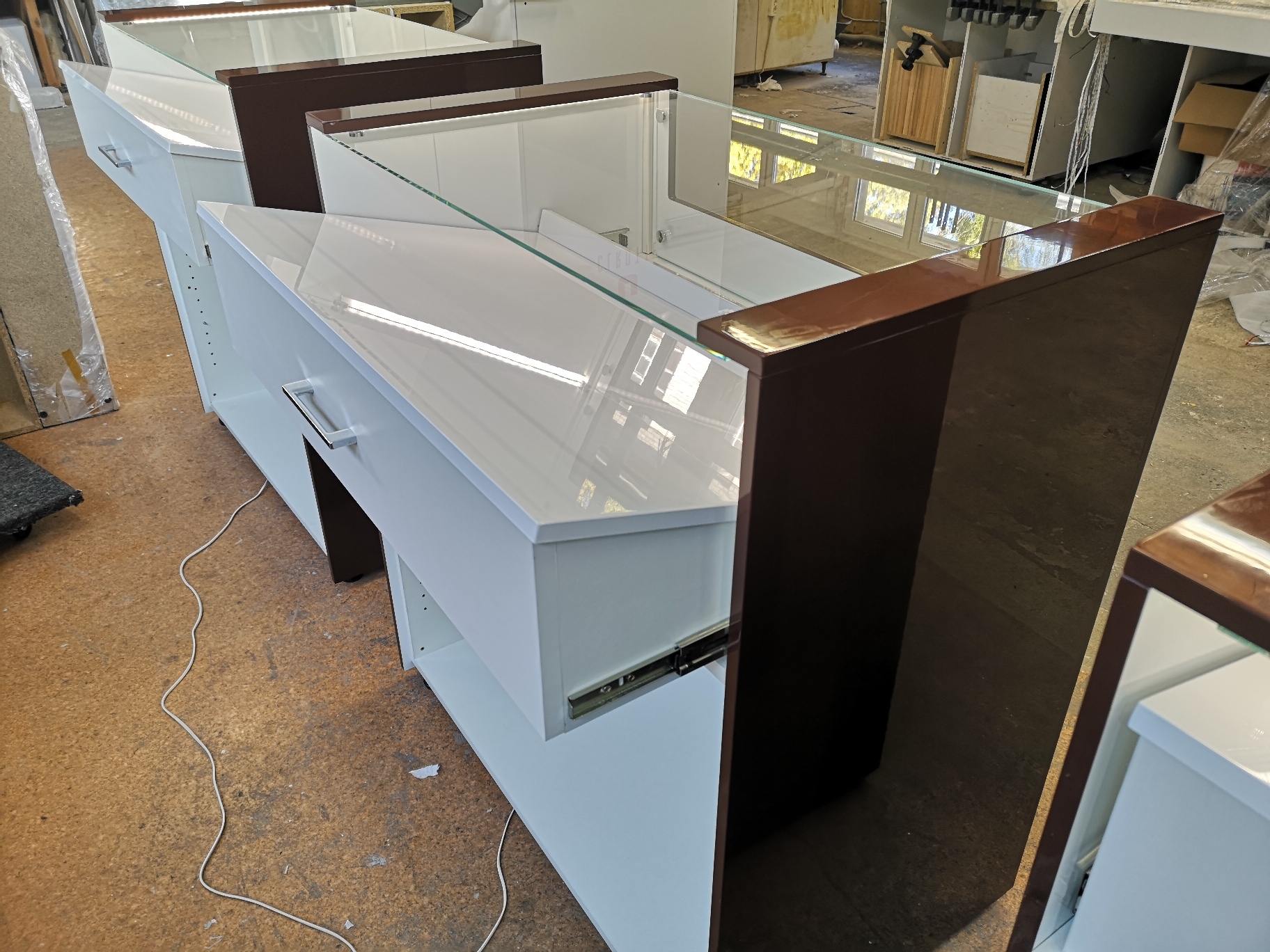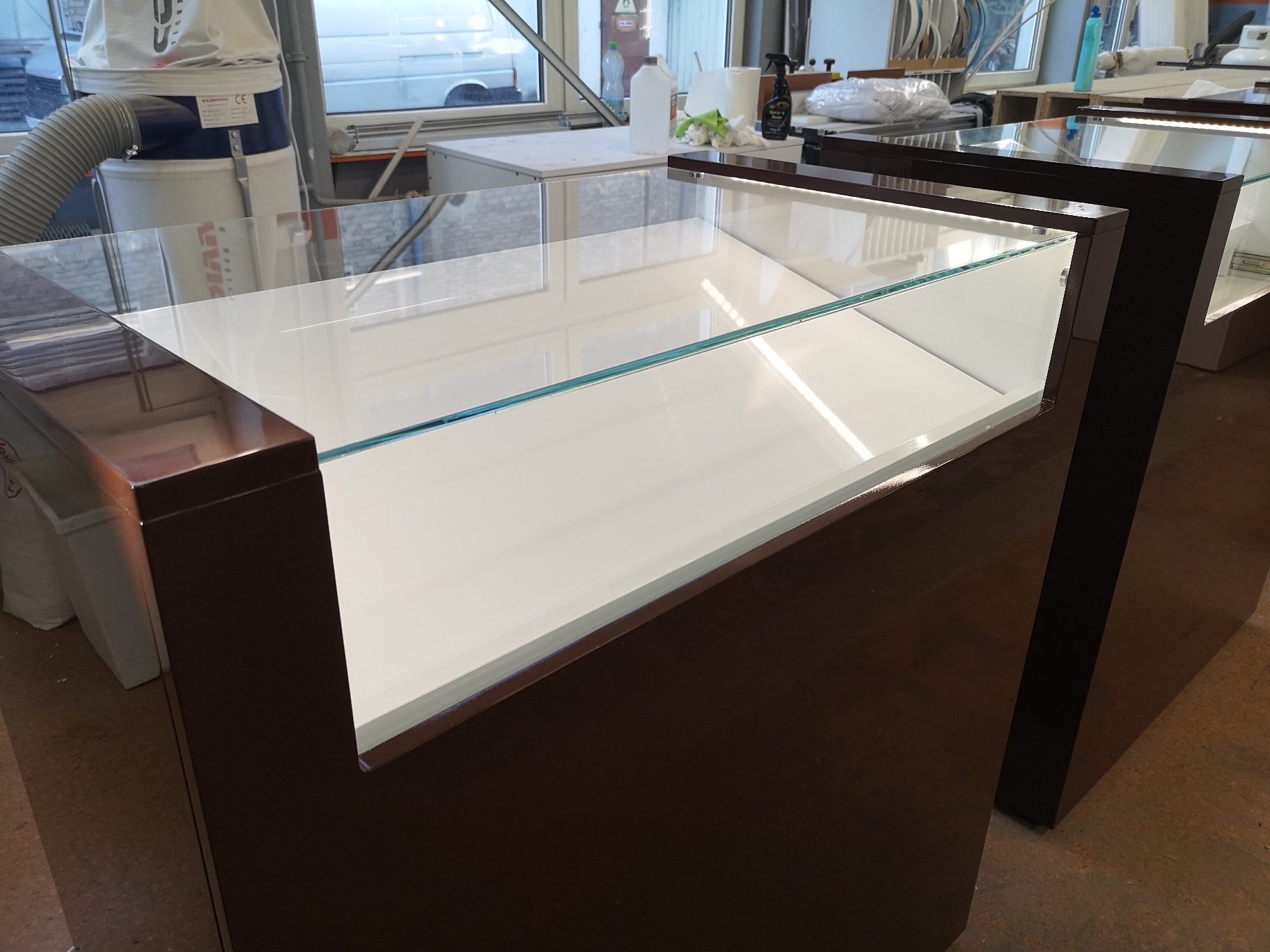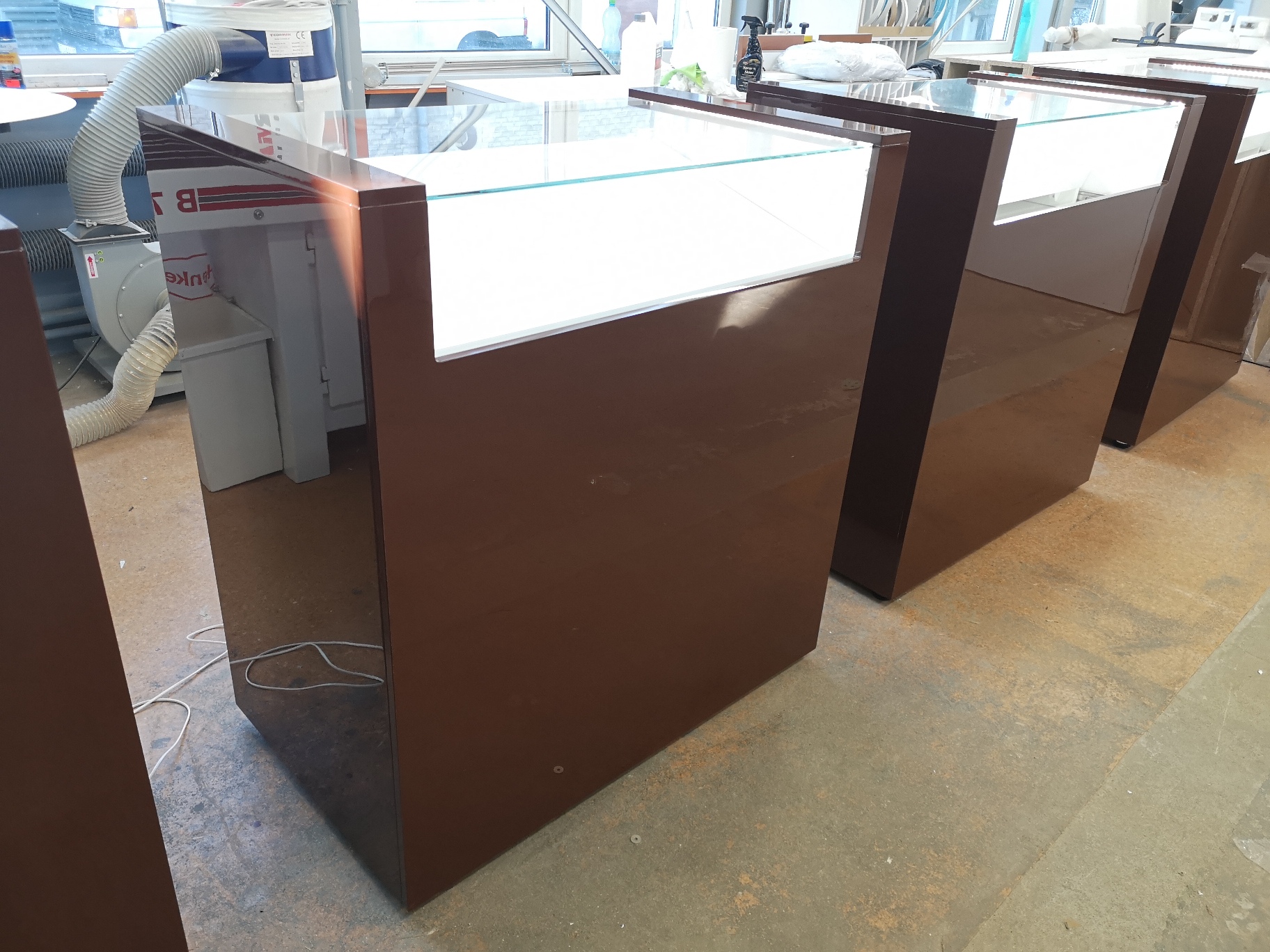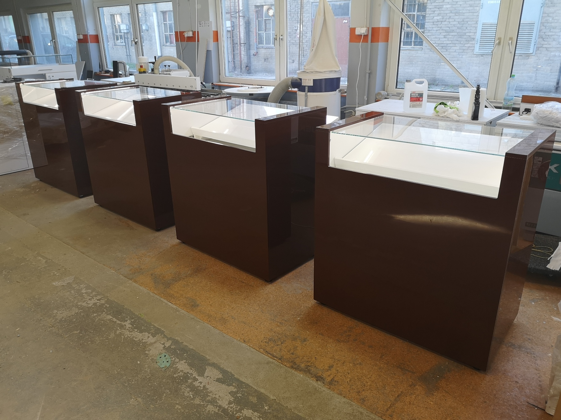 Dla firmy Łazur z branży jubilerskiej przygotowaliśmy cztery indywidualne meble targowe. Meble te zostały wykonane z przeznaczeniem na ekspozycję towarów jubilerskich podczas targów. Lady przystosowane są do wielokrotnego użytku, pierwszy raz pojawiły się w Hali Expo w Łodzi, na targach Interstone.