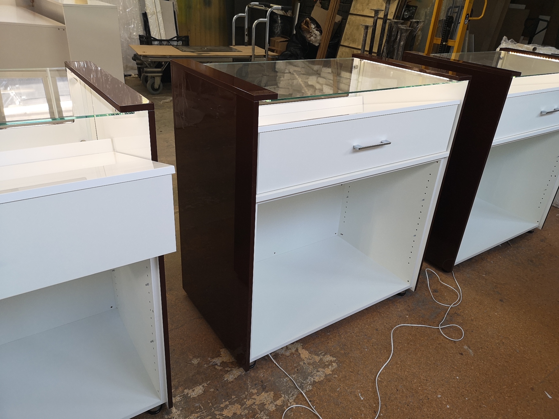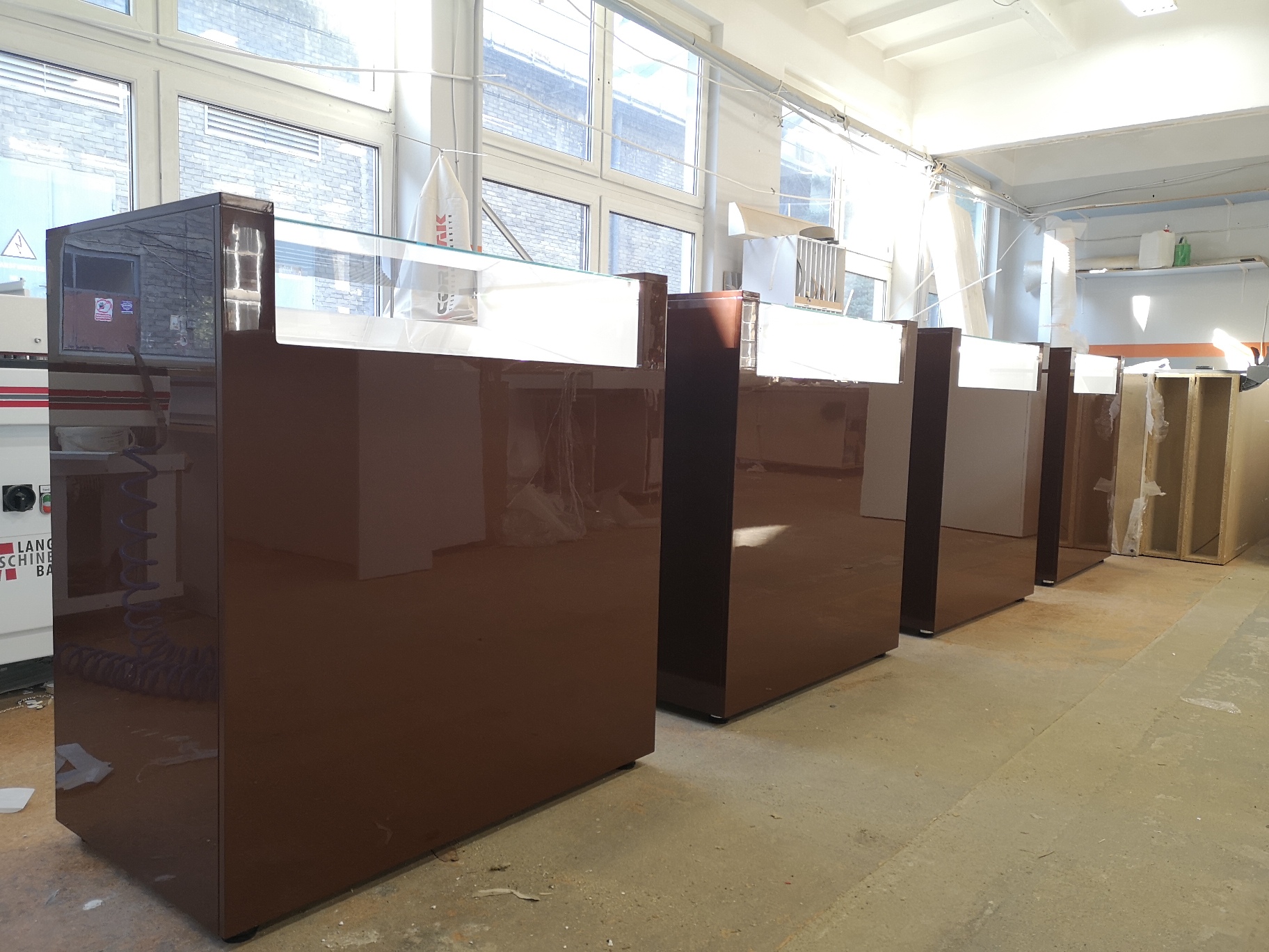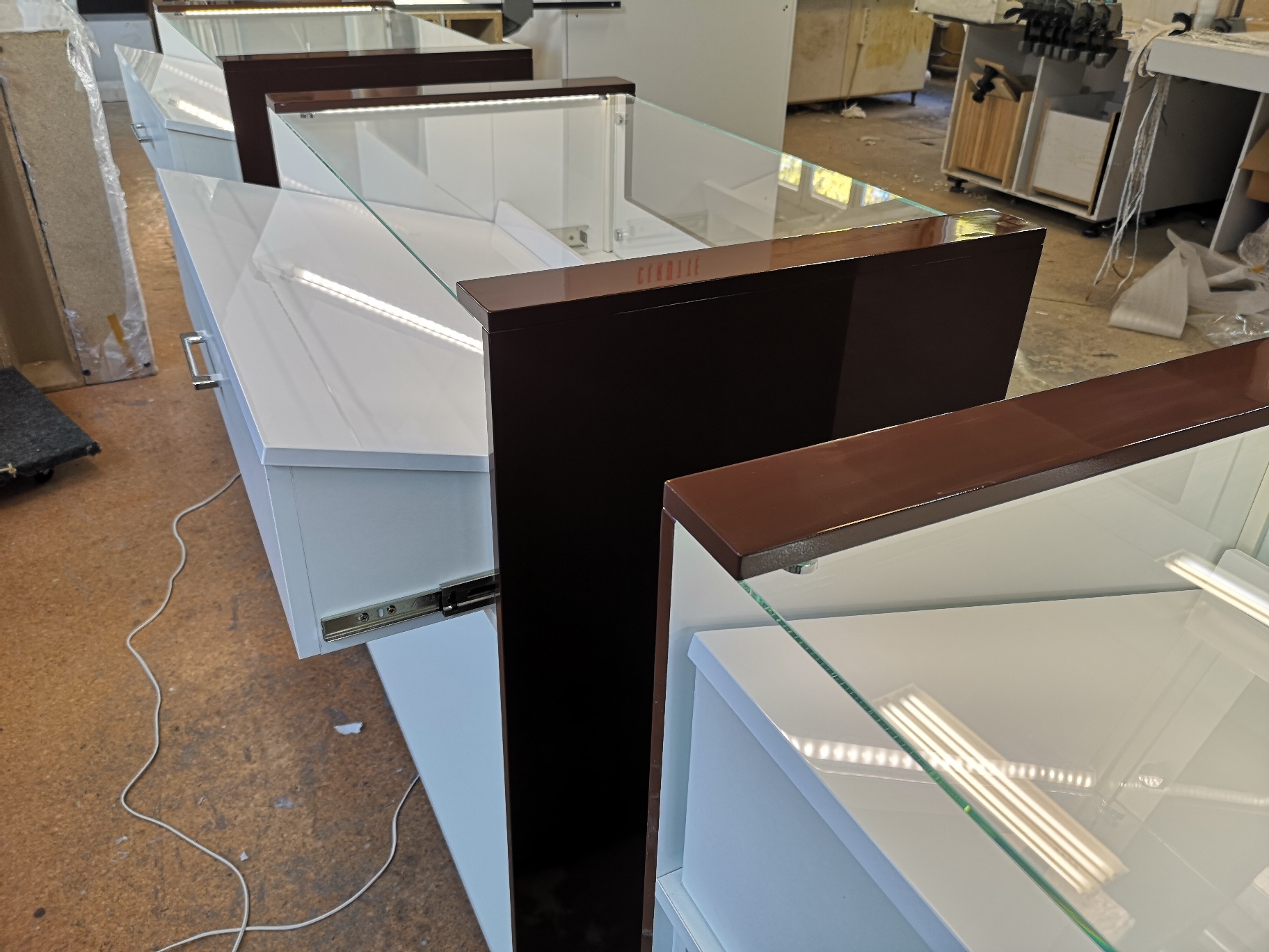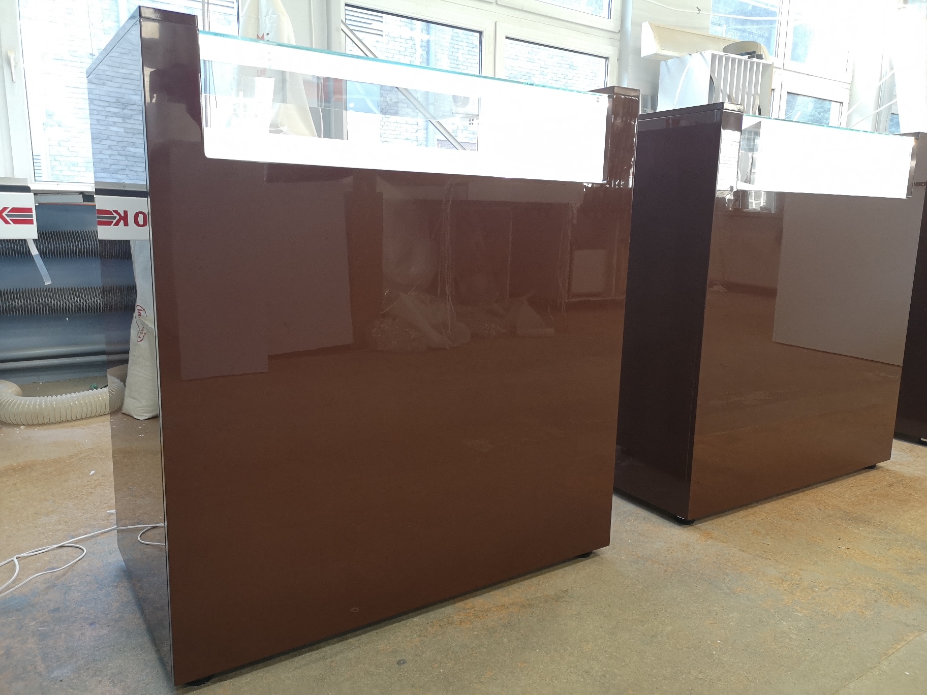 Dla firmy Łazur z branży jubilerskiej przygotowaliśmy cztery indywidualne meble targowe. Meble te zostały wykonane z przeznaczeniem na ekspozycję towarów jubilerskich podczas targów. Lady przystosowane są do wielokrotnego użytku, pierwszy raz pojawiły się w Hali Expo w Łodzi, na targach Interstone.