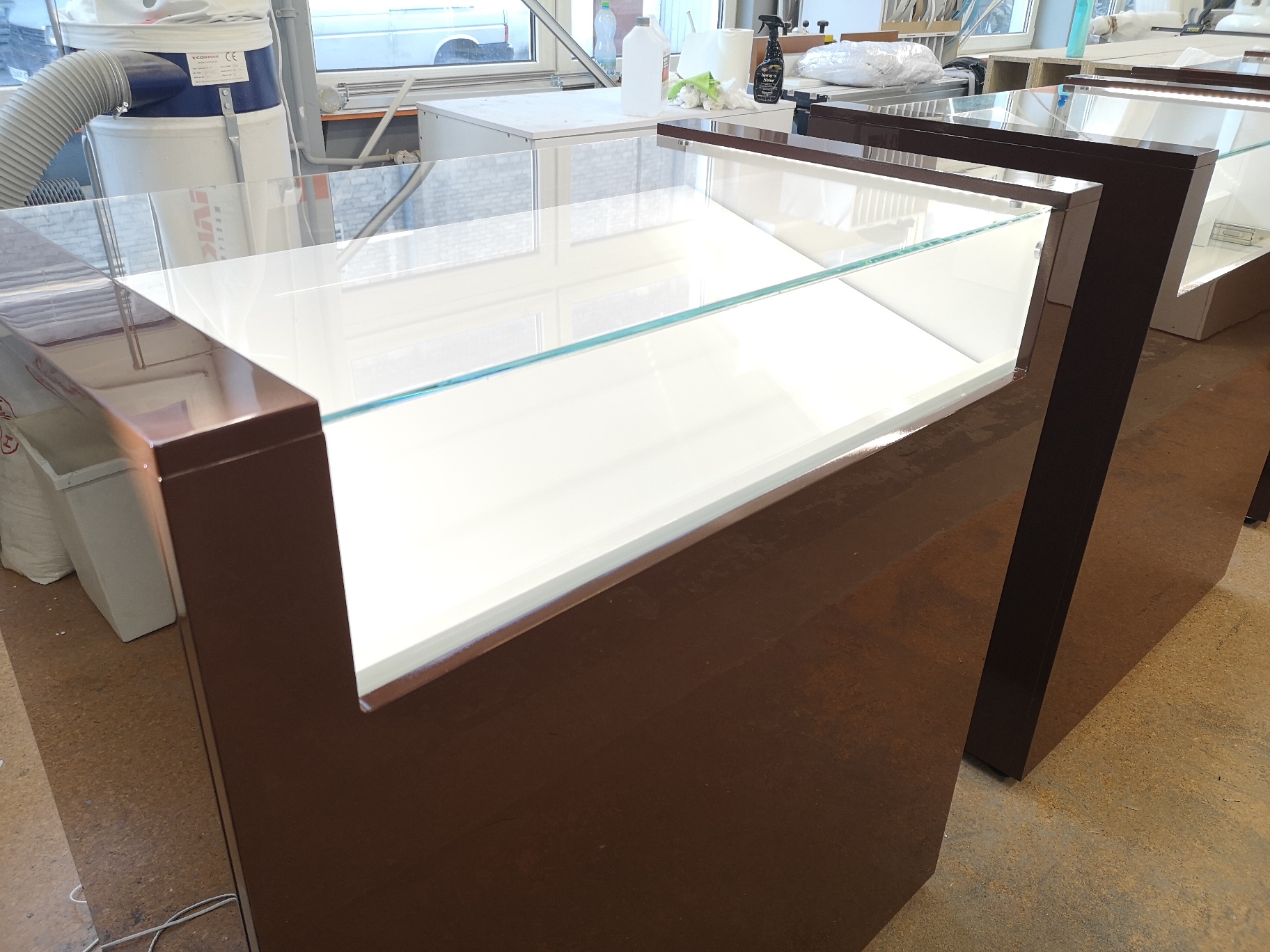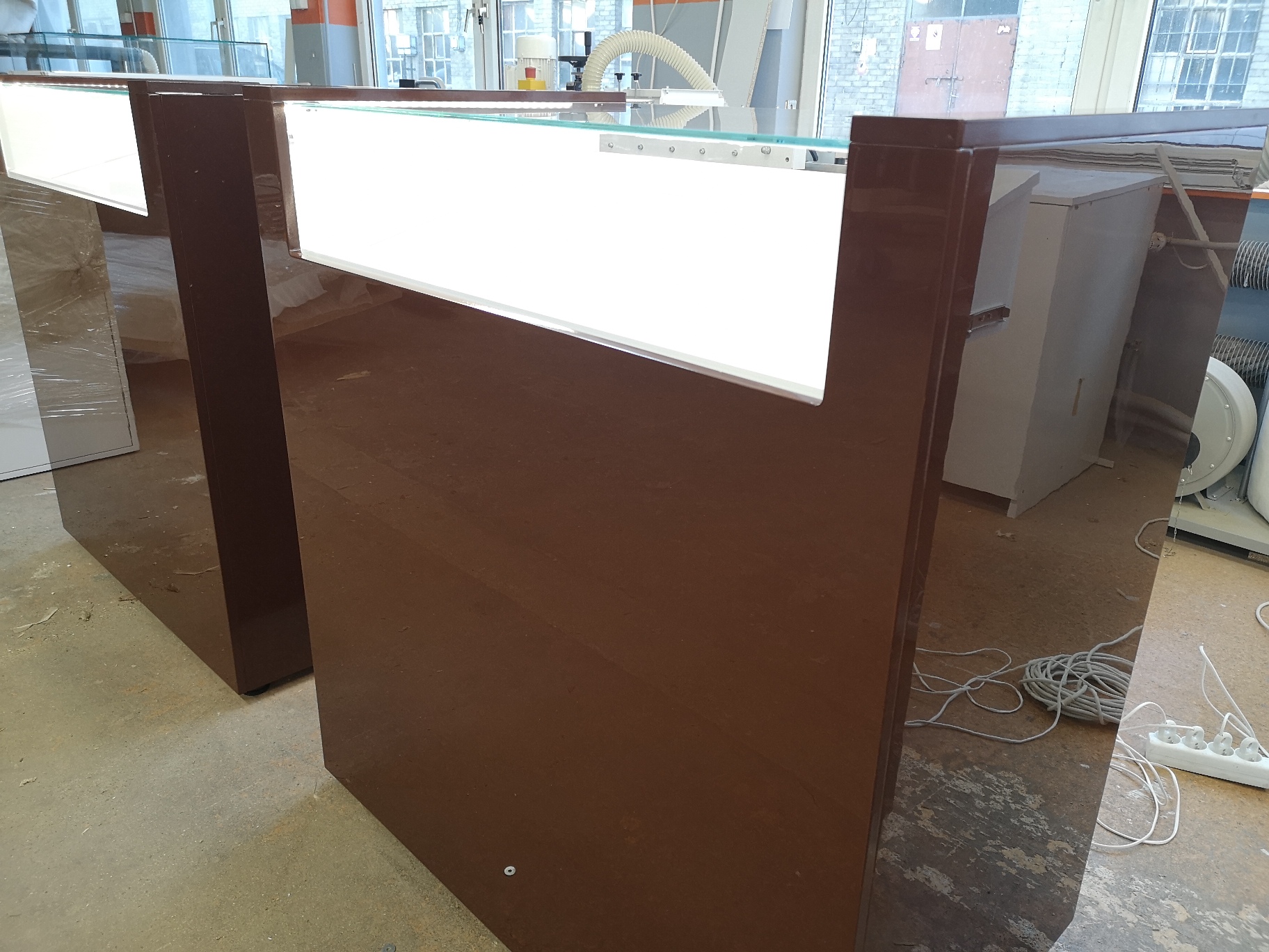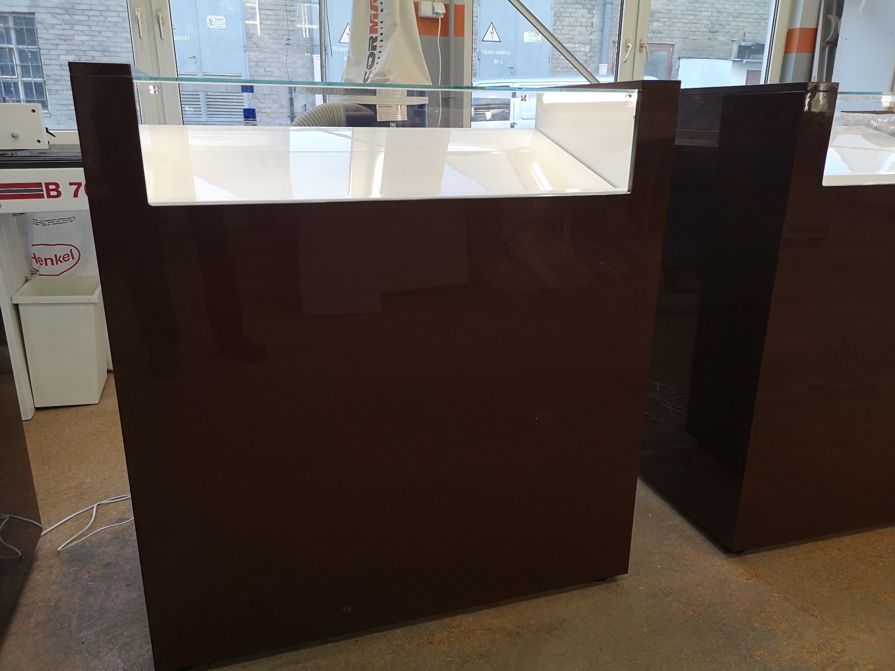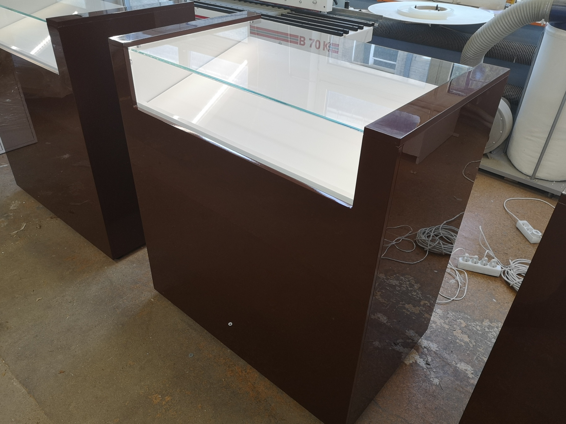 Mebel o zrzutowanych wymiarach 100 x 60 cm i wysokości 110 cm, posiada konstrkcuję z płyty wiórowej laminowanej. Cześć zewnętrza oraz wnętrze gabloty powstały z płyt MDF lakierowanych na wysoki połysk, w dwóch wybranych kolorach. Górna część mebla to przestrzeń ekspozycyjna – gablota, zakryta szkłem hartowanym i klejonym w technologii UV, wnętrze podświetlone mocnym światłem LED. W przestrzeni ekspozycyjnej znajduje się także szuflada z płytą ekspozycyjną, lakierowaną na wysoki połysk, pod kątem. Wnętrze mebla stanowi otwarta przestrzeń magazynowa z regulowanymi półkami.