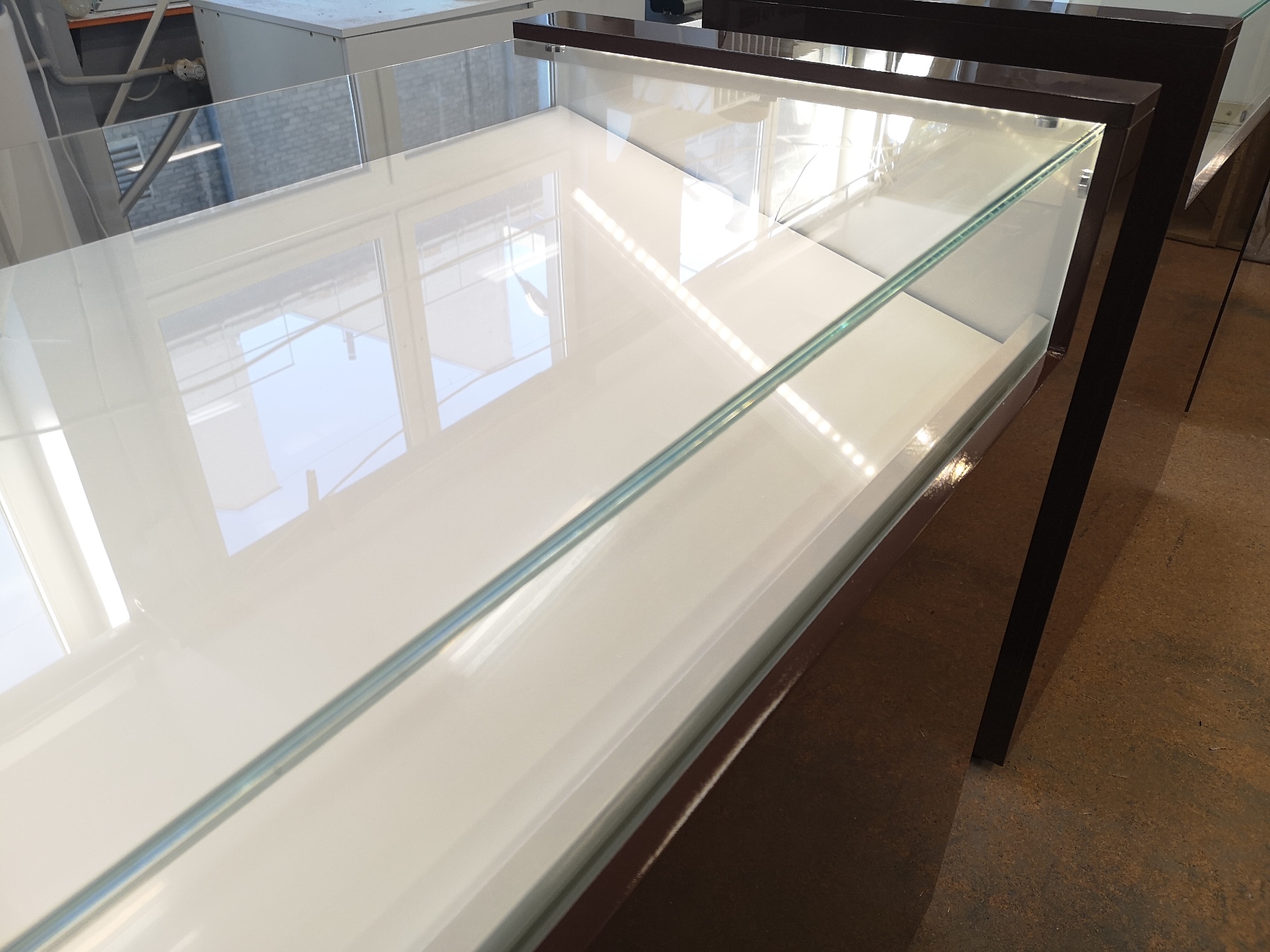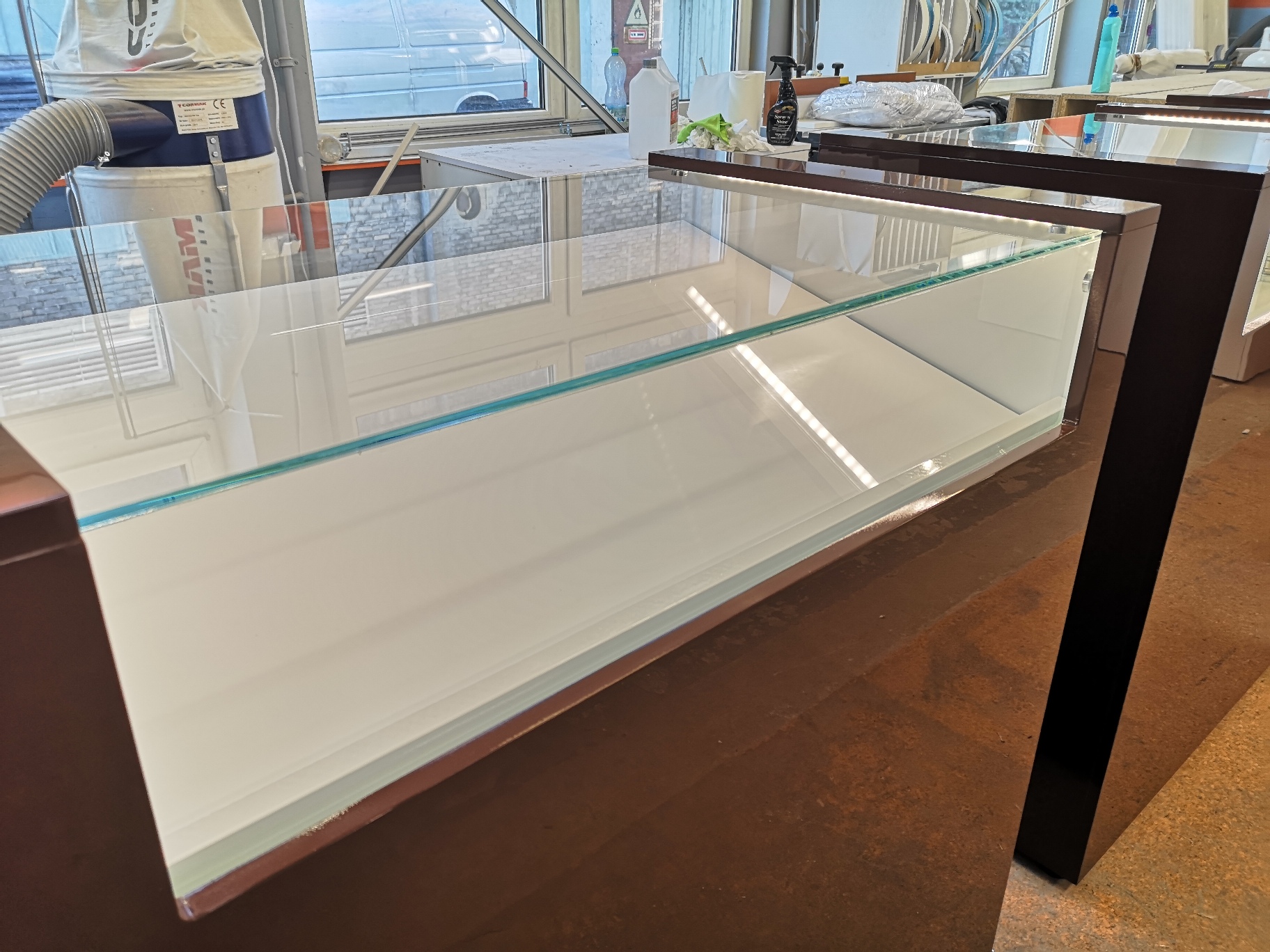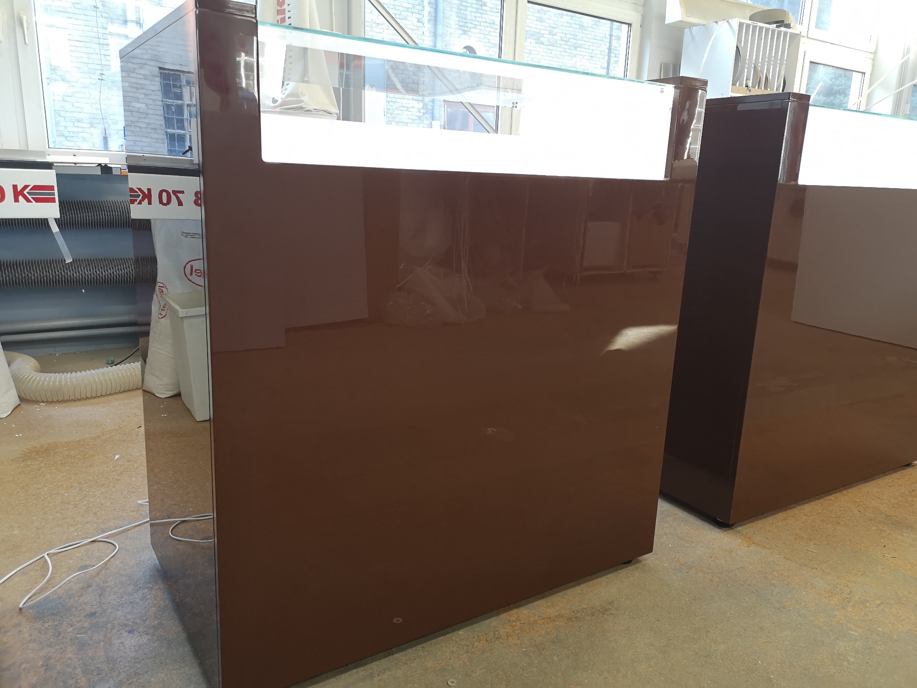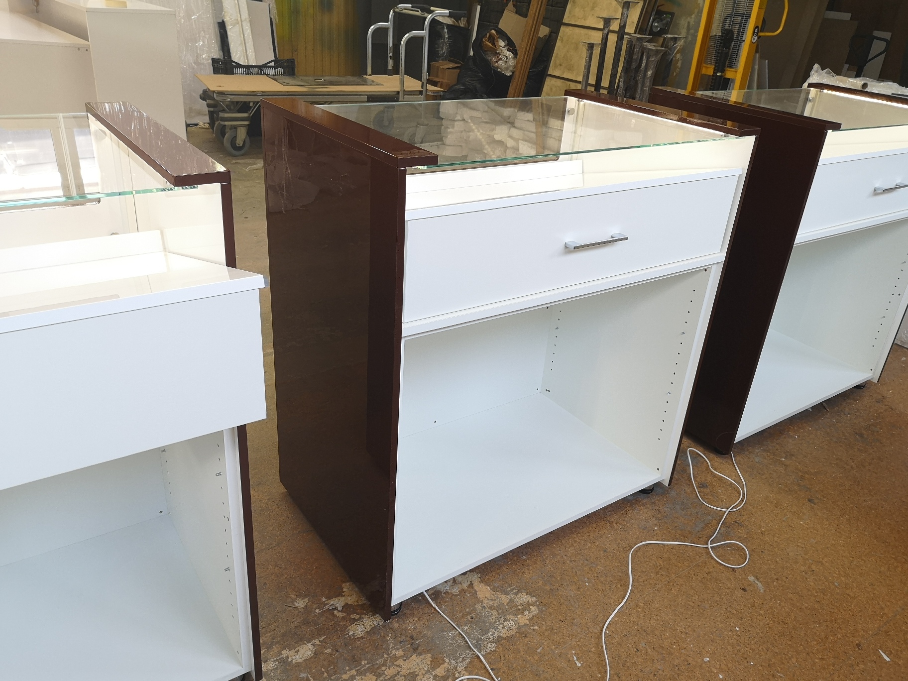 Mebel o zrzutowanych wymiarach 100 x 60 cm i wysokości 110 cm, posiada konstrkcuję z płyty wiórowej laminowanej. Cześć zewnętrza oraz wnętrze gabloty powstały z płyt MDF lakierowanych na wysoki połysk, w dwóch wybranych kolorach. Górna część mebla to przestrzeń ekspozycyjna – gablota, zakryta szkłem hartowanym i klejonym w technologii UV, wnętrze podświetlone mocnym światłem LED. W przestrzeni ekspozycyjnej znajduje się także szuflada z płytą ekspozycyjną, lakierowaną na wysoki połysk, pod kątem. Wnętrze mebla stanowi otwarta przestrzeń magazynowa z regulowanymi półkami.