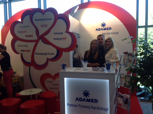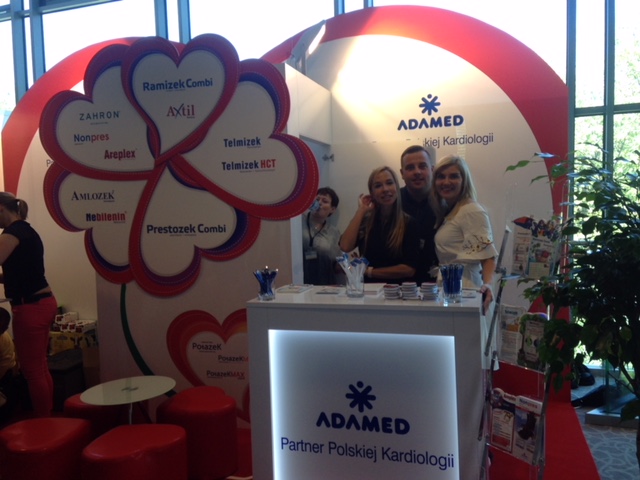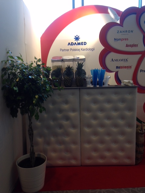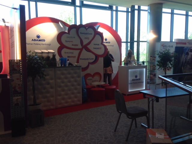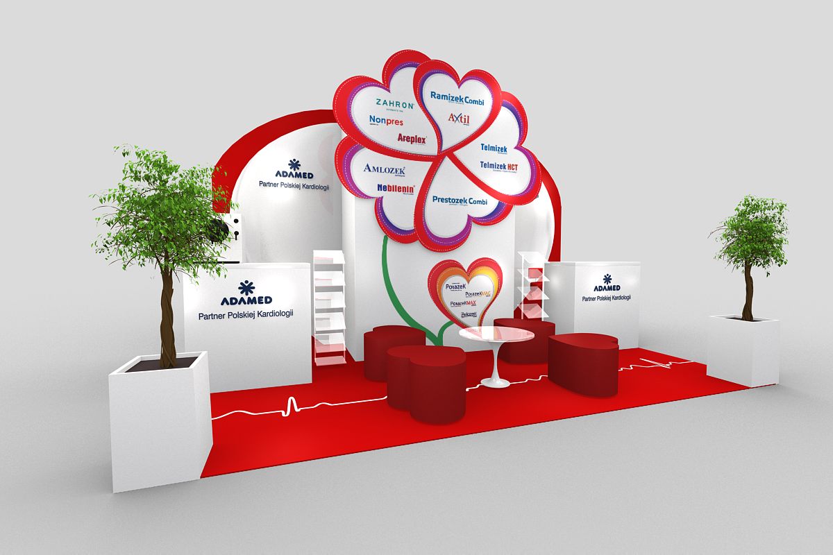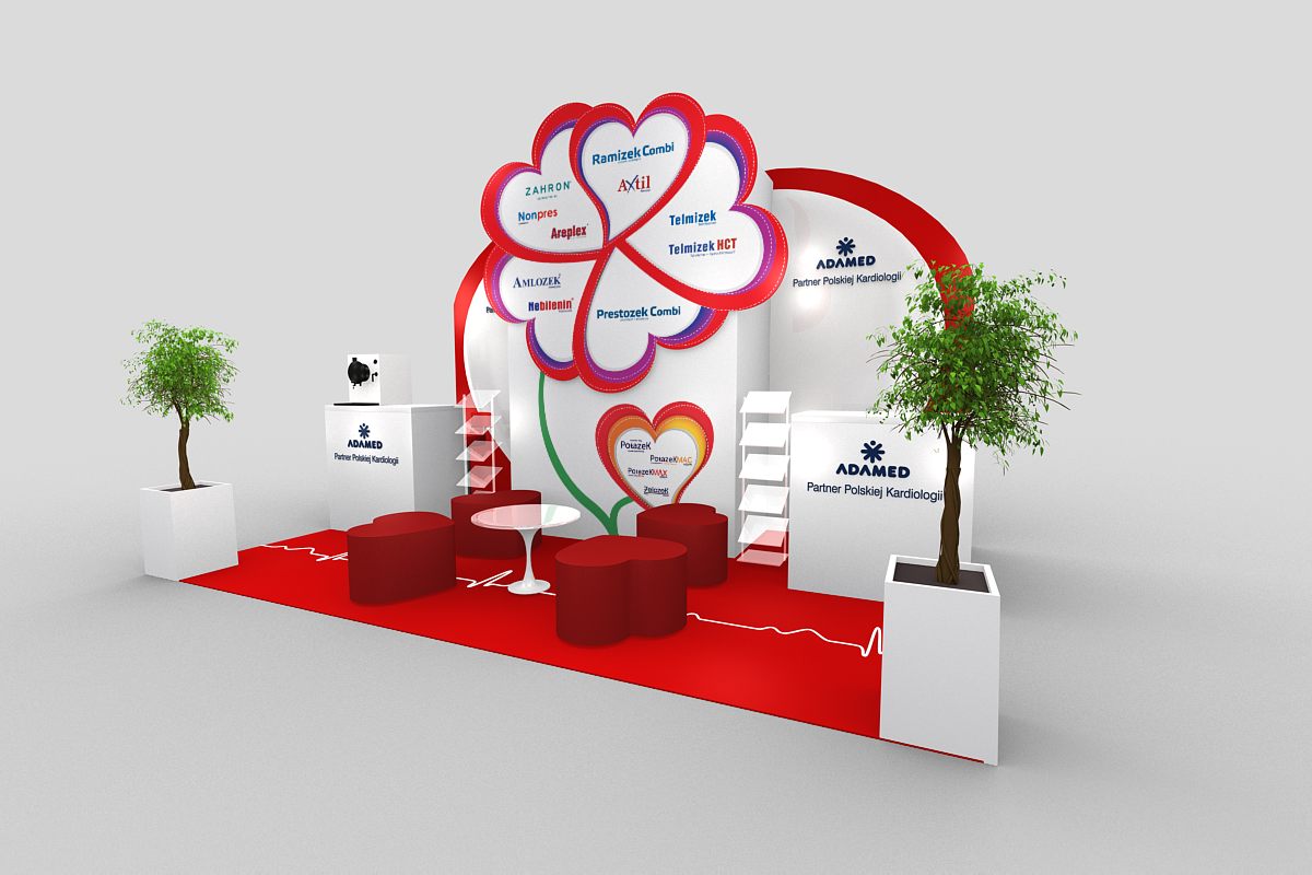 Prezentujemy bardzo nietypowe stoisko medyczne z konferencji kardiologicznej w Warszawie – Hotel Warszawianka w Jachrance. Już na uwagę zasługuje wykładzina krwisto czerwona z malowanym z szablonu symbolem EKG. Natomiast wielki element POSM na środku zabudowy wystawienniczej w postaci kwiatu ułożonego z serc. Również ściana tylna jest w kształcie serca w kolorze czerwono – białym wykonana z MDF i płyt HIPS połysk z drukiem UV. Ologowanie producenta leków ADAMED pojawia się na podświetlanej ladzie i ścianie tylnej. Natomiast nazwy leków i produktów grupy Adamed pojawiają się na sercach, które stanowią obłożenie wygodnego i ukrytego zaplecza. Na wyspie znalazł się również bar z tapicerowanym frontem oraz bardzo ciekawe meble ruchome: pufy o rzucie serc oraz mały szklany stolik. Oświetlenie profesjonalne ze ściany podkreśla dodatkowo nietypowe formy stoiska. To małe stoisko poprzez zastosowane elementy graficzne i ciekawe bryły bardzo przyciąga uwagę na konferencjach, zjazdach i sympozjach.
