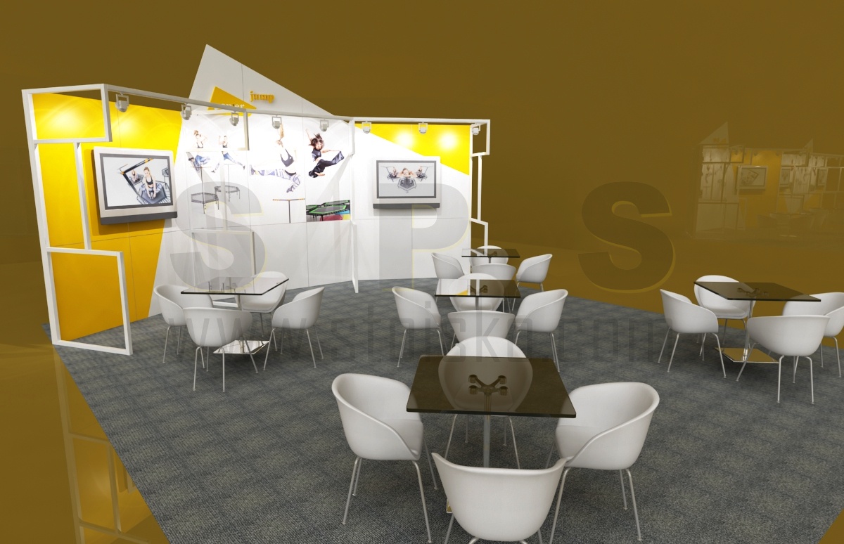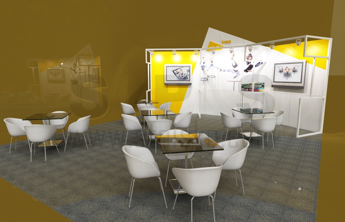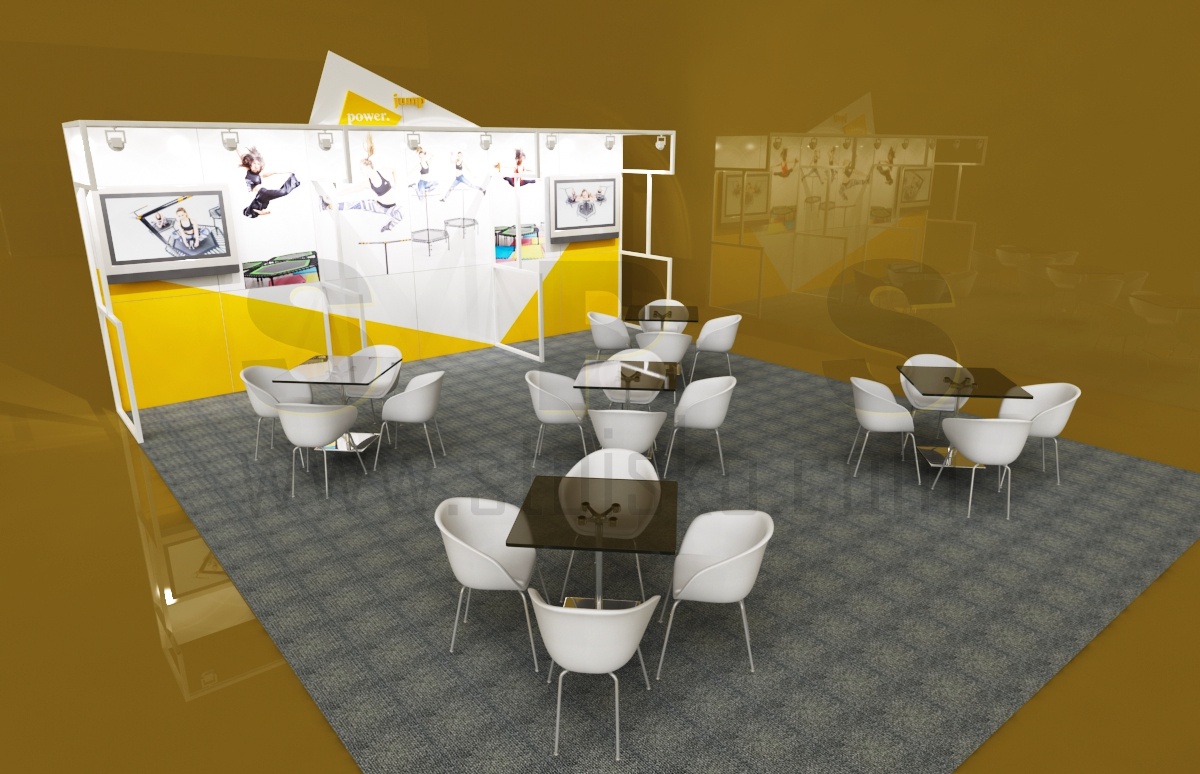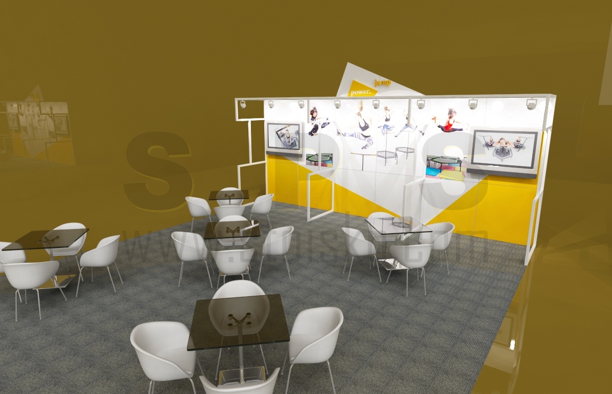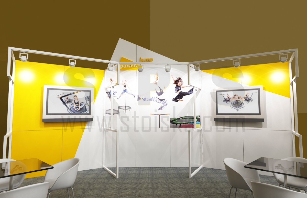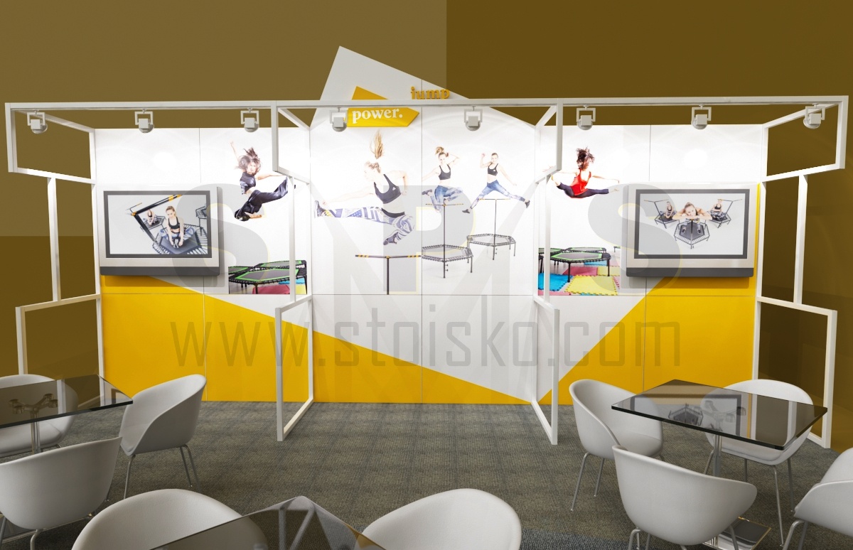 Stoisko targowe składające się ze ściany z naświetlaczami oraz telewizorami wiszącymi i stolików kawowych.