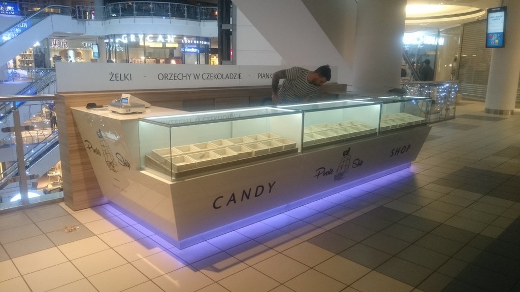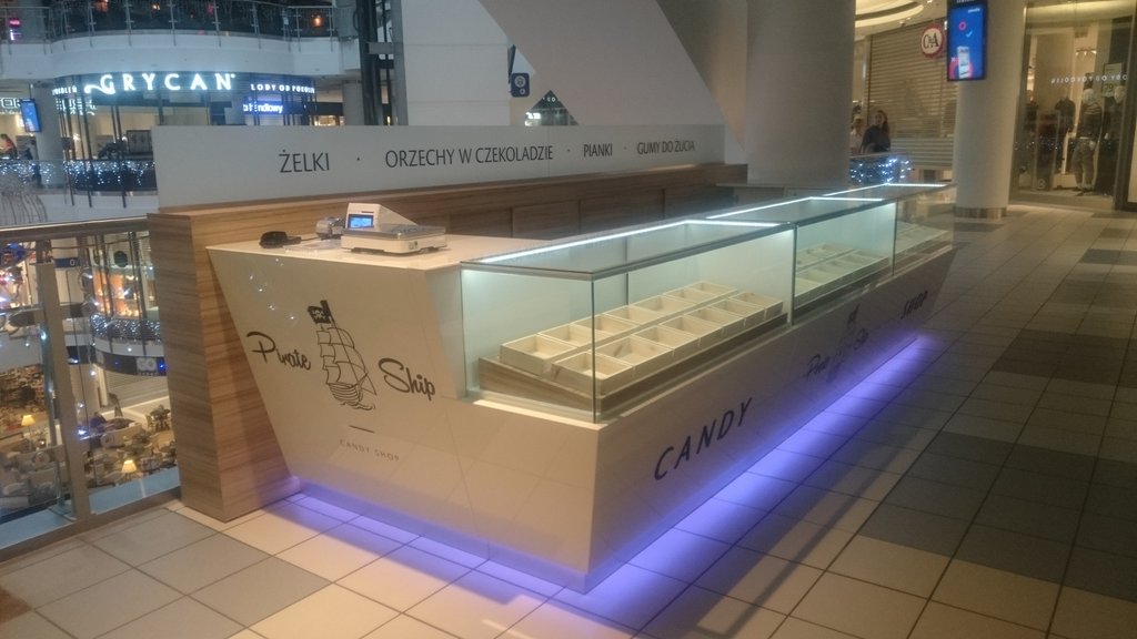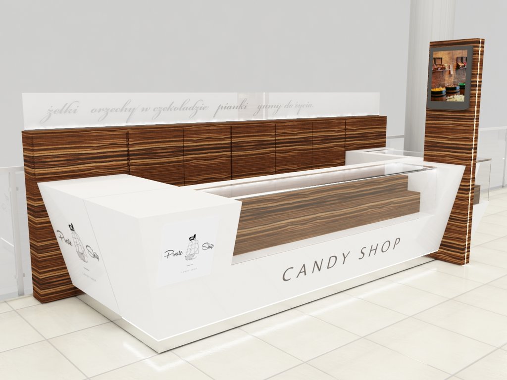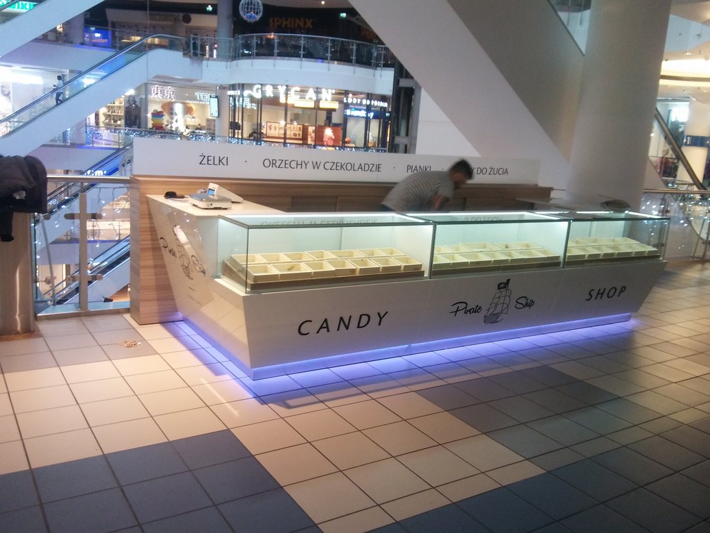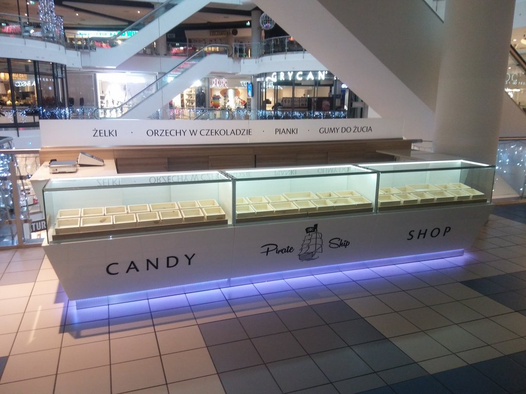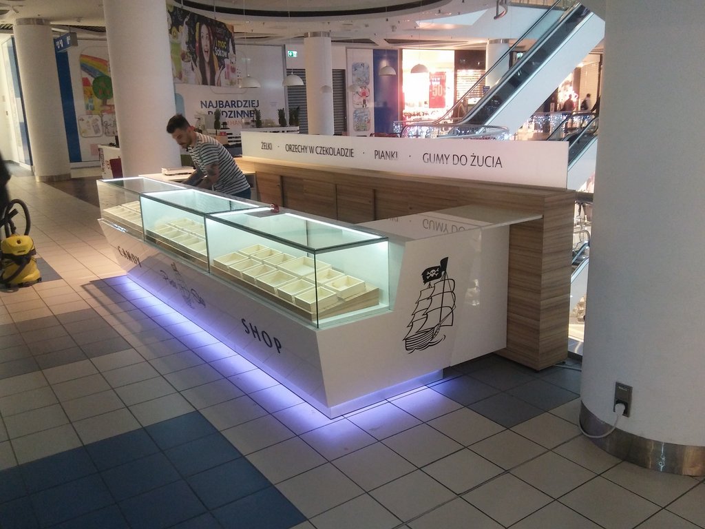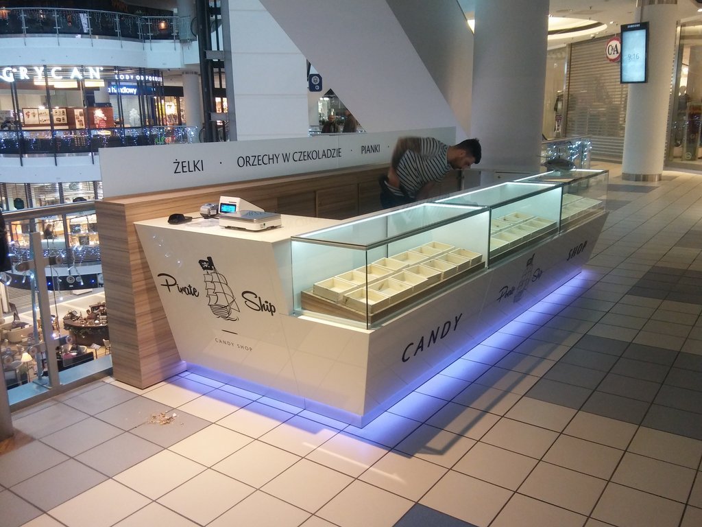 Ta nowoczesna wyspa handlowa o nietypowej formie z pochyłymi ścianami znajduje się w Warszawie w słynnym centrum handlowym Blue City. Wyspa wykonana dla start’upu Pirate shop Candy – słynnego sklepu ze słodyczami z ulicy Chmielnej w Warszawie. Nowoczesny, a zarazem skandynawski charakter wyspa uzyskuje poprzez zastosowanie elementów z MDF lakierowanych na wysoki połysk w kolorze jasno-beżowym w połączeniu z elementami z jasnym fornirem. Duże gabloty ze szkła hartowanego i LED RGB umożliwiają praktyczną ekspozycję towaru – żelków, orzechów w czekoladzie, pianek, gum i innych słodyczy. Wyspa nawiązuje do sklepu i pirackiego charakteru przypominając statek. Ciekawym rozwiązaniem jest zastosowanie wszystkich drzwi jako przesuwnych w celu zaoszczędzenia miejsca. Wyspa w pakiecie TOP jest jedną z dwóch stawianym w tym roku i mamy nadzieję jedną z wielu w przyszłym roku.