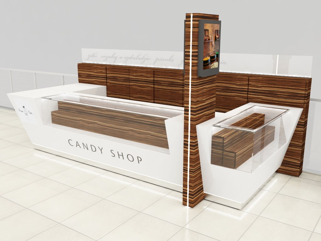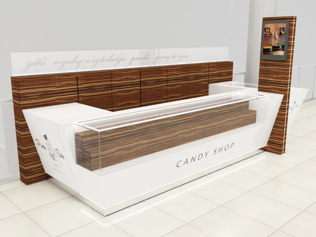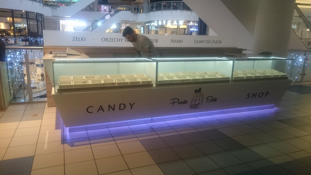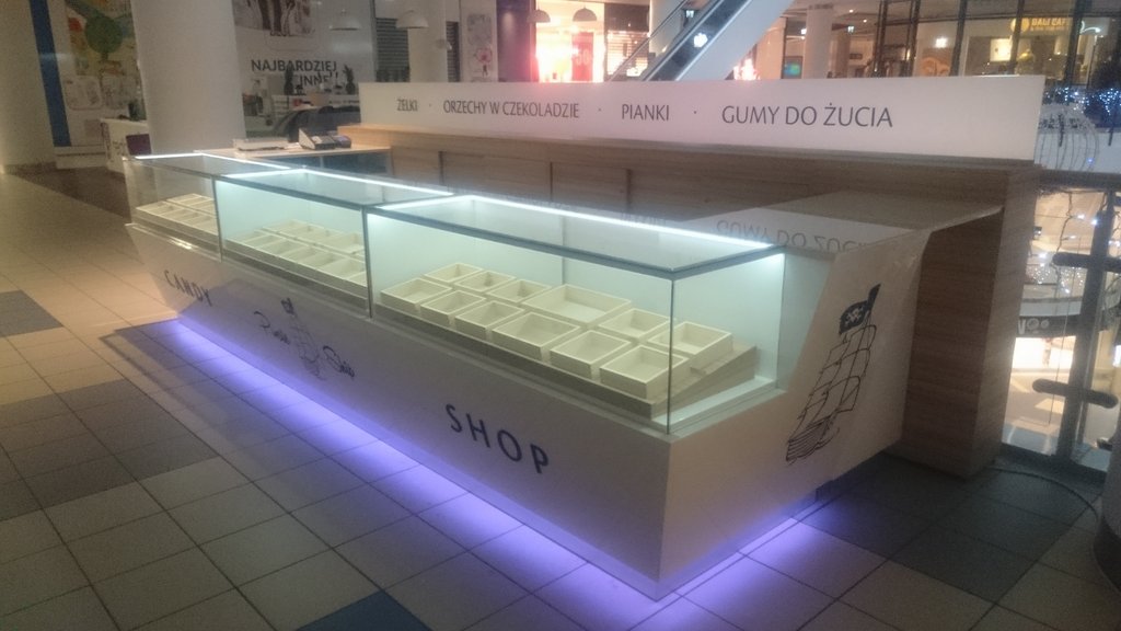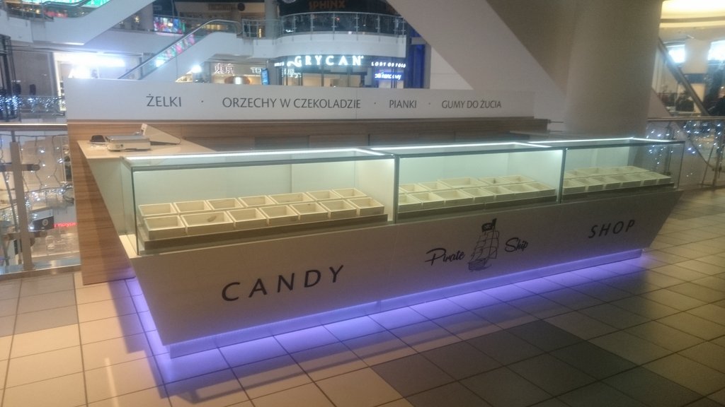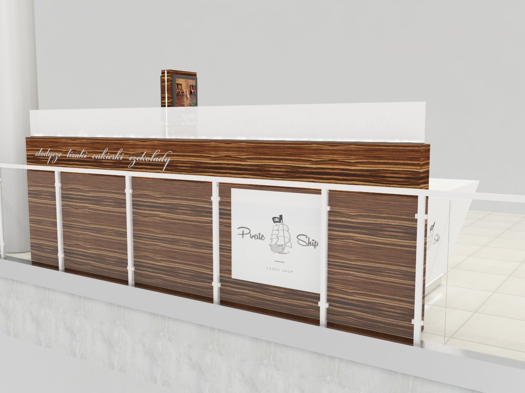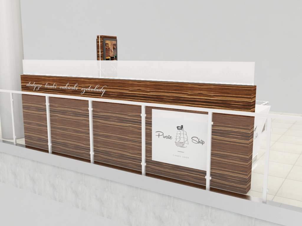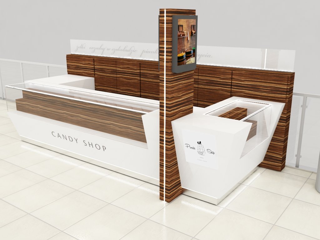 Ta nowoczesna wyspa handlowa o nietypowej formie z pochyłymi ścianami znajduje się w Warszawie w słynnym centrum handlowym Blue City. Wyspa wykonana dla start’upu Pirate shop Candy – słynnego sklepu ze słodyczami z ulicy Chmielnej w Warszawie. Nowoczesny, a zarazem skandynawski charakter wyspa uzyskuje poprzez zastosowanie elementów z MDF lakierowanych na wysoki połysk w kolorze jasno-beżowym w połączeniu z elementami z jasnym fornirem. Duże gabloty ze szkła hartowanego i LED RGB umożliwiają praktyczną ekspozycję towaru – żelków, orzechów w czekoladzie, pianek, gum i innych słodyczy. Wyspa nawiązuje do sklepu i pirackiego charakteru przypominając statek. Ciekawym rozwiązaniem jest zastosowanie wszystkich drzwi jako przesuwnych w celu zaoszczędzenia miejsca. Wyspa w pakiecie TOP jest jedną z dwóch stawianym w tym roku i mamy nadzieję jedną z wielu w przyszłym roku.