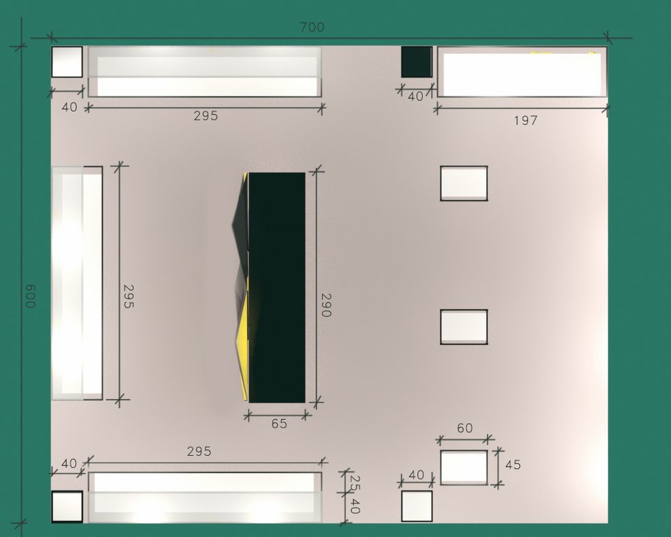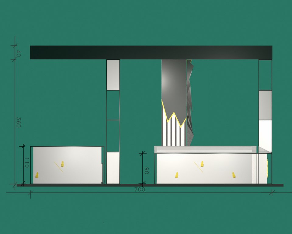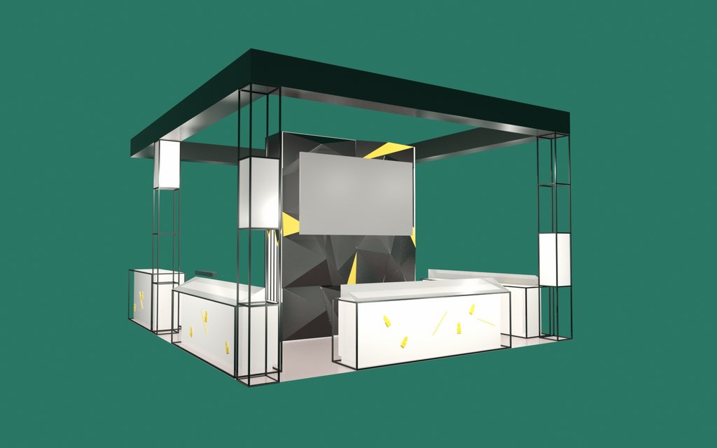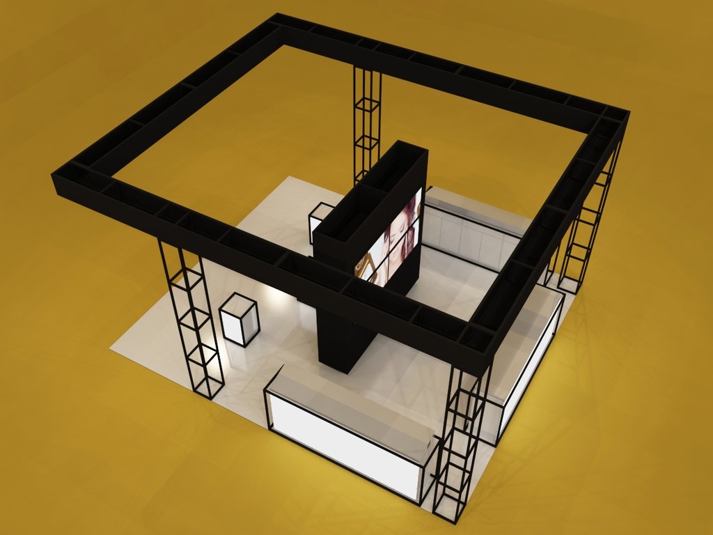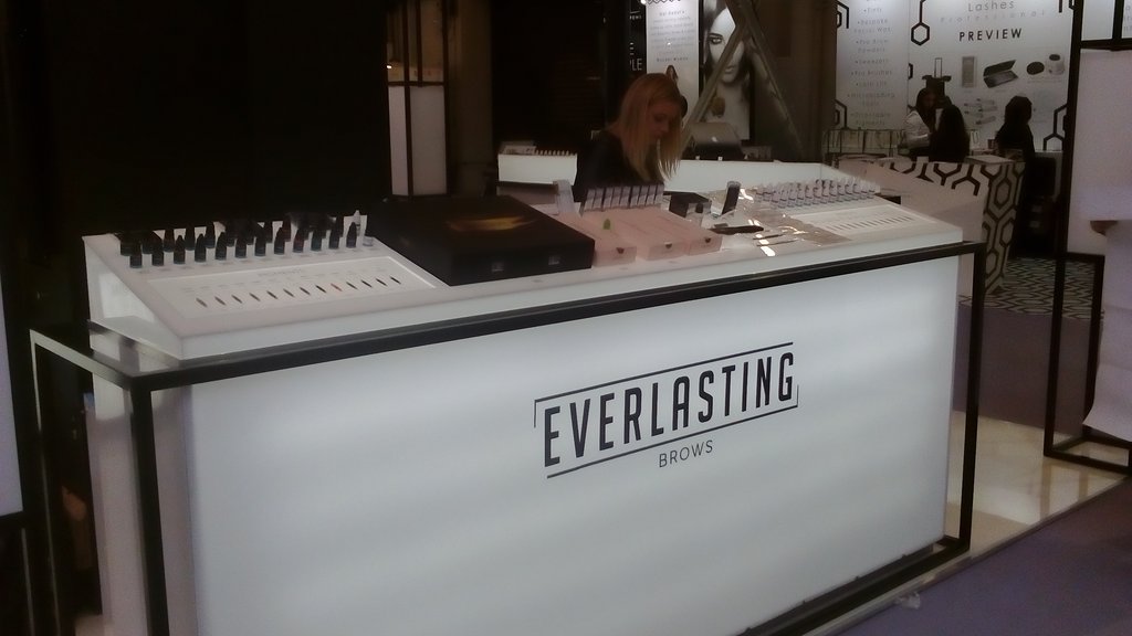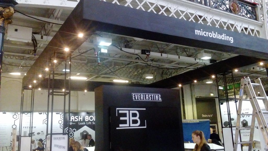 Nowoczesne stoisko o powierzchni około 50 m2 na targi kosmetyczne Olympia Beauty 2017 w Londynie w hali Olympia London – Kensington z meblami indywidualnymi z podświetlanymi panelami regałem ze ścianą z ekranami bezszwowymi i z zadaszeniem w formie belki z podświetleniem opartej na czterech słupach z dodatkowym nadwieszeniem. Podłoga stoiska jako poszycie podniesione z panelami biały połysk. Dodatkowo na stoisku znajdowały się indywidualne panele 3D reklamowe o indywidualnym wzorze wycinanym CNC 3D jak i ekspozytory z pleksiglas z podświetleniem LED na kosmetyki i inne inserty kosmetyczne. Nowatorskim rozwiązaniem były mobilne kontenerki z panelami świecącymi zasilane akumulatorami.