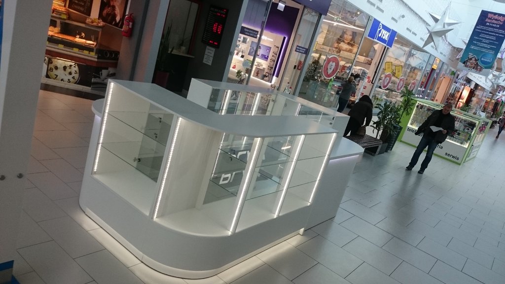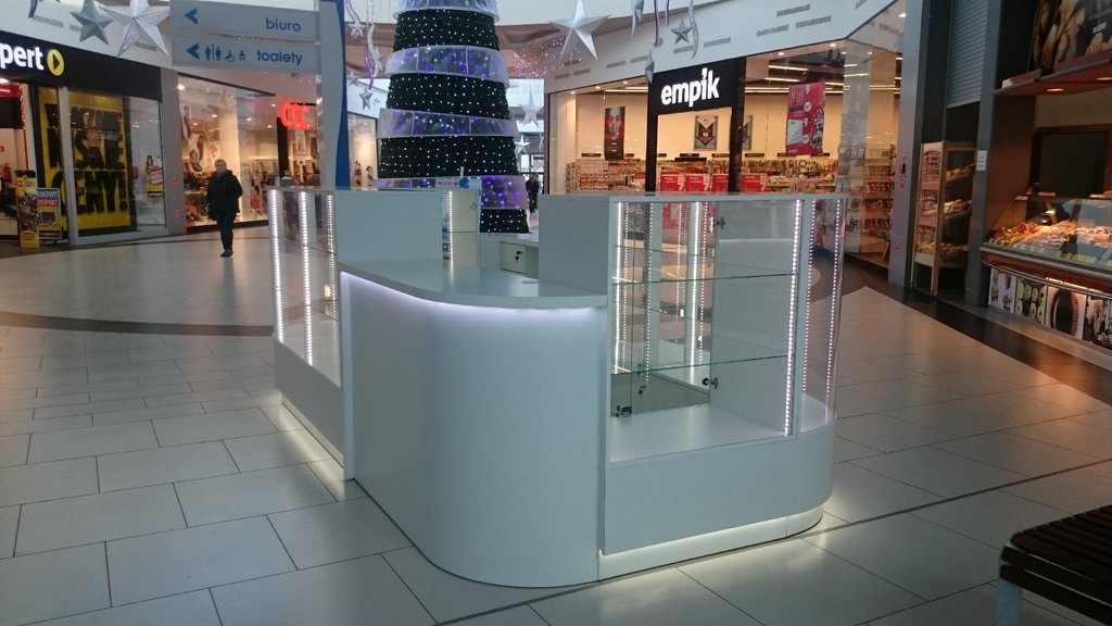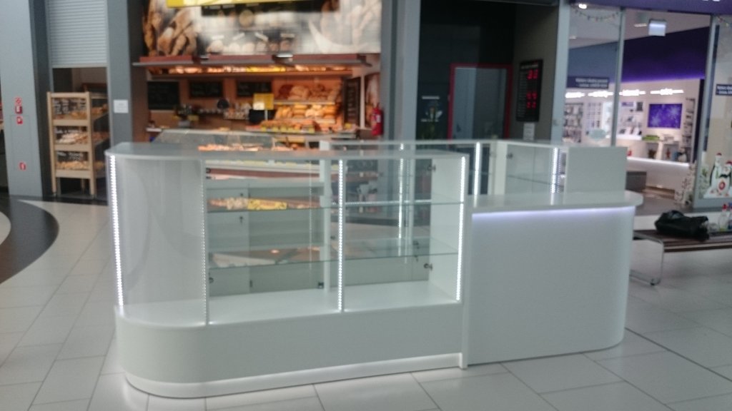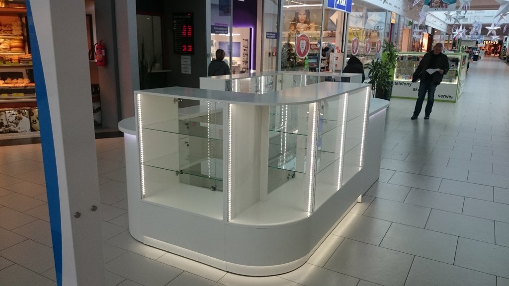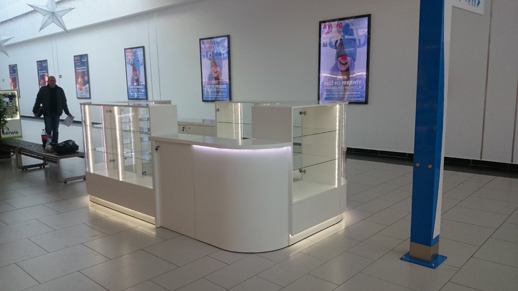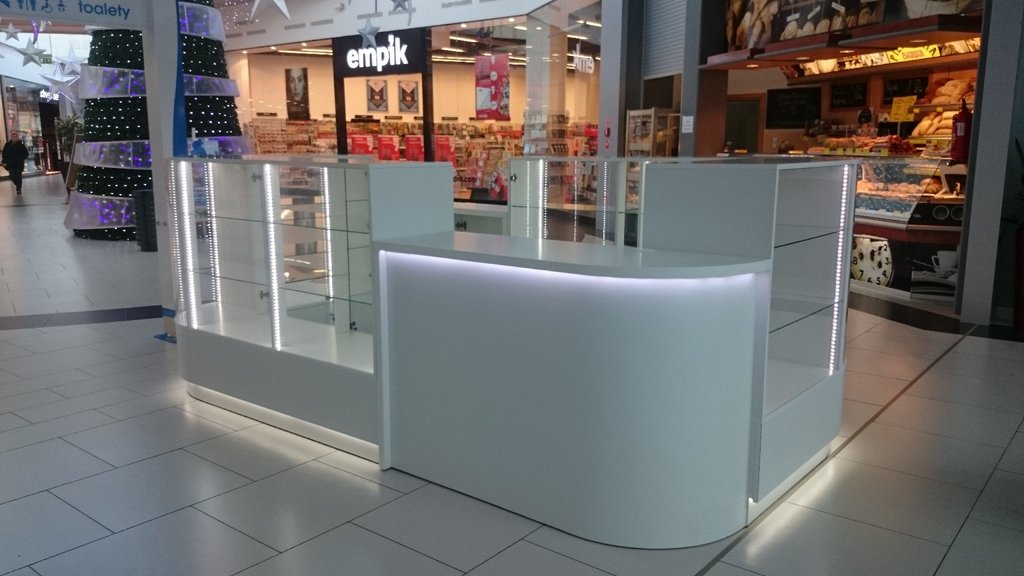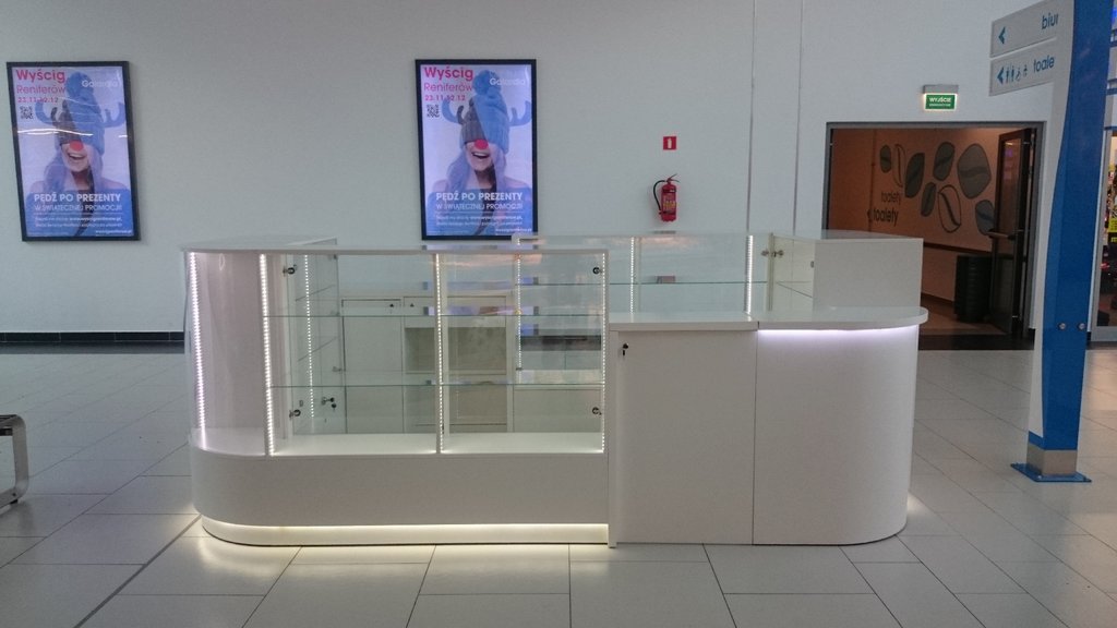 Przedstawione zdjęcie w wersji o lepszej jakości zawiera takie opcje jak: nóżki chromowane, część dolną i korpusy witryn z płyty meblowej lakierowanej na wysoki połysk w kolorze białym, blaty w ladach kasowych z płyty meblowej oklejonej okleiną HPL biały połysk, szkło w witrynach i szkło zaokrąglone w narożnikach, półki narożne i półki w witrynach szklane, szuflady zamiast szafek w części dolnej, podświetlenia LED.