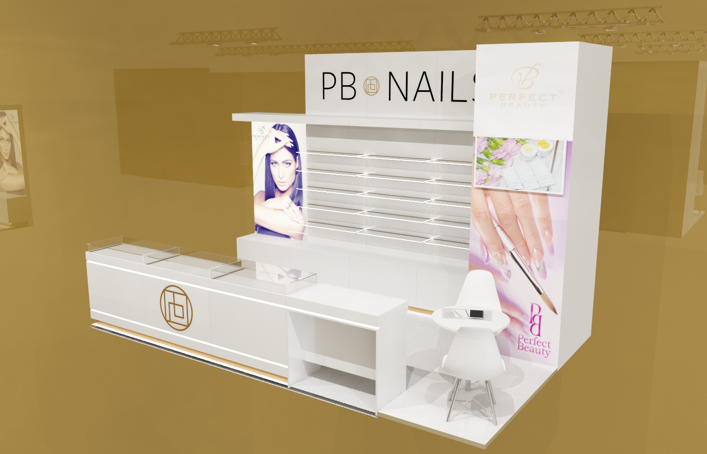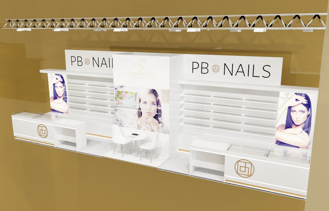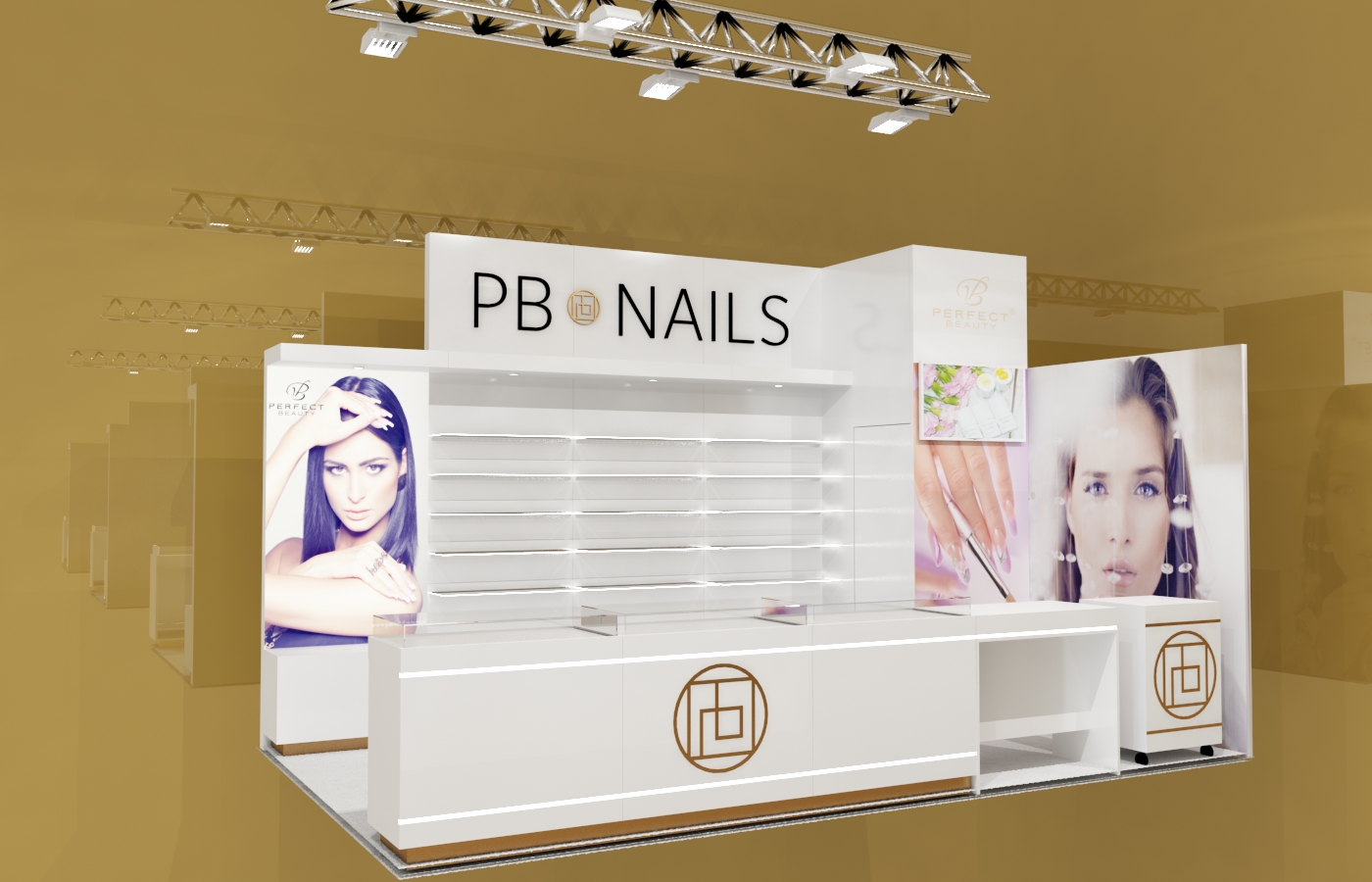 Przedstawiamy nowe stoisko na targi Beauty Forum Warszawa, Beauty Vision Poznań, targi kosmetyczne LNE Kraków jako stoisko indywidualne, wielorazowe dla różnych powierzchni, to znaczy zaprojektowane jako stoisko modułowe z możliwością różnych aranżacji. Jak widać branża Beauty, kosmetyczna oraz z lakierami hybrydowymi to nasza specjalność, a nasza firma targowa realizuje wiele tego typu zabudów wystawienniczych. Stoisko wykonane w całości z płyty + laminatu HPL biały połysk. Elementy i akcenty z laminatu HPL lustrzany złoty i miedziany oraz pleksiglas lustrzanej złotej i miedzianej. Półki ze szkła hartowanego podświetlane krawędziowo. Lady w połysku z podświetleniem LED frontu oraz cokołu z gablotami szklanymi klejonymi UV. Stoisko kosmetyczne Perfect Beauty – PB Nails jest nowoczesne, modne w połysku, eleganckie i białe ze złotymi wstawkami czyli zgodne z aktualnymi trendami.