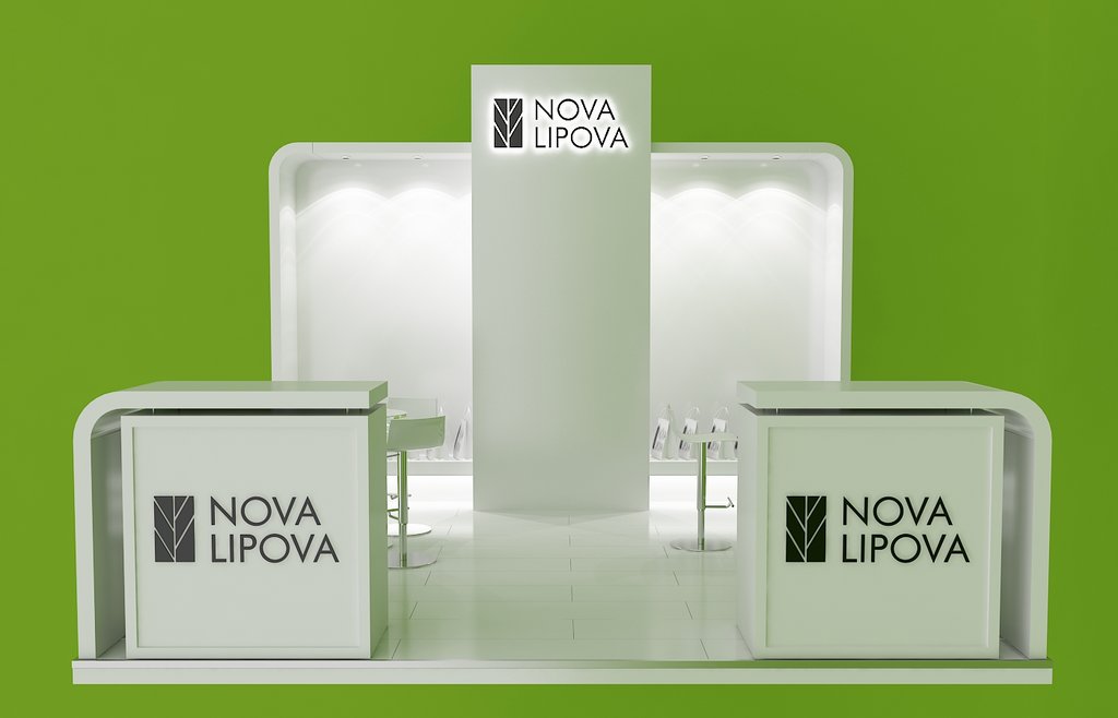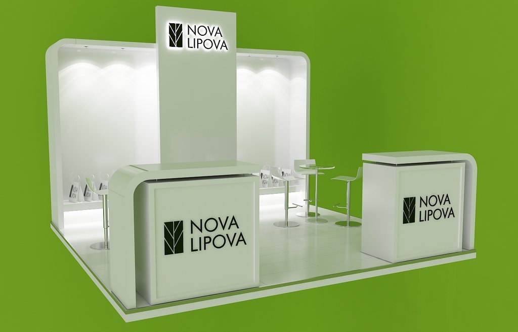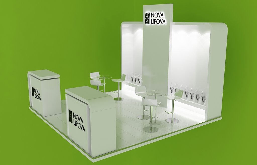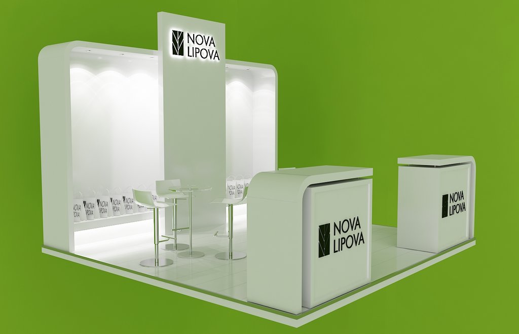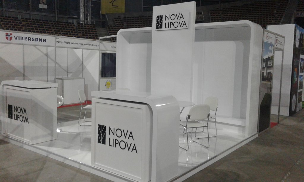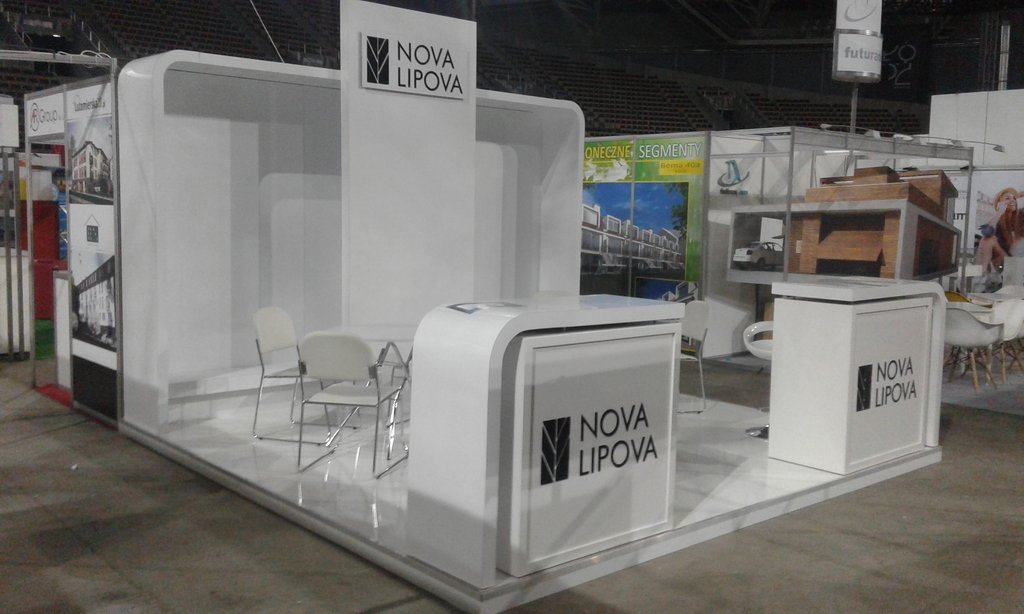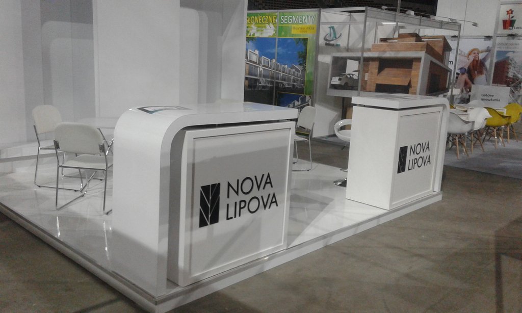 Stoisko o powierzchni około 10 m2 na targi deweloperskie. Stoisko z podłogą podniesioną z panelami biały połysk, ze ścianą tylną z łukami oraz ladami indywidualnymi z zaokrągleniami. Nowoczesne stoisko o minimalistycznym charakterze w śnieżno białych barwach. Stoisko wielorazowe budowlane z laminatem HPL, płytami HIPS biały połysk na kilka wydarzeń i imprez targowych w Łodzi i Warszawie. Powściągliwe ologowanie 3D z pleksiglas z efektem halo z podświetleniem LED.