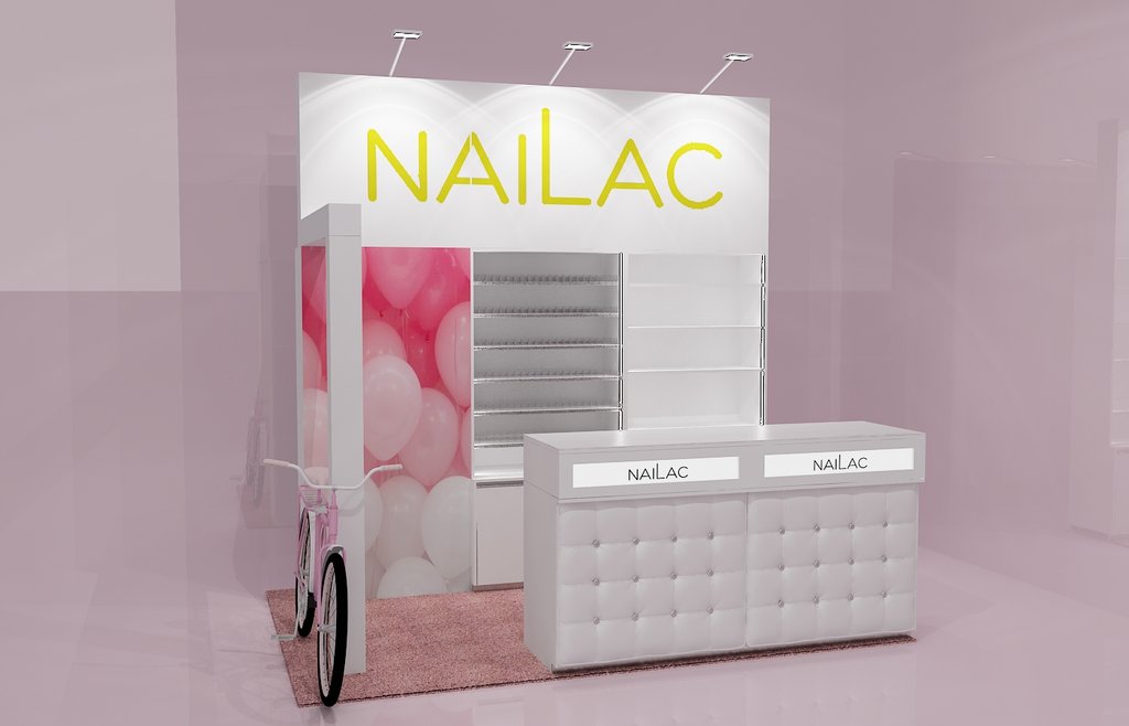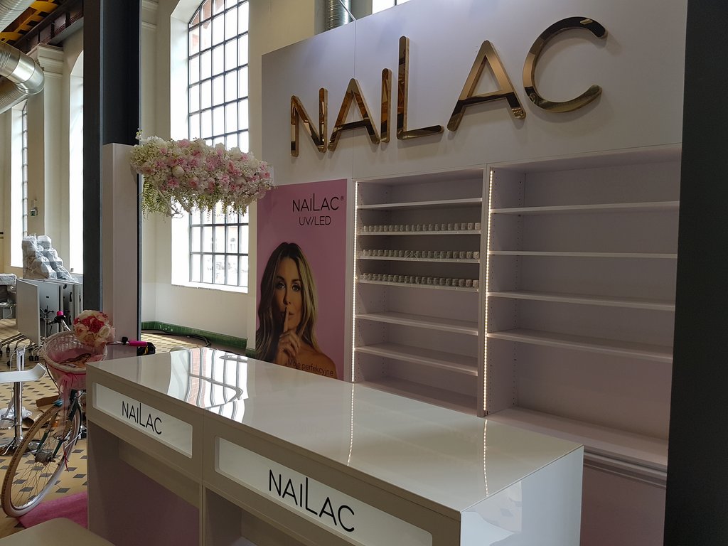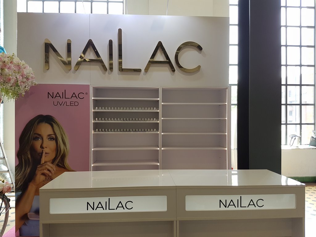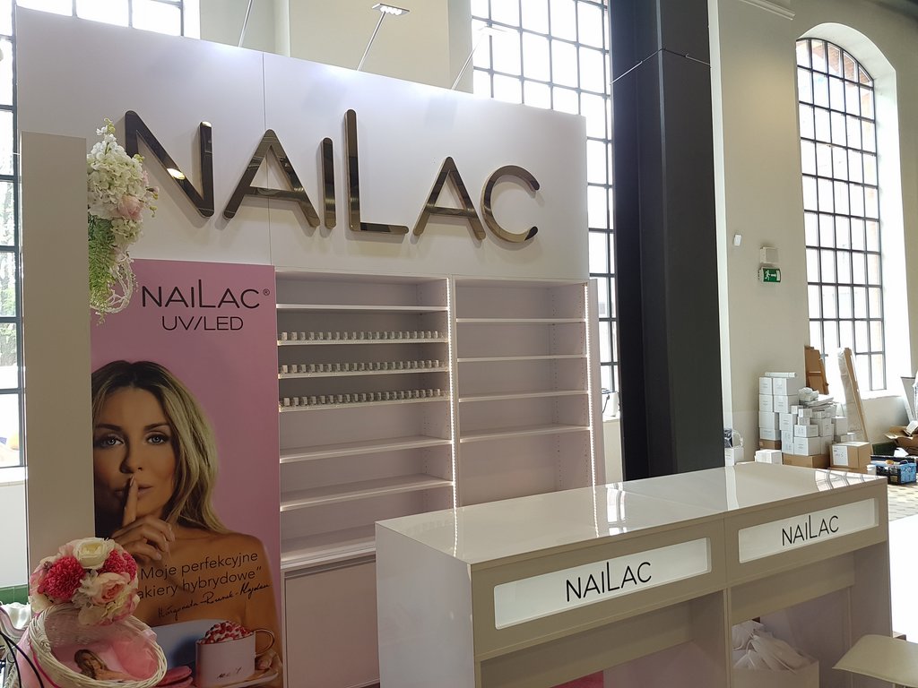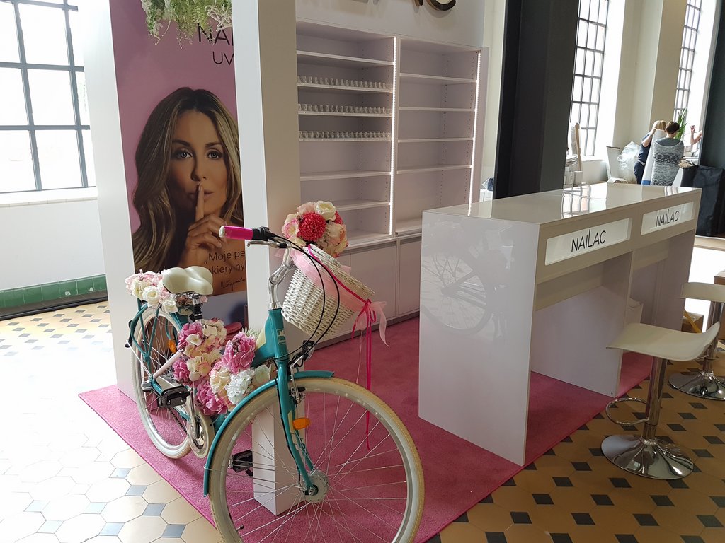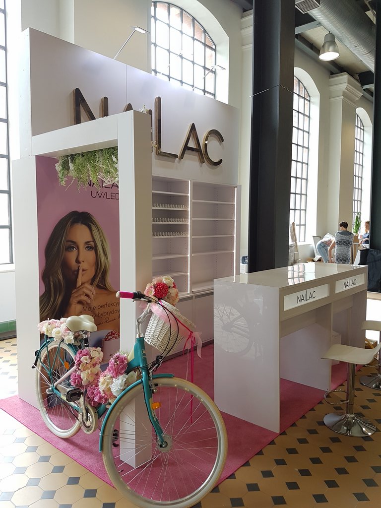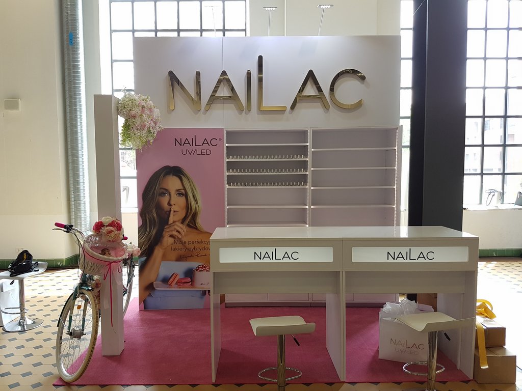 Przedstawiamy małe stoisko konferencyjne na imprezę Festiwal See Bloggers VI edycja w EC1 w Łodzi o powierzchni 6 m2. Stoisko jest wielorazowe z możliwością montażu i demontażu w modułach zatem nadaje się na eventy i konferencje w Poznaniu, Warszawie, Krakowie, Gdańsku i wielu innych miastach w Polsce. Stoisko kosmetyczno – konsultacyjne zawierało regały systemowe (wysuwane półki z prowadnicami na lakiery oraz półki regulowane w zabudowie indywidualnej), wykładzinę różową na zamówienie, grafikę na płycie HIPS z drukiem UV oraz dwa biurka do manicure z podświetlanym kasetonem z logo. Całość uzupełniał indywidualny napis Nailac (firma produkująca lakiery UV i hybrydowe) wykonany ze styroduru malowanego na złoto z licem z pleksiglas złotej (złote lustro). Całość uzupełniała ażurowa belka z opartym ozdobnym rowerem oraz girlandą kwiatów. Stoisko zawierało też Markę sygnuje gwiazda Małgorzata Rozenek pojawiająca się na zdjęciach marki oraz na grafice stoiska. Takie stoisko można już mieć za cenę niecałych piętnastu tysięcy złotych brutto kompleksowo z montażem i demontażem na własność.