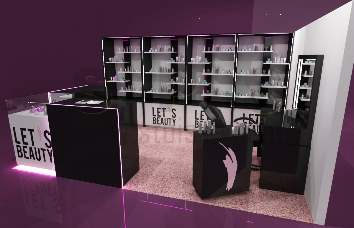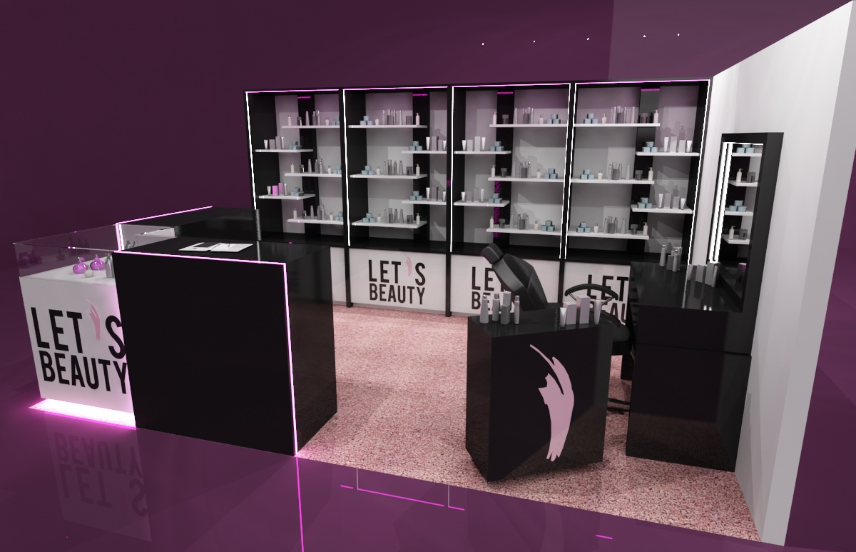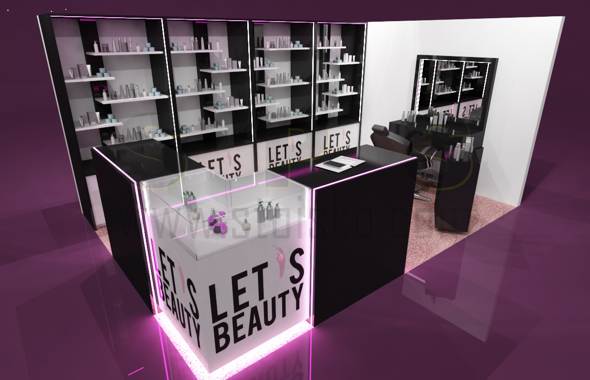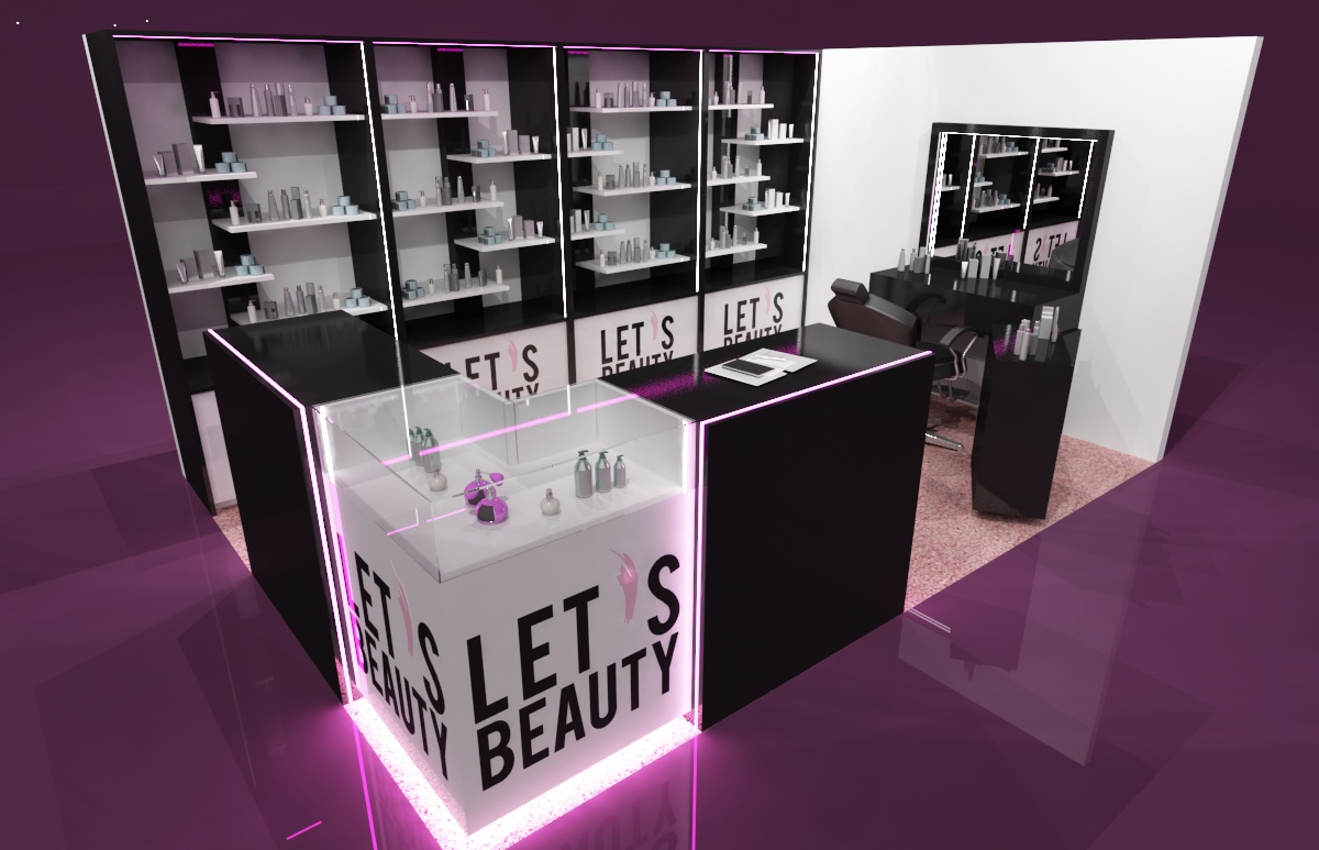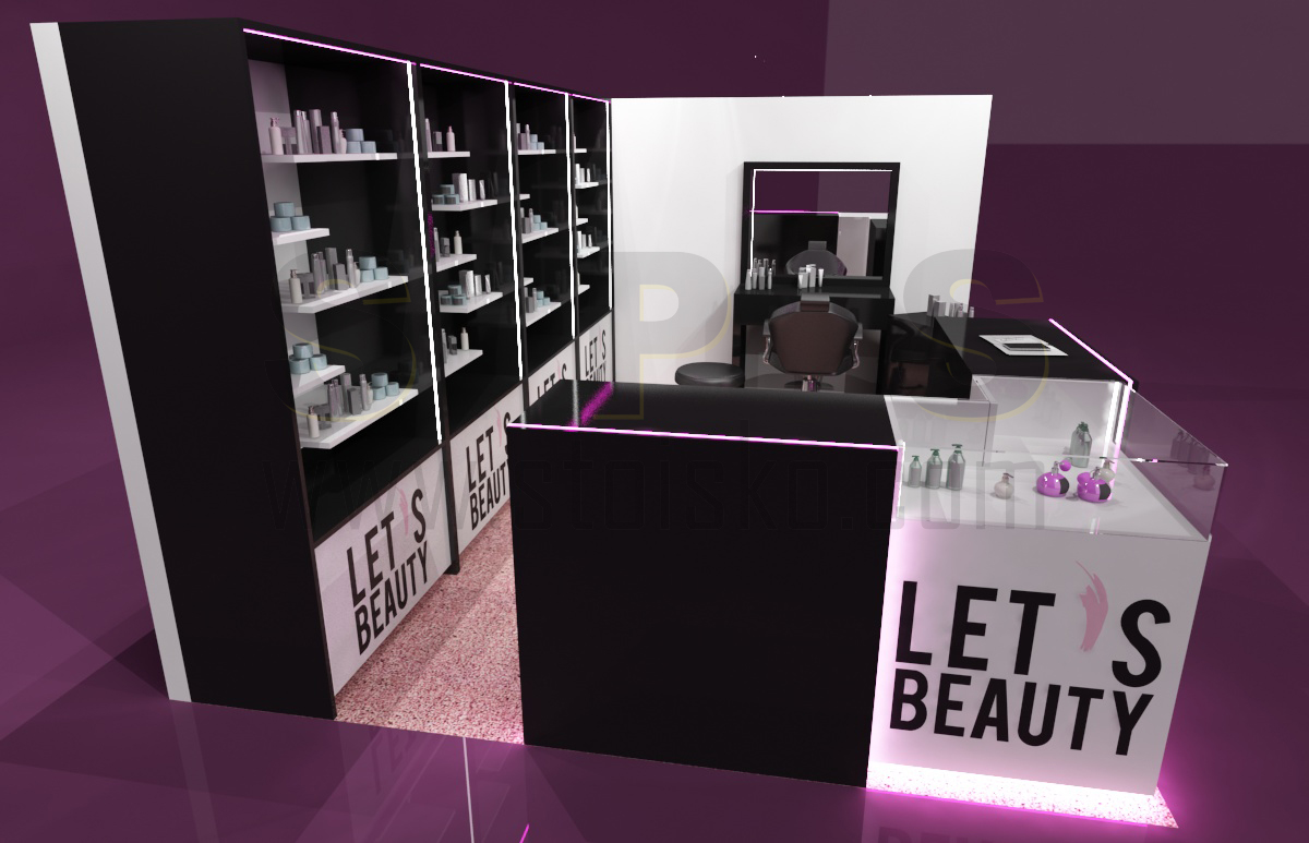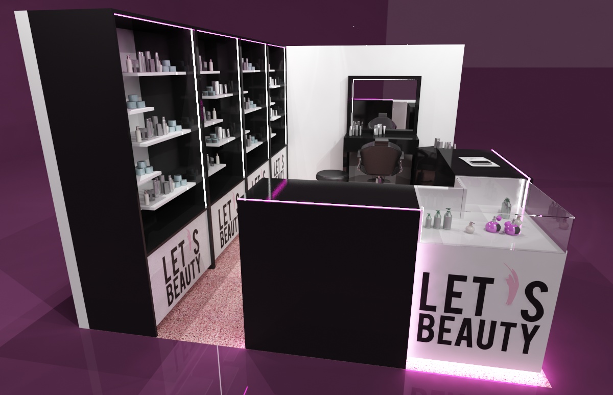 o powierzchni 15 m2 (obrys placu 3 x 5 m) jako stoisko modułowe, wielorazowe z możliwością różnych aranżacji. Stoisko zawiera nietypowe regały z półkami i szufladami oraz toaletkę przy ścianie z mobilnym kontenerkiem. Wszystkie elementy są w białym i czarnym połysku. Narożne lady i gabloty do prezentacji produktów ulokowane zostały w narożniku stoiska. Całość dopełniają akcenty w postaci różowo-pudrowej wykładziny oraz podświetlenia LED w kolorze różowym. Stoisko w kolorach bazowym można już mieć w cenie 15000 zł, a w jakości TOP w połysku z lakierowanymi elementami w cenie od 30000 zł. Przedsiębiorstwo targowe SPS stoisko.com Sp. z o. o. realizuje stoiska kosmetyczne, medyczne i odzieżowe na targi i konferencje kompleksowo od projektu, poprzez produkcję, reklamę, grafikę, na montażach, demontażach, serwisach i magazynowaniu oraz konserwacji kończąc…
