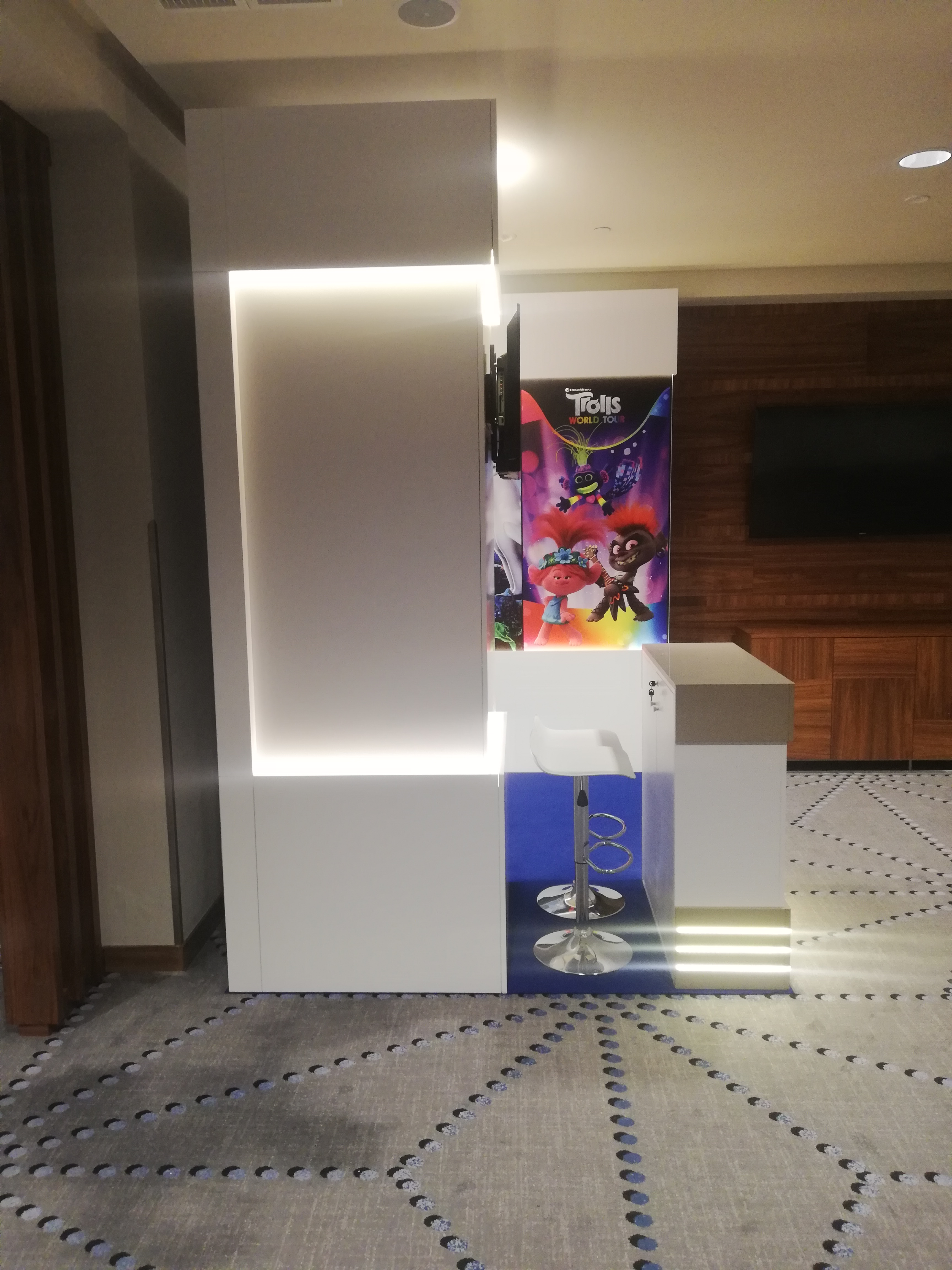 Zajeliśmy się tym projektem kompleksowo – od koncepcji i projektu, poprzez produkcję ścian, mebli, reklamę i grafikę, na odbiorach, transporcie, montażu i demontażu kończąc. W trakcie prac powstało kilka wariantowych wersji z dostosowaniem do różnych ustawień mebli i innych grafik zamawiającego. Do wykonania grafik na ścianach wykorzystaliśmy druk UV na płytach HIPS. Cała zabudowa postawiona została na grubej wykładzinie PPOŻ w kolorze granatowym.