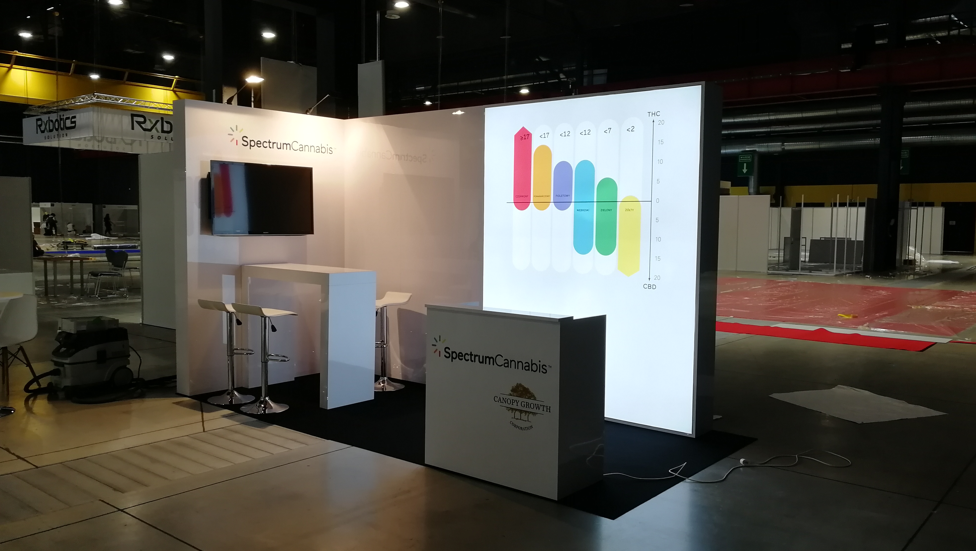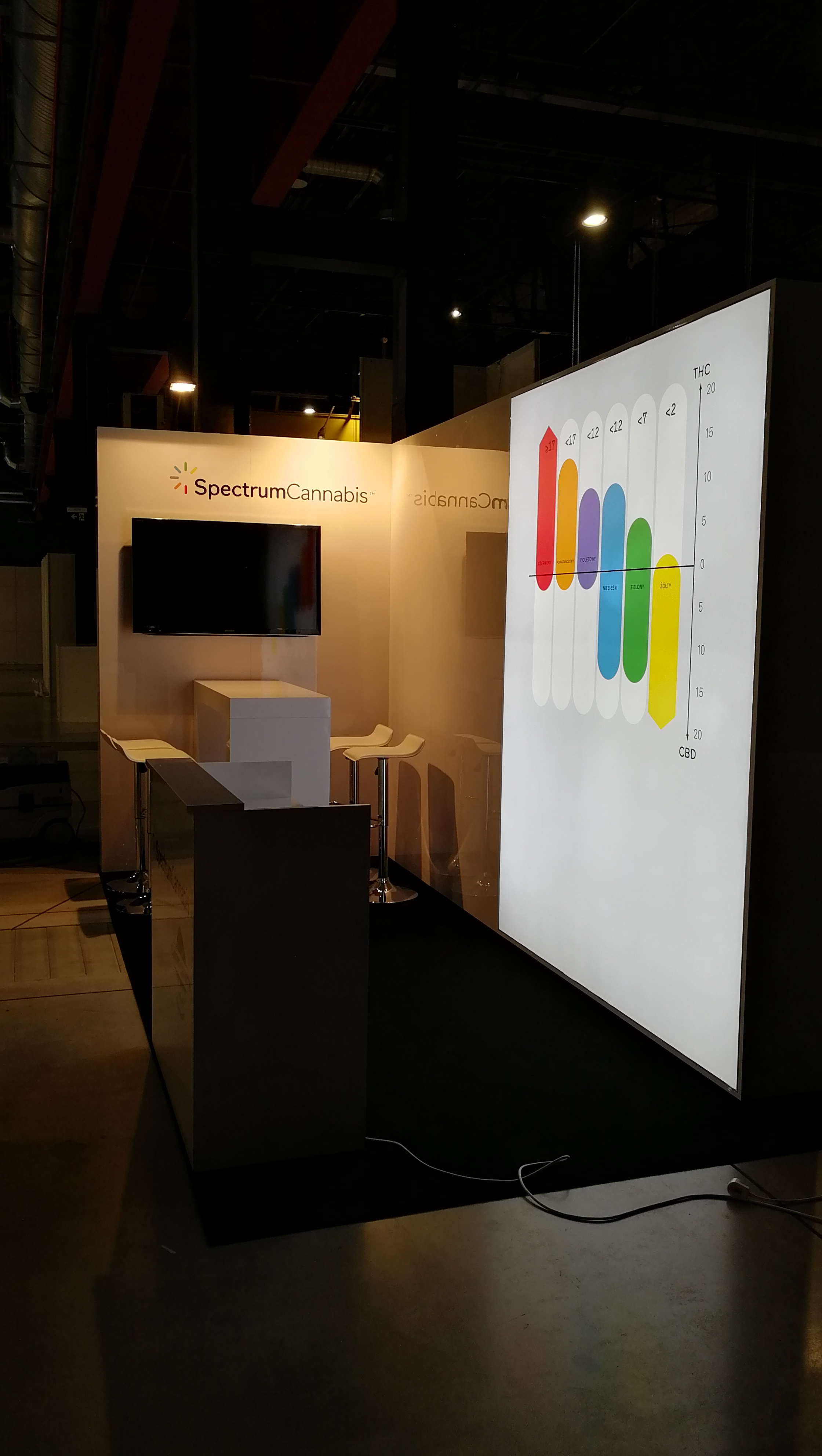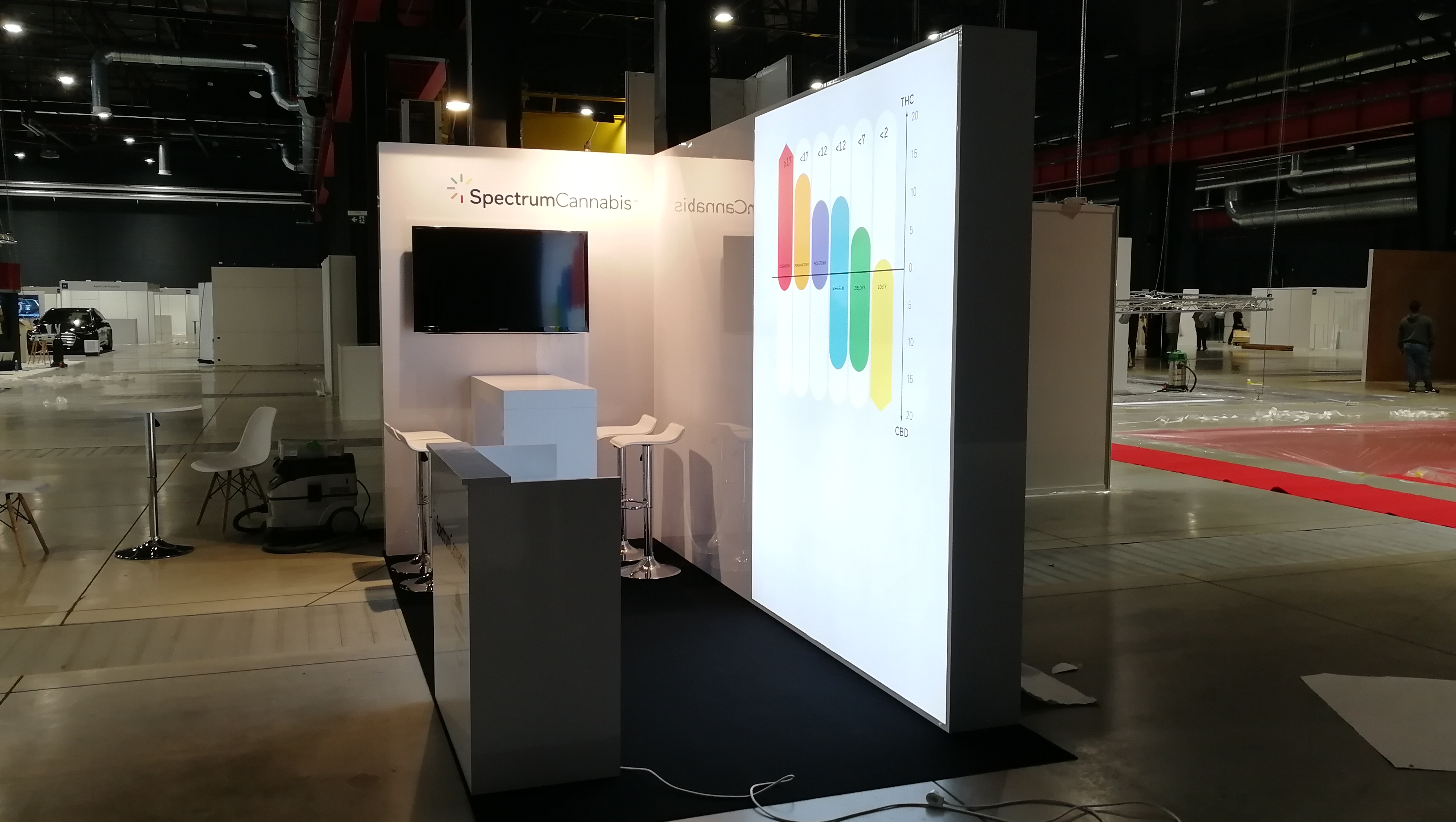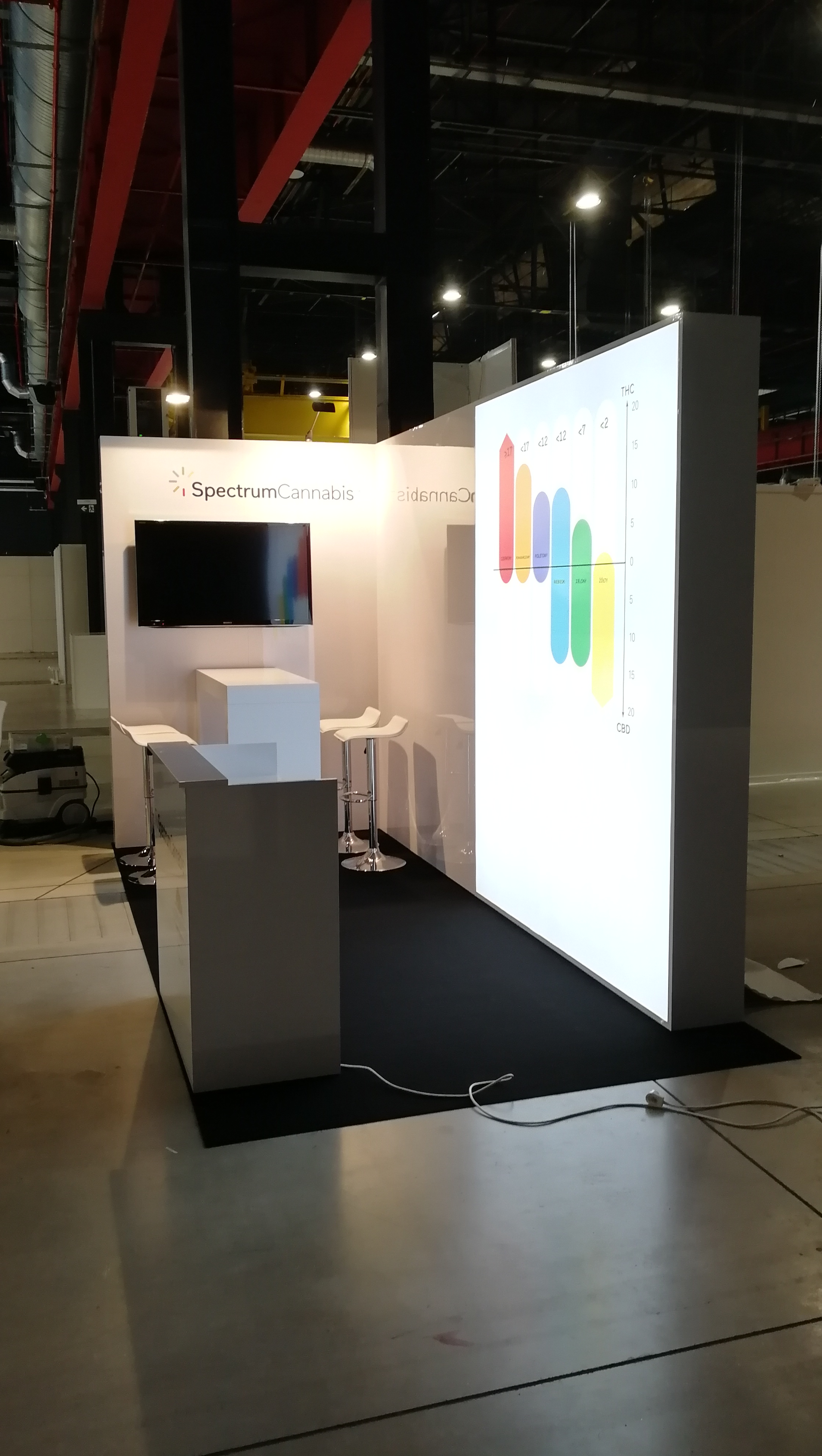 Tym razem stworzyliśmy i montowaliśmy stoisko na konferencję Warsaw Farmacy Show 2019 w Centrum Targowo-Kongresowym Global EXPO w Warszawie przy ulicy Modlińskiej, dla firmy Spectrum Cannabis. Niewielkie, acz bardzo ciekawe stoisko narożne o powierzchni 8 m2 miało obrys 4 x 2 m i mieściło się w wysokości 250 cm. Stoisko wykonano na wykładzinie dywanowej wysokiej jakości w kolorze czarnym. Z podłogą kontrastowały białe ściany lakierowane na wysoki połysk. Cześć tylnej ściany przeznaczono na grafikę systemową tekstylną z podświetleniem LED montowaną w stelażu aluminiowym. Dla stoiska zaprojektowano także indywidualną ladę informacyjno-recepcyjną orz ciekawy wysoki stolik dla 4 krzeseł barowych. Na ścianie znalazł się też średniej wielości telewizor oraz oświetlenie górne. Z ologowania prócz wspomnianej podświetlanej ściany systemowej znalazło się logo klienta wykonane z folii plotowanej, wycinanej i to zarówno na ścianie, jak i na ladzie. Stoisko jest w pełni modułowe oraz wielorazowe dzięki czemu można je przearanżować na inną powierzchnię placu lub powiększyć dobudowując kolejne ściany, moduły. I na pewno pojawi się jeszcze na wielu imprezach i konferencjach.