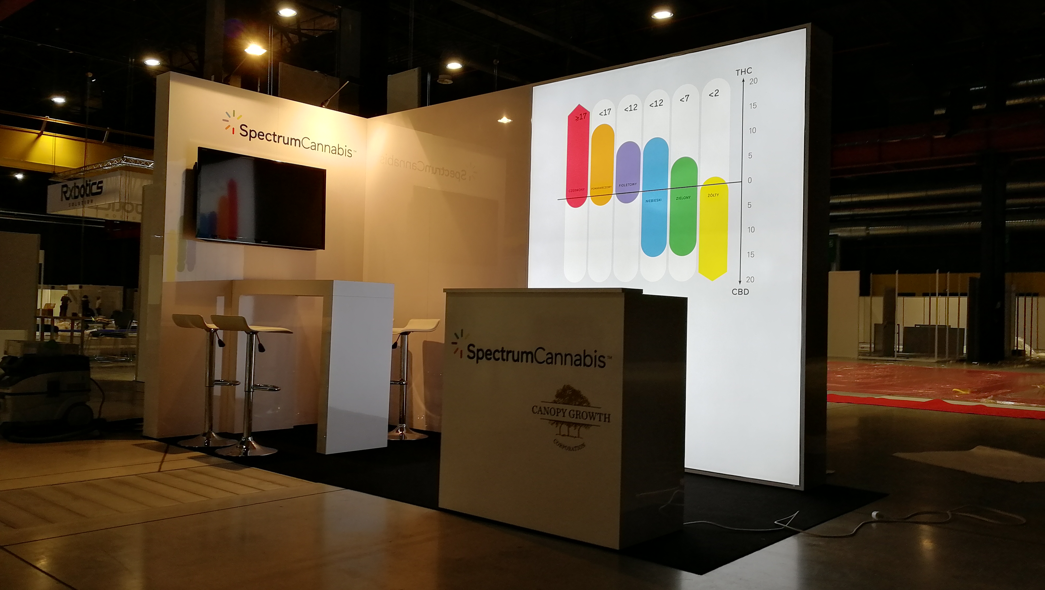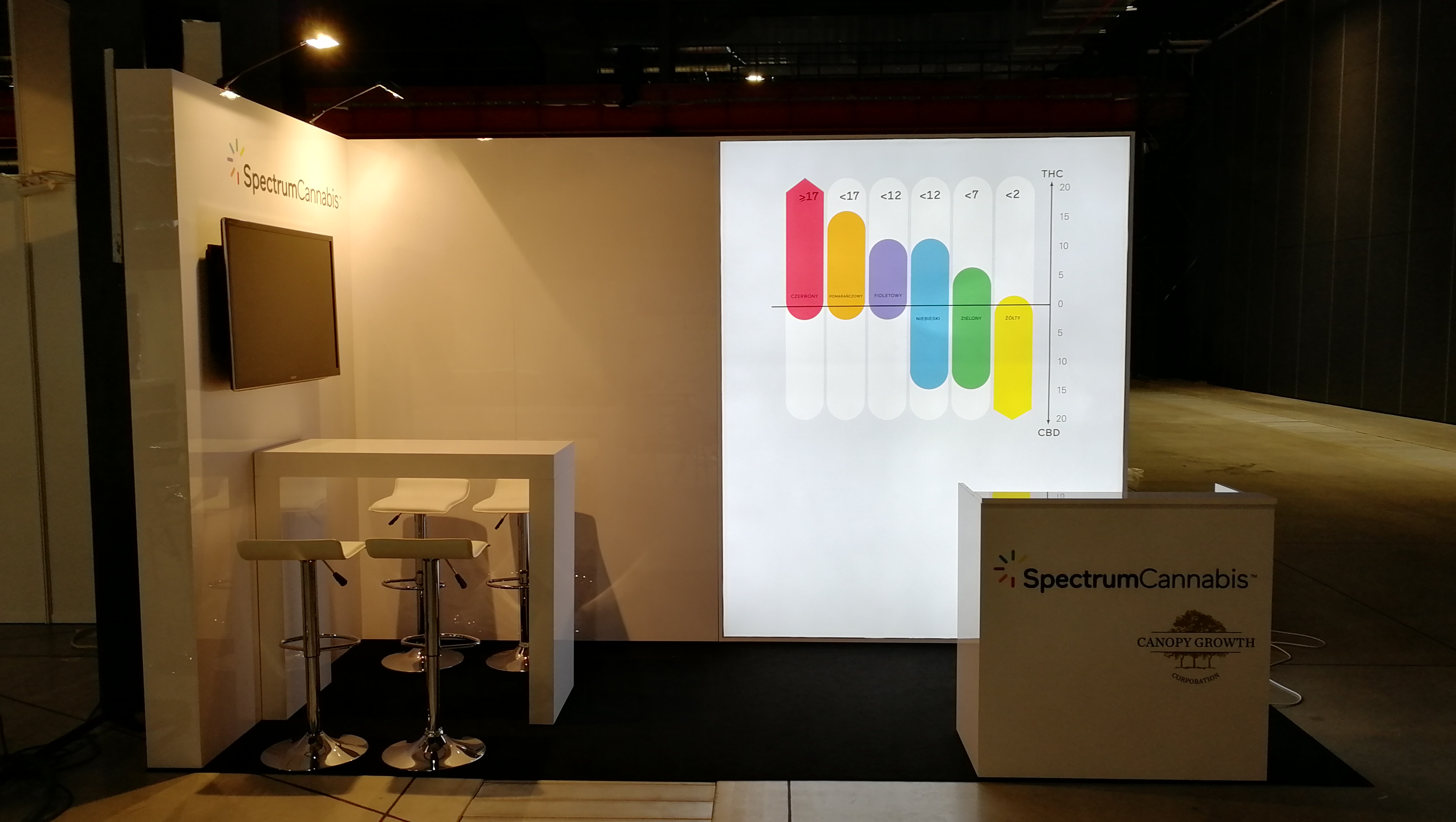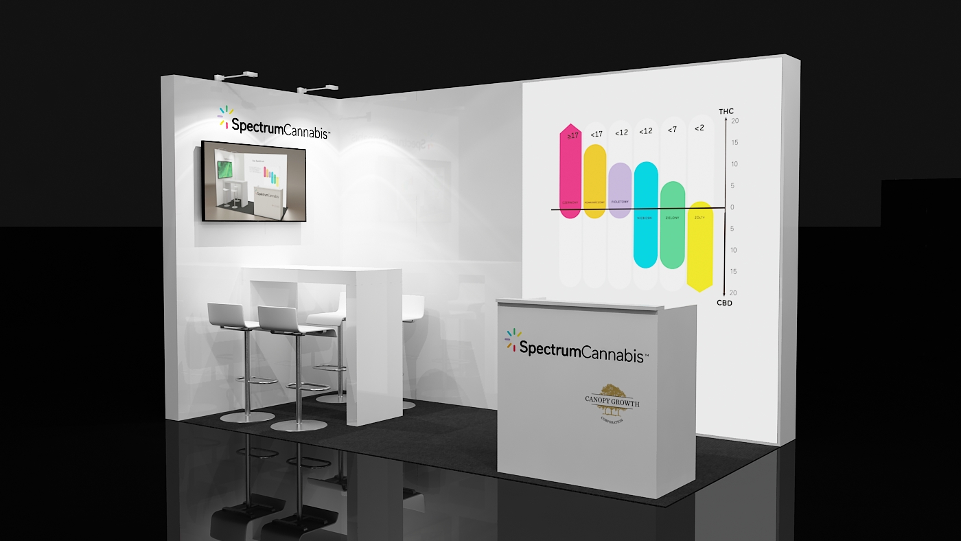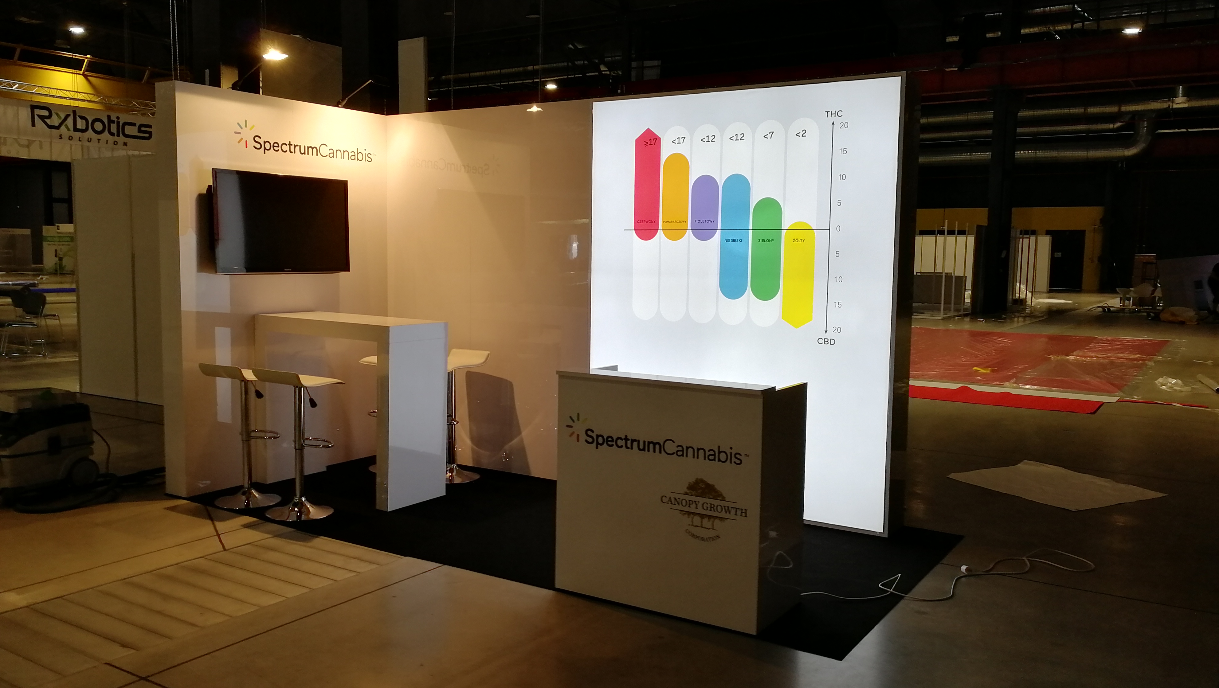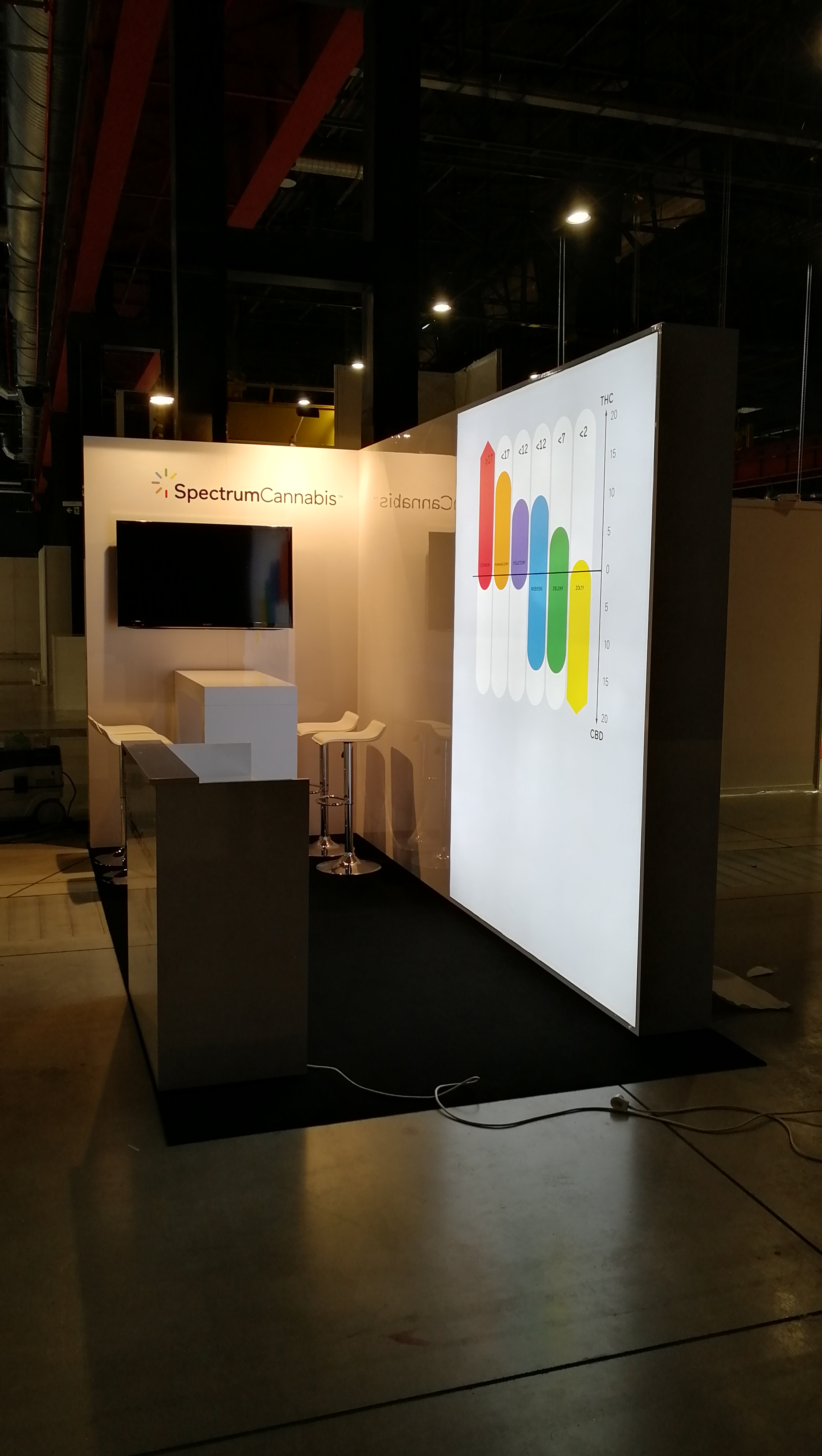 Tym razem stworzyliśmy i montowaliśmy stoisko na konferencję Warsaw Farmacy Show 2019 w Centrum Targowo-Kongresowym Global EXPO w Warszawie przy ulicy Modlińskiej, dla firmy Spectrum Cannabis. Niewielkie, acz bardzo ciekawe stoisko narożne o powierzchni 8 m2 miało obrys 4 x 2 m i mieściło się w wysokości 250 cm. Stoisko wykonano na wykładzinie dywanowej wysokiej jakości w kolorze czarnym. Z podłogą kontrastowały białe ściany lakierowane na wysoki połysk. Cześć tylnej ściany przeznaczono na grafikę systemową tekstylną z podświetleniem LED montowaną w stelażu aluminiowym. Dla stoiska zaprojektowano także indywidualną ladę informacyjno-recepcyjną orz ciekawy wysoki stolik dla 4 krzeseł barowych. Na ścianie znalazł się też średniej wielości telewizor oraz oświetlenie górne. Z ologowania prócz wspomnianej podświetlanej ściany systemowej znalazło się logo klienta wykonane z folii plotowanej, wycinanej i to zarówno na ścianie, jak i na ladzie. Stoisko jest w pełni modułowe oraz wielorazowe dzięki czemu można je przearanżować na inną powierzchnię placu lub powiększyć dobudowując kolejne ściany, moduły. I na pewno pojawi się jeszcze na wielu imprezach i konferencjach.