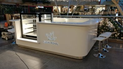 Już po raz kolejny wykonaliśmy wyspę do prestiżowej i znanej Galerii handlowej Złote Tarasy w Warszawie. Tym razem była to wyspa gastronomiczna Sushi Royal dla marki Japanese Food Polska. Zgodnie z wymogami galerii wyspa była obłożona z zewnątrz materiałem Corian kolor biały połysk – glacier white. Również blaty zewnętrzne i wewnętrzne robocze oraz łuki były obłożone kompozytem najwyższej jakości – Corian. Natomiast wyspa od wewnątrz oraz fonty wewnętrzne szafek i szuflad były wykonane z MDF’u lakierowanego na wysoki połysk. Wszystkie materiały posiadały certyfikaty trudnozapalności i spełniały wymagania centrum handlowego. Przy koordynacji zespołu SPS stoisko.com uczestniczyliśmy w całym procesie od koncepcji, poprzez projekt wykonawczy, warsztatowy i architektoniczny w celu uzyskania pozwoleń i innych dokumentów wymaganych przez galerię, jak karta obiegowa, na produkcji i odbiorach kończąc. Na uwagę zasługuje też frezowane w Corianie logo, z podświetleniem krawędziowym liter z pleksiglas z czarnym licem. Cokoły ze stali oraz lodówka z czarnymi akcentami tworzą wyspę prostą, elegancką i minimalistyczną co wyraża się zarówno w formie jak i wysokiej jakości materiałach. Wewnątrz zastosowano zamknięty obieg wody z elektryczną pompką, specjalnym kranem oraz podgrzewaczem przepływowym. Również elektryka była zgodna ze sztuką z zastosowaniem tablicy rozdzielczej TE z bezpiecznikami oraz liczne gniazda i włączniki poprowadzone w całej wyspie. Zatem wyspa dzięki swej technologii pozwala zarówno na sprzedaż, jak i produkcję garmażu typu rolki sushi i innego podobnego.