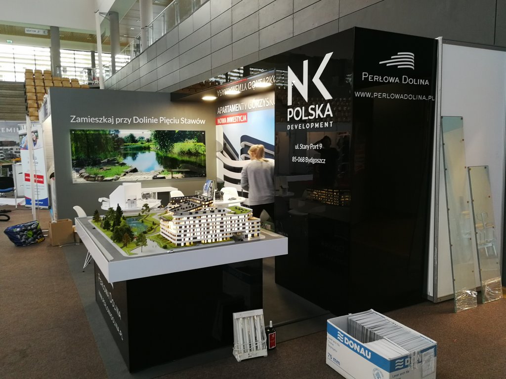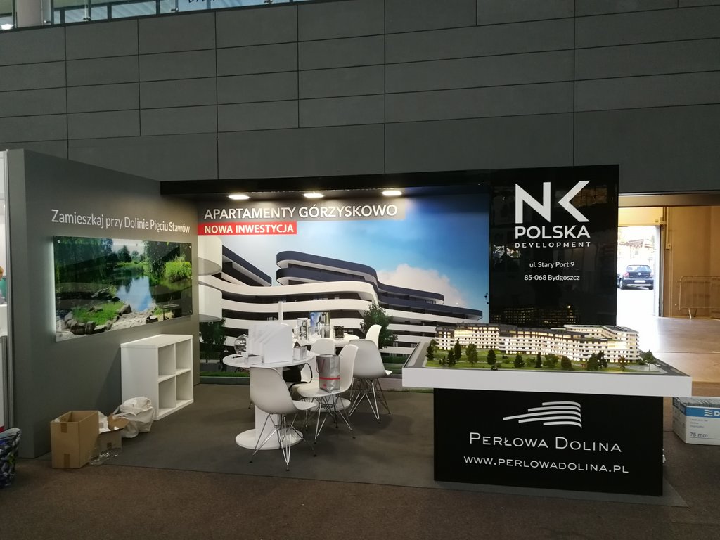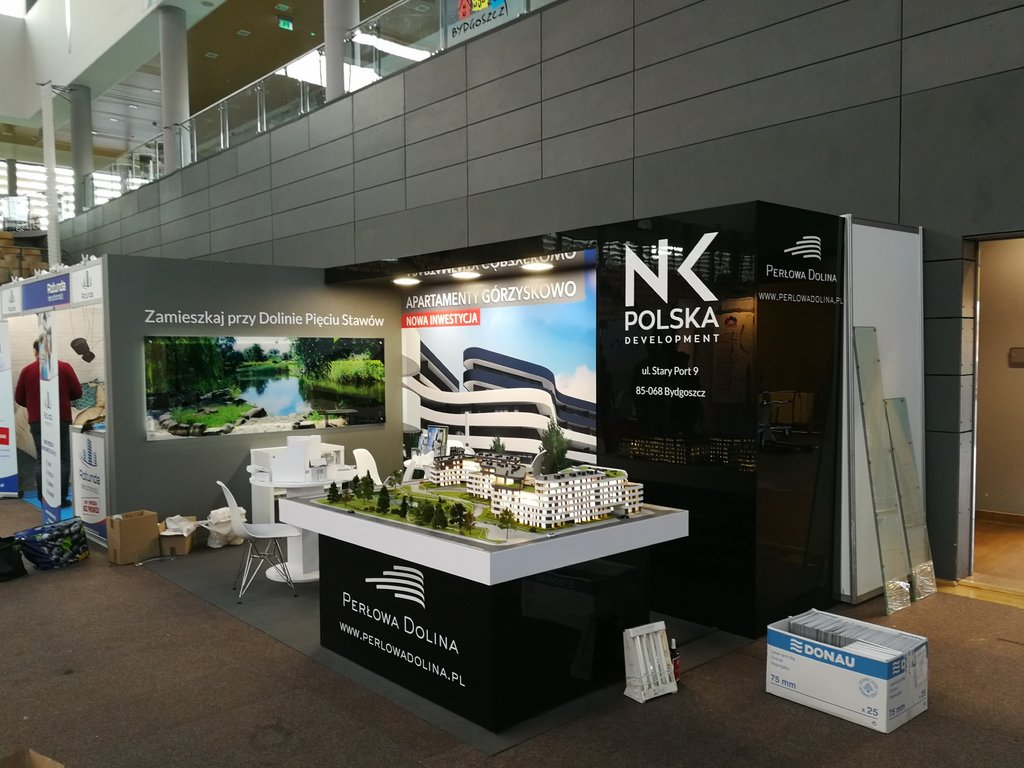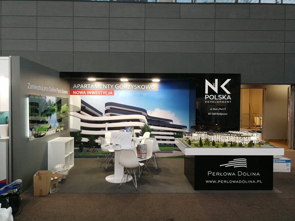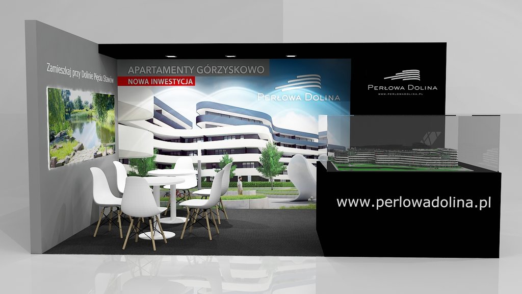 Przedstawiamy kolejne stoisko deweloperskie o powierzchni 15 m2 (3 x 5 m obrysu placu targowego) tym razem dla inwestycji z Bydgoszczy pod nazwą Perłowa Dolina /Apartamenty Górzyskowo zlokalizowanej przy Dolinie Pięciu Stawów przy ulicy Stary Port w Bydgoszczy. Stoisko było przygotowane na zjazd /konferencję mieszkaniową w Bydgoskiej Artego Arenie. Stoisko posiadało posadzkę w postaci wykładziny PPOŻ wysokiej jakości w kolorze dopasowanym do koloru ściany i grafiki. Było to stoisko narożne z boczną krótszą ścianą wykończoną MDF’em szpachlowanym, szlifowanym i malowanym na kolor szary. Tylna ściana o szerokości 5 metrów posiadała grafikę HIPS biały połysk z drukiem UV LED z wizualizacją wielkoformatową inwestycji. Tylna ściana posiadała również zaplecze o wymiarze 120 x 90 cm z drzwiami wejściowymi z zadaszeniem nad grafiką, całość wykonane w czarnym połysku (docinane płyty HIPS czarny połysk). Tym materiałem została również obłożona podstawa pod makietę klienta. Zadaszenie posiada oświetlenie w postaci dużych kwadratowych paneli ledowych. Na ścianach oraz podstawie znajduje się liczne ologowanie, logotypu oraz grafika wykonane z wycinanej laserowo pleksiglas biały połysk gr. 3 mm lub folii plotowanej i wycinanej umieszczanej na folii transportowej w kolorze biały połysk. Na stoisku znajdowały się również meble targowe ruchome w postaci indywidualnych stolików targowych biały połysk i nowoczesnych krzesełek z tworzywa z elementami chromowanymi. Stoisko wyprodukowano jako wielorazowe do montażu na 4-6 edycji dla różnych targów deweloperskich i konferencji oraz zjazdów mieszkaniowych z obsługą przedsiębiorstwa targowego SPS stoisko.com Sp. z o. o.