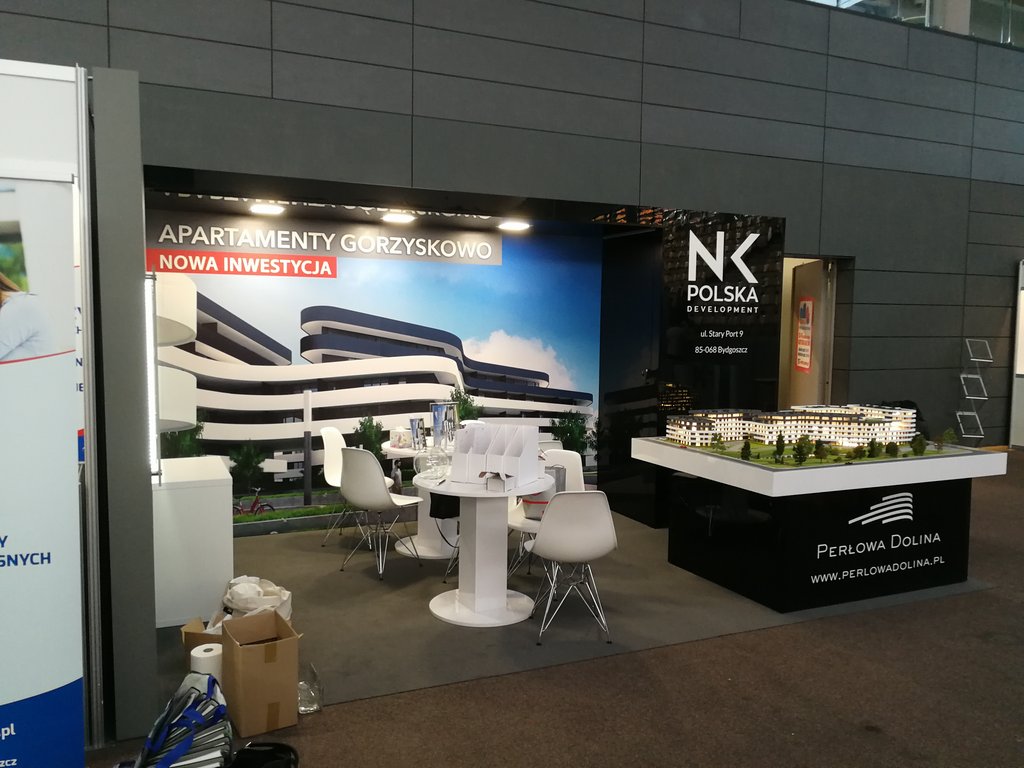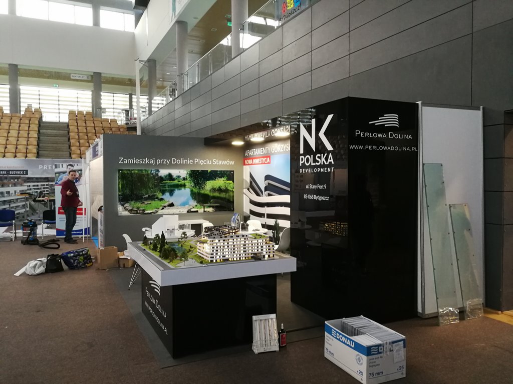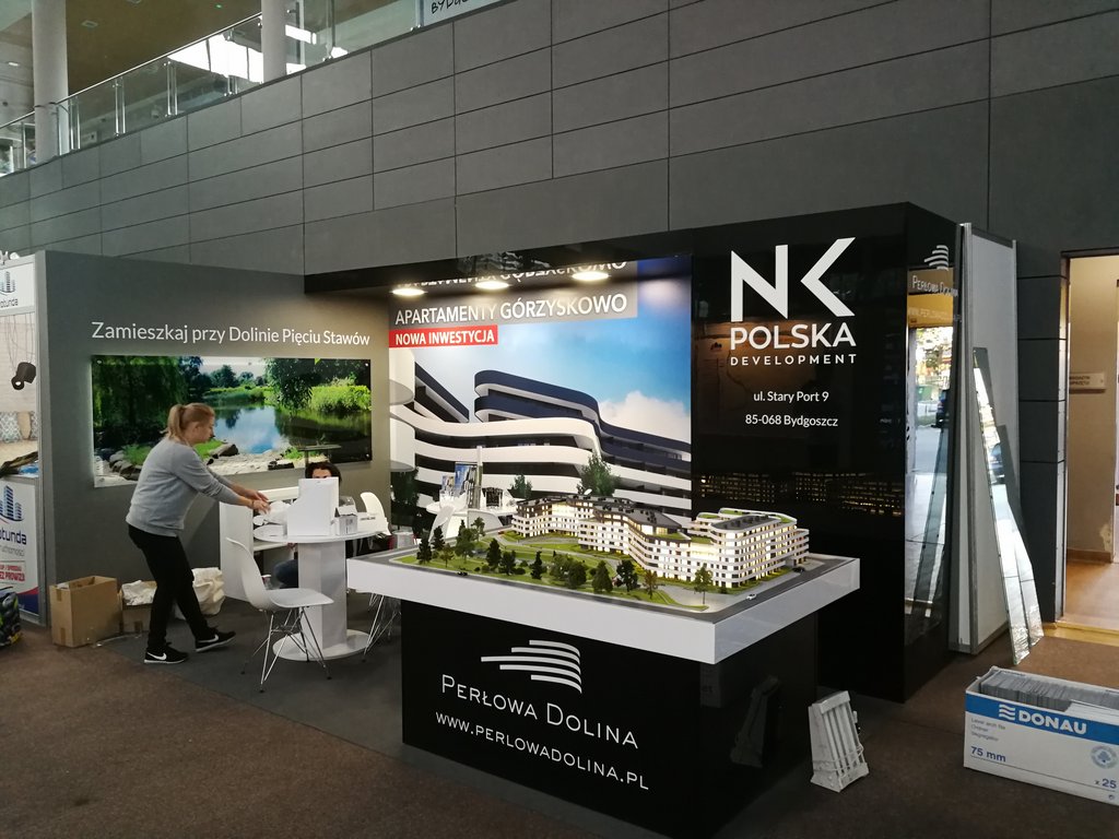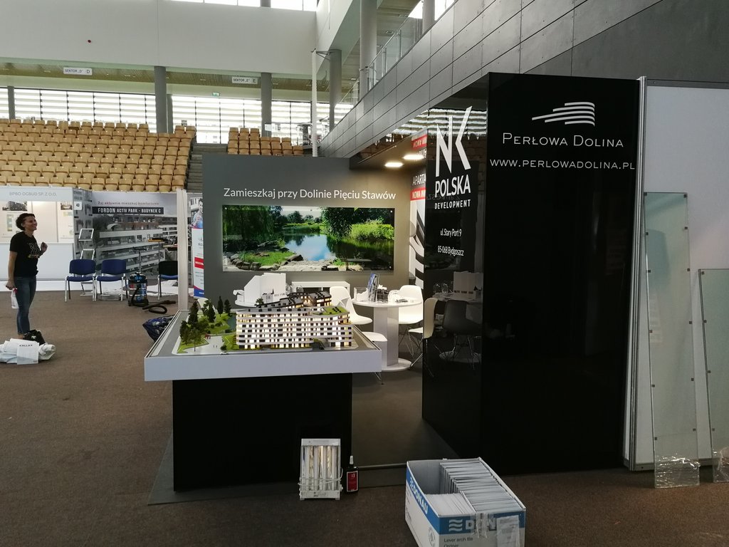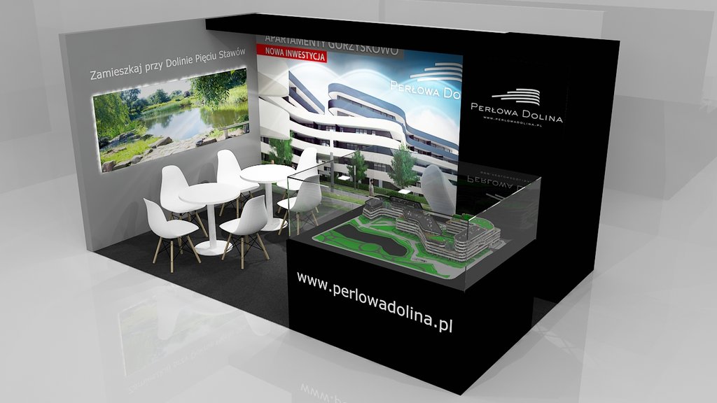 Przedstawiamy kolejne stoisko deweloperskie o powierzchni 15 m2 (3 x 5 m obrysu placu targowego) tym razem dla inwestycji z Bydgoszczy pod nazwą Perłowa Dolina /Apartamenty Górzyskowo zlokalizowanej przy Dolinie Pięciu Stawów przy ulicy Stary Port w Bydgoszczy. Stoisko było przygotowane na zjazd /konferencję mieszkaniową w Bydgoskiej Artego Arenie. Stoisko posiadało posadzkę w postaci wykładziny PPOŻ wysokiej jakości w kolorze dopasowanym do koloru ściany i grafiki. Było to stoisko narożne z boczną krótszą ścianą wykończoną MDF’em szpachlowanym, szlifowanym i malowanym na kolor szary. Tylna ściana o szerokości 5 metrów posiadała grafikę HIPS biały połysk z drukiem UV LED z wizualizacją wielkoformatową inwestycji. Tylna ściana posiadała również zaplecze o wymiarze 120 x 90 cm z drzwiami wejściowymi z zadaszeniem nad grafiką, całość wykonane w czarnym połysku (docinane płyty HIPS czarny połysk). Tym materiałem została również obłożona podstawa pod makietę klienta. Zadaszenie posiada oświetlenie w postaci dużych kwadratowych paneli ledowych. Na ścianach oraz podstawie znajduje się liczne ologowanie, logotypu oraz grafika wykonane z wycinanej laserowo pleksiglas biały połysk gr. 3 mm lub folii plotowanej i wycinanej umieszczanej na folii transportowej w kolorze biały połysk. Na stoisku znajdowały się również meble targowe ruchome w postaci indywidualnych stolików targowych biały połysk i nowoczesnych krzesełek z tworzywa z elementami chromowanymi. Stoisko wyprodukowano jako wielorazowe do montażu na 4-6 edycji dla różnych targów deweloperskich i konferencji oraz zjazdów mieszkaniowych z obsługą przedsiębiorstwa targowego SPS stoisko.com Sp. z o. o.