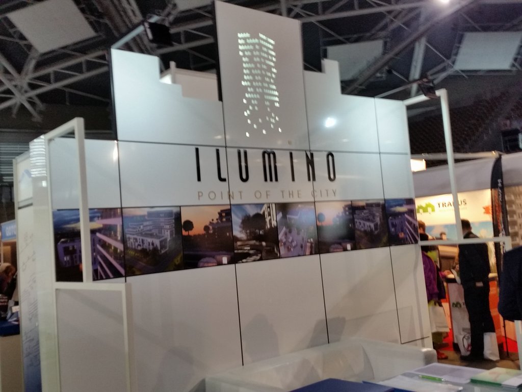 Projekt stoiska o wymiarach 4 m x 3 m i wysokości 3,8 m. Zaprojektowano ścianę w konstrukcji stalowej lakierowanej proszkowo. Obłożenie ściany „kasetonowe” – dibond frezowany i zaginany. Logo frezowane podświetlane od wewnątrz. Dodatkowo podświetlane kasetony z wizualizacjami.