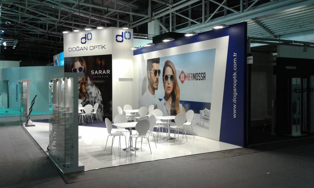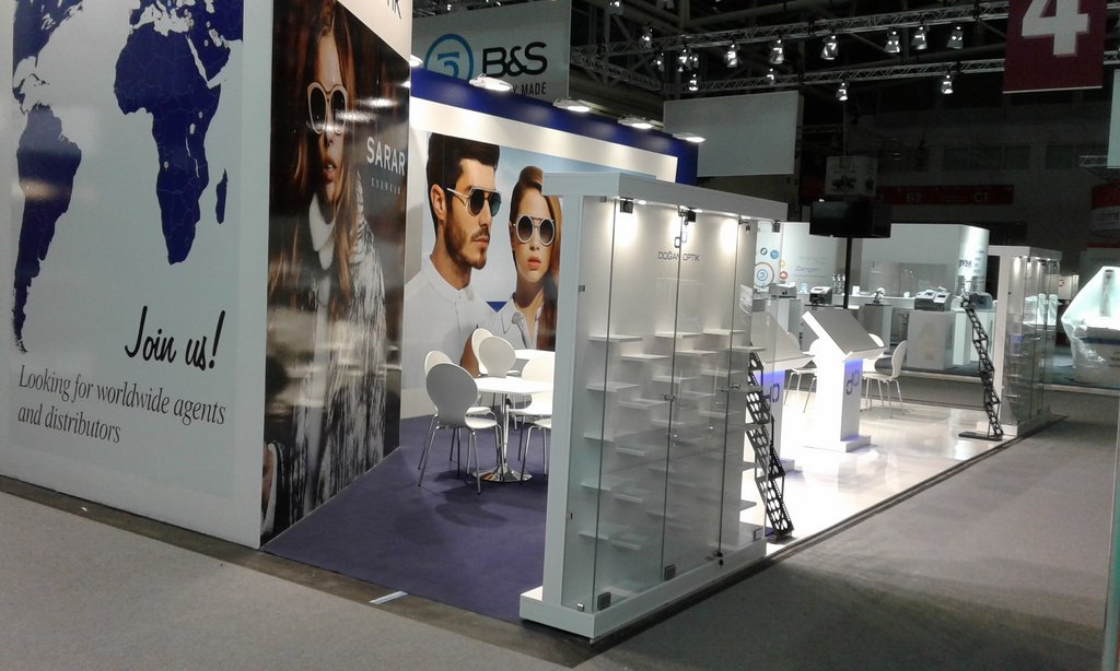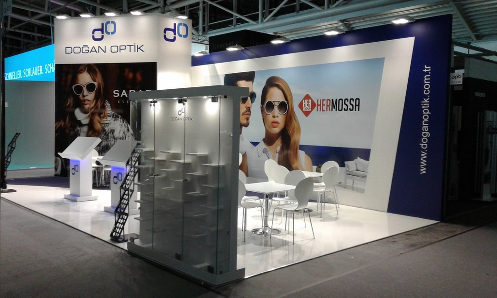 Wykonane stoiska targowe na targi w Düsseldorf w Niemczech. Indywidualne stoisko targowe dla firmy produkującej okulary przeciwsłoneczne.