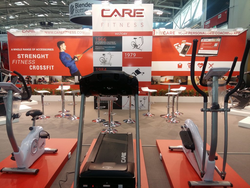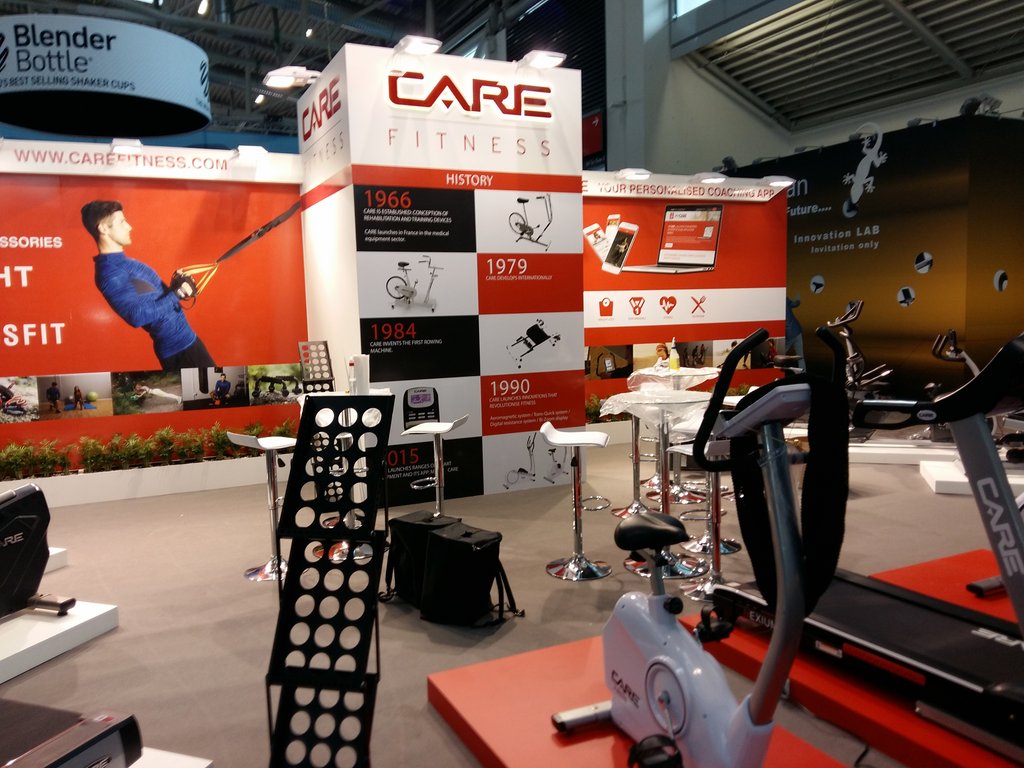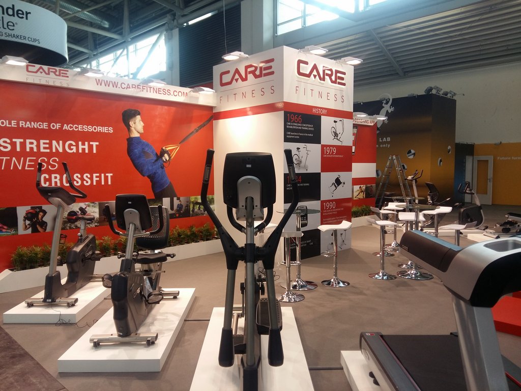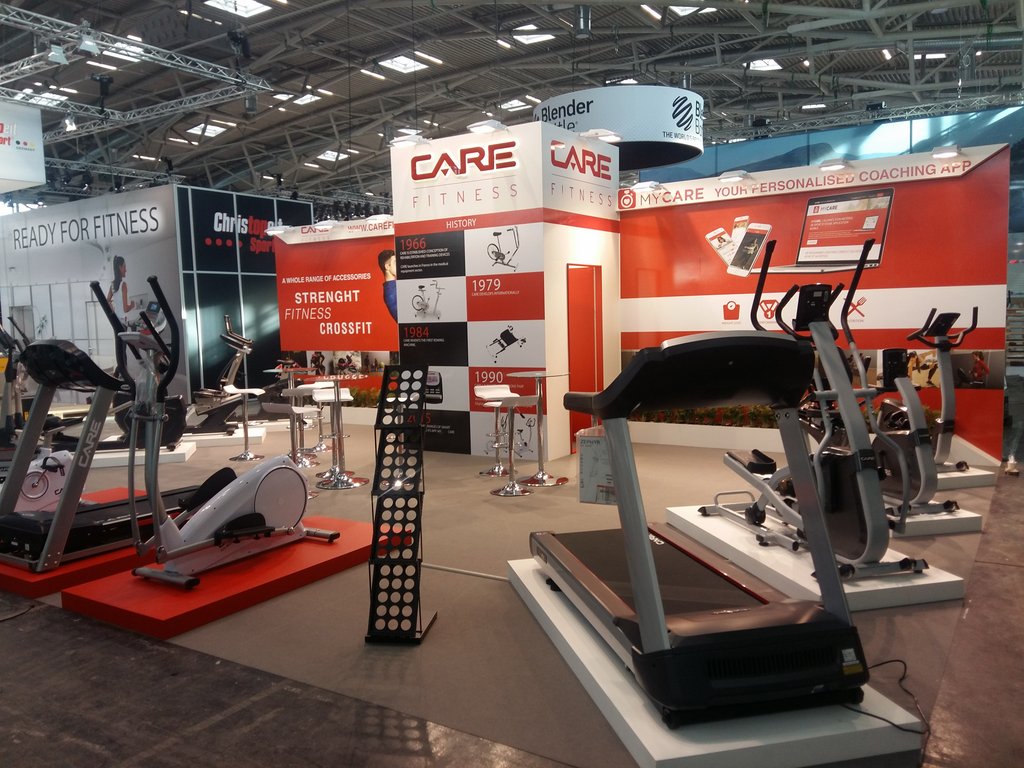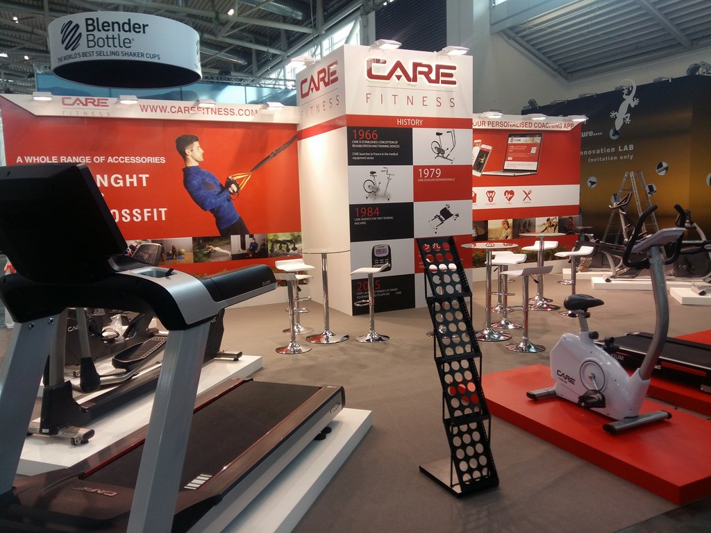 Zabudowa stoiska targowego wykonana na targi w Hanowerze, dla firmy oferującej wyposażenie siłowni i klubów fitness.