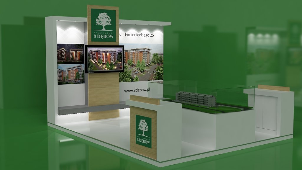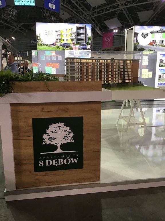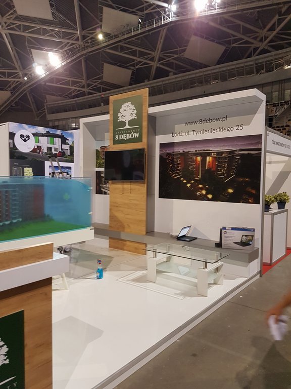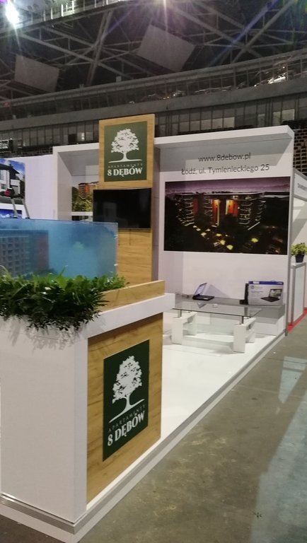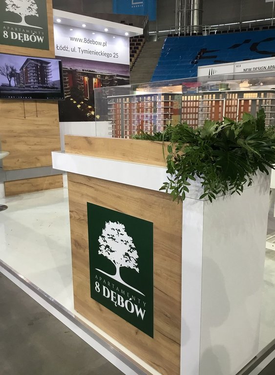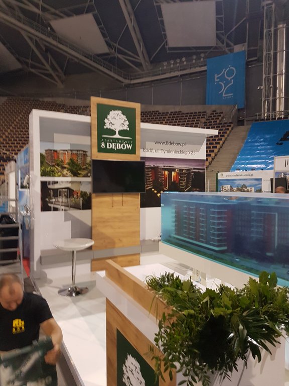 Tym razem na targach mieszkaniowych w łódzkiej Atlas Arenie – Łódzkie Targi Nieruchomości, Mieszkania, Domy 29 – 30 października 2018 roku wykonywaliśmy zabudowy wystawiennicze dla trzech deweloperów: Sommo Techone z inwestycją Sienkiewicza 53 w Łodzi, Essembla Group z inwestycją NOVA Lipova zlokalizowanej przy ulicy Lipowej 59 oraz opisane poniżej stoisko 8 Dębów z inwestycją przy ulicy Tymienieckiego 25 w Łodzi. Zatem razem ze stoiskiem Ilumino dla Mota-Engil oraz , których w tym roku nie montowaliśmy jest na tych targach już 5 stoisk, co stanowi dużą część zabudowy indywidualnej wystawienniczej na tej imprezie targowej. Stoisko posiada podłogę podniesioną na 10 cm wykończoną panelami białymi na wysoki połysk. W związku z tym, iż stoisko było półwyspowe zawierało tylko tylną ścianę i było dostępne z trzech stron. Na narożnikach zlokalizowano lady natomiast w centrum podstawę pod makietę. Ściana centralna wykonana w połysku z zadaszeniem z podświetleniem i wielkoformatowymi wizualizacjami inwestycji oraz pionową ścianą z TV i ukrytą za nią przestrzenią magazynową w formie szafy w kolorze szarym, jak również ławką w kolorze szarym mat na sprzęty, ulotki i dokumenty. Również Lady narożne wykonane są w laminacie HPL biały połysk. Ocieplającymi akcentami zarówno na ścianach jak i ladach są elementy drewnopodobne wyprodukowane z wysokiej jakości płyty drewnopodobnej ze strukturą prawdziwego drewna. Natomiast do zielonego logotypu klienta – dewelopera, znajdującego się na głównej ścianie oraz frontach lad dopasowane były donice z roślinnością wbudowane w lady. Klient wynajął również meble ruchome, jak hokery – krzesła barowej, stolik oraz krzesełka wszystkie o nowoczesnych formach. Stoisko miało powierzchnię 16 m2 i wysokości tylnej ściany od 270 – 350 cm. Stoisko wyprodukowane jest jako wielorazowe na 6-8 edycji targów wraz z magazynowaniem, logistyką, montażami, demontażami, serwisami i konserwacją po stronie firmy targowej SPS stoisko.com Sp. z o. o.