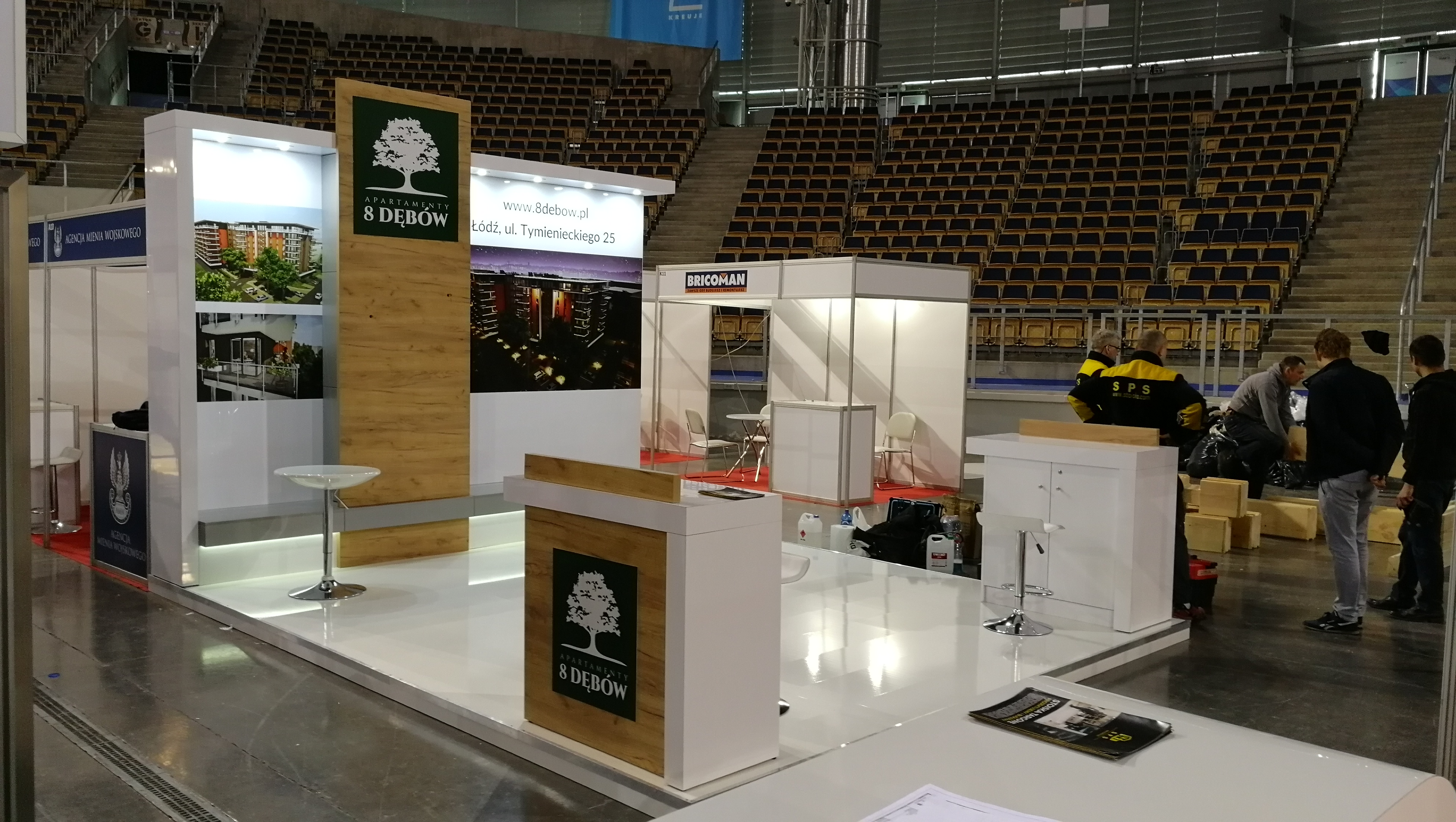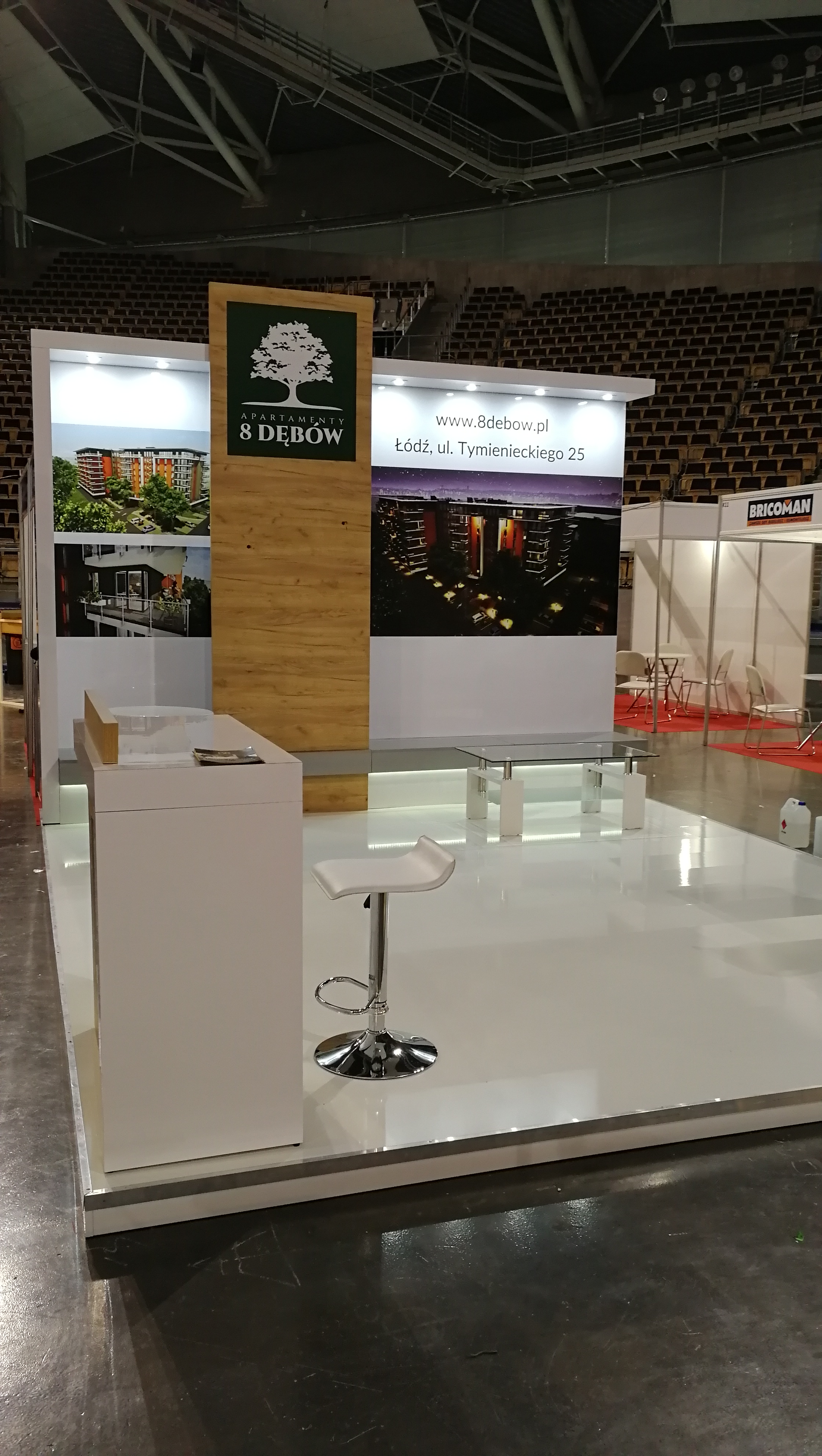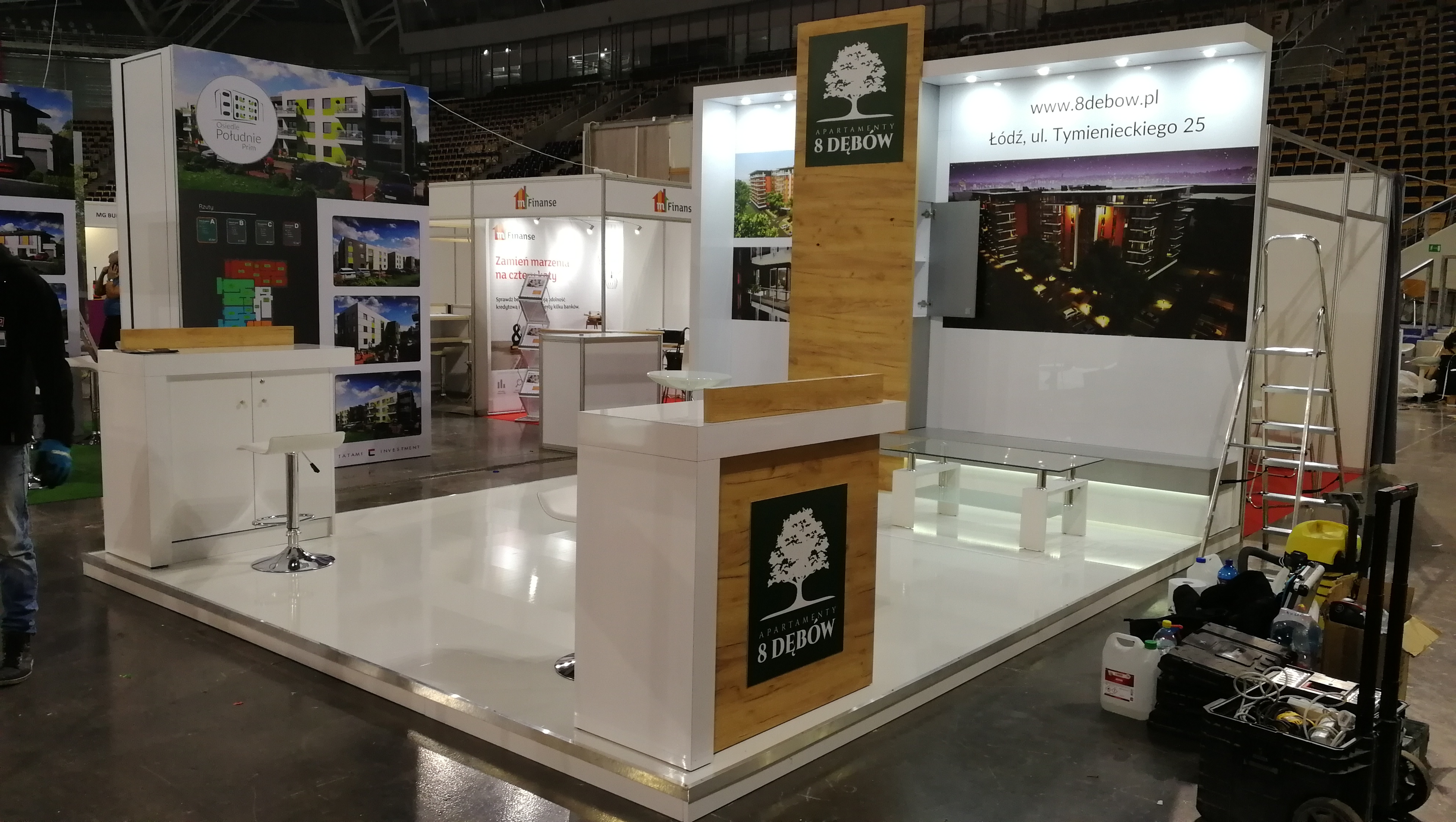 Tym razem na targach mieszkaniowych w łódzkiej Atlas Arenie – Łódzkie Targi Nieruchomości, Mieszkania, Domy 29 – 30 października 2018 roku wykonywaliśmy zabudowy wystawiennicze dla trzech deweloperów: Sommo Techone z inwestycją Sienkiewicza 53 w Łodzi, Essembla Group z inwestycją NOVA Lipova zlokalizowanej przy ulicy Lipowej 59 oraz opisane poniżej stoisko 8 Dębów z inwestycją przy ulicy Tymienieckiego 25 w Łodzi. Zatem razem ze stoiskiem Ilumino dla Mota-Engil oraz , których w tym roku nie montowaliśmy jest na tych targach już 5 stoisk, co stanowi dużą część zabudowy indywidualnej wystawienniczej na tej imprezie targowej. Stoisko posiada podłogę podniesioną na 10 cm wykończoną panelami białymi na wysoki połysk. W związku z tym, iż stoisko było półwyspowe zawierało tylko tylną ścianę i było dostępne z trzech stron. Na narożnikach zlokalizowano lady natomiast w centrum podstawę pod makietę. Ściana centralna wykonana w połysku z zadaszeniem z podświetleniem i wielkoformatowymi wizualizacjami inwestycji oraz pionową ścianą z TV i ukrytą za nią przestrzenią magazynową w formie szafy w kolorze szarym, jak również ławką w kolorze szarym mat na sprzęty, ulotki i dokumenty. Również Lady narożne wykonane są w laminacie HPL biały połysk. Ocieplającymi akcentami zarówno na ścianach jak i ladach są elementy drewnopodobne wyprodukowane z wysokiej jakości płyty drewnopodobnej ze strukturą prawdziwego drewna. Natomiast do zielonego logotypu klienta – dewelopera, znajdującego się na głównej ścianie oraz frontach lad dopasowane były donice z roślinnością wbudowane w lady. Klient wynajął również meble ruchome, jak hokery – krzesła barowej, stolik oraz krzesełka wszystkie o nowoczesnych formach. Stoisko miało powierzchnię 16 m2 i wysokości tylnej ściany od 270 – 350 cm. Stoisko wyprodukowane jest jako wielorazowe na 6-8 edycji targów wraz z magazynowaniem, logistyką, montażami, demontażami, serwisami i konserwacją po stronie firmy targowej SPS stoisko.com Sp. z o. o.