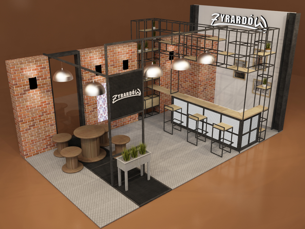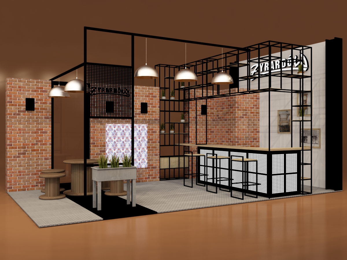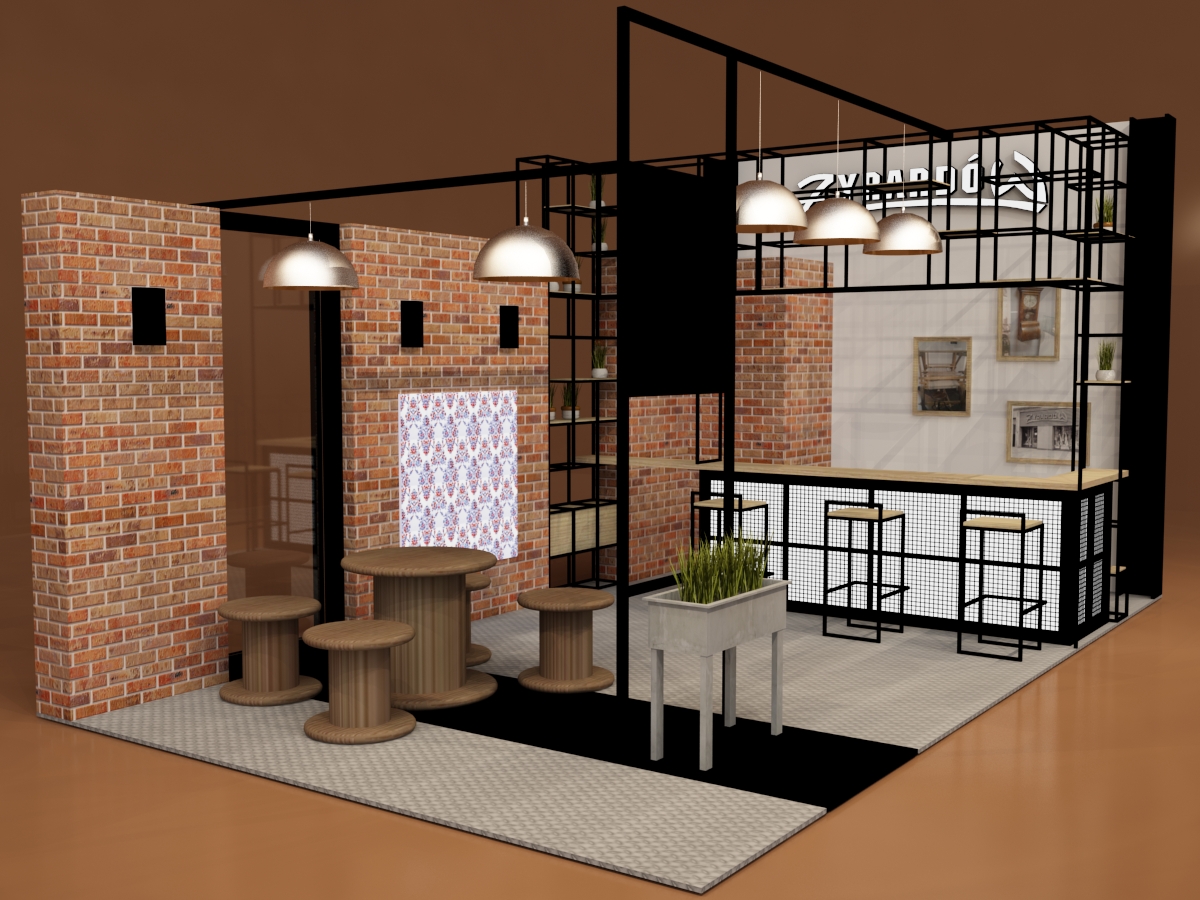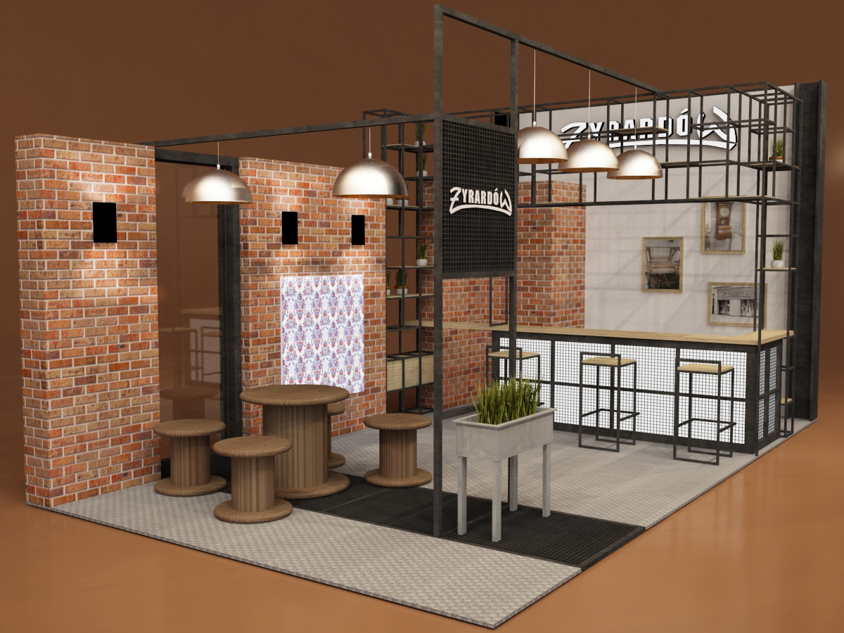 Stoisko swój po industrialny charakter uzyskuje poprzez zastosowanie okładziny z cegieł rustykalnych oraz paneli betonowych. Podłoga podniesiona z posadzką z paneli betonowych, blachy ryfloanej nierdzewnej oraz czarnych paneli połysk nadaje nowoczesnego wydźwięku. Całość utrzymana w klimacie fabrycznej przestrzeni restauracji lub pubu.