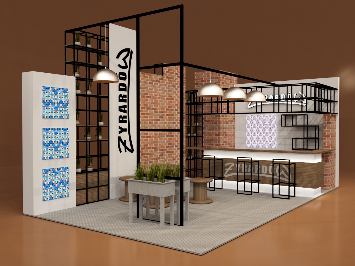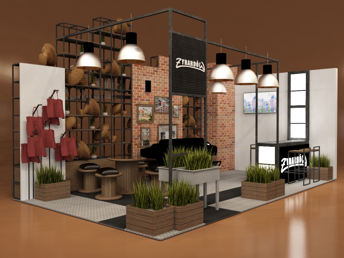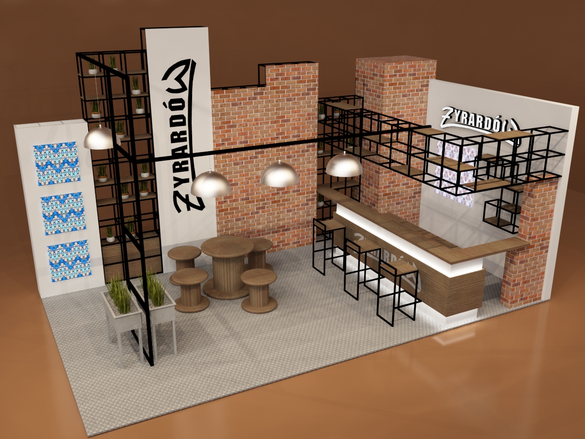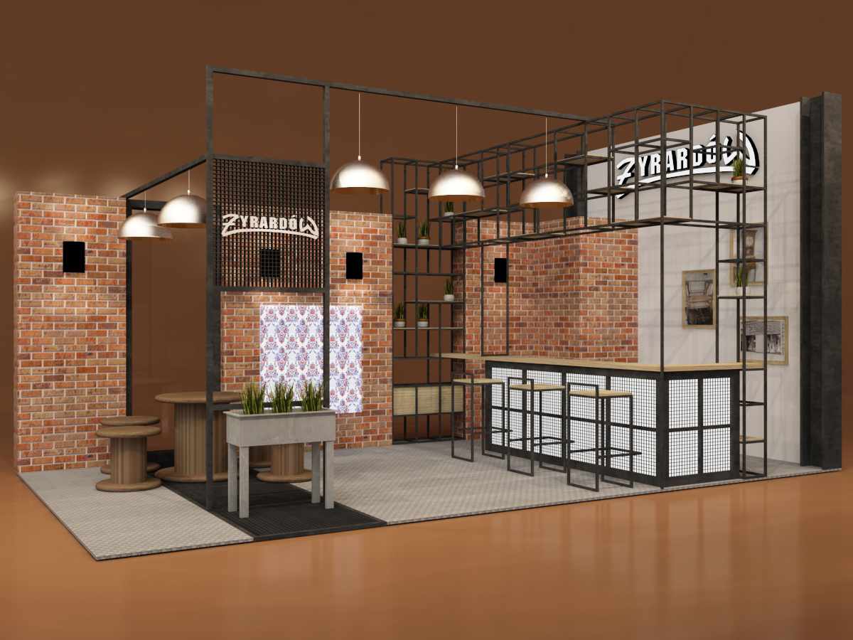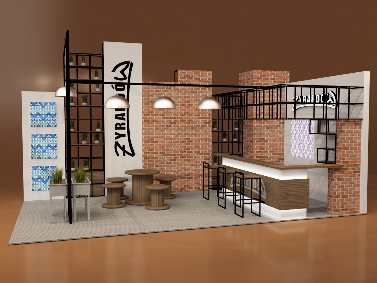 Stoisko swój po industrialny charakter uzyskuje poprzez zastosowanie okładziny z cegieł rustykalnych oraz paneli betonowych. Podłoga podniesiona z posadzką z paneli betonowych, blachy ryfloanej nierdzewnej oraz czarnych paneli połysk nadaje nowoczesnego wydźwięku. Całość utrzymana w klimacie fabrycznej przestrzeni restauracji lub pubu.