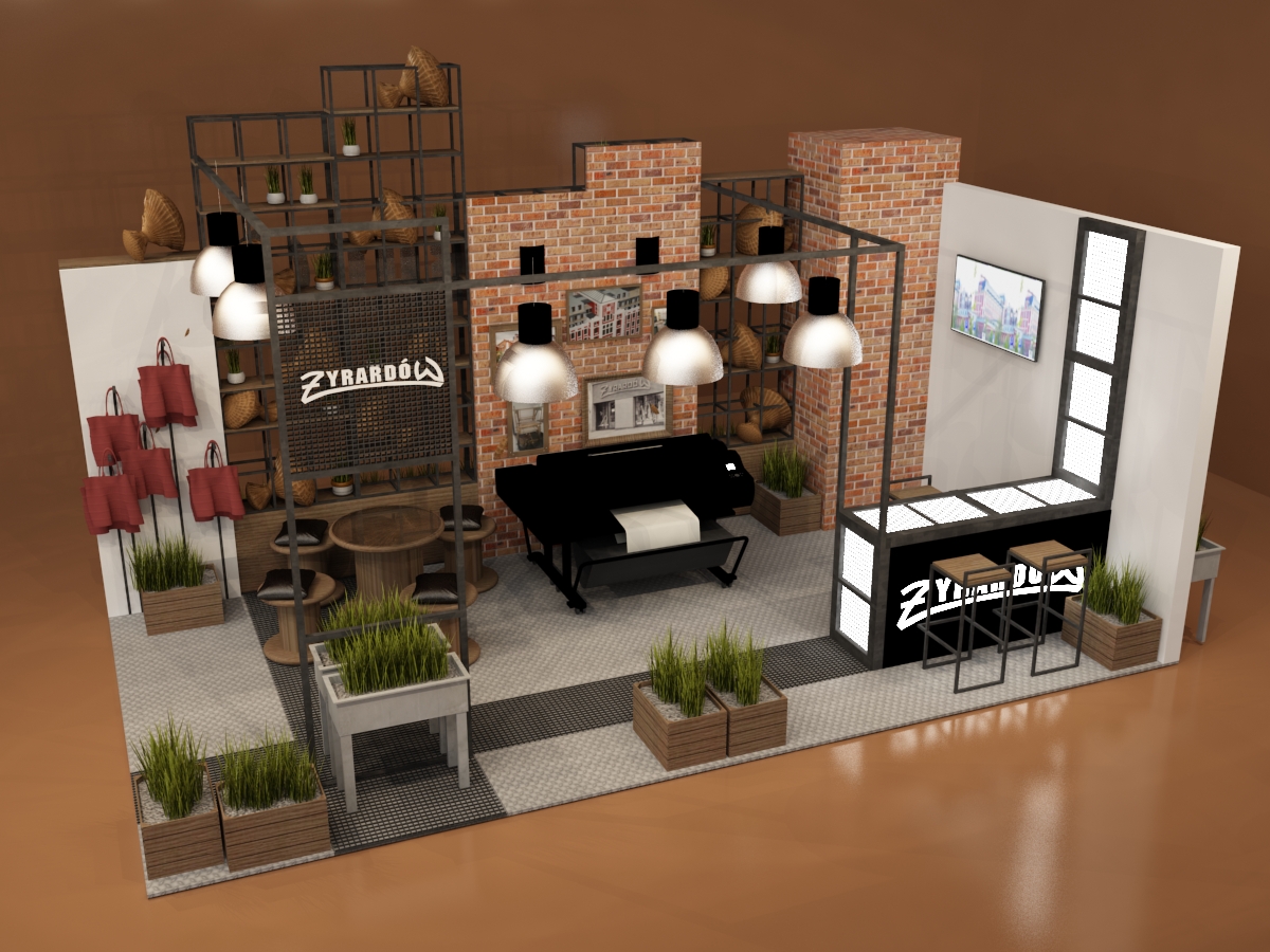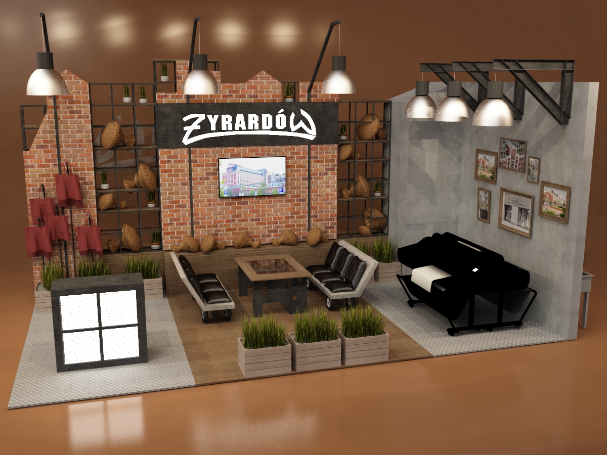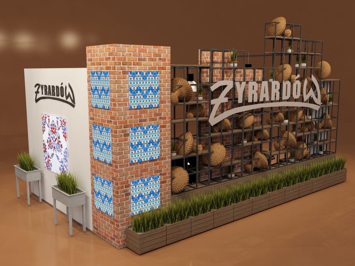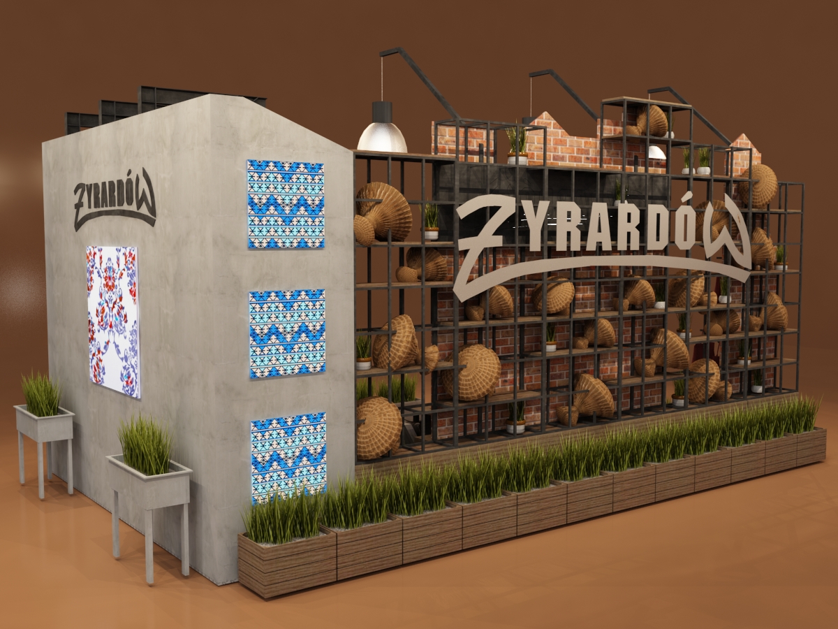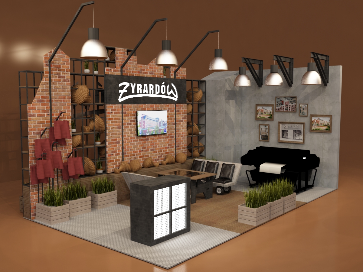 Nowoczesne stoisko targowe, wyspowe, wolno stojące w loftowym i fabrycznym stylu dla miasta Żyrardów i Muzeum Miasta Żyrardów z wykorzystaniem eksponatów i rekwizytów historycznych.