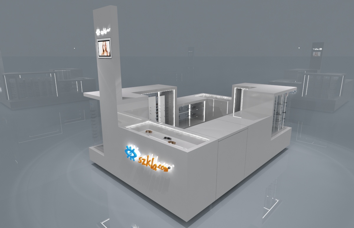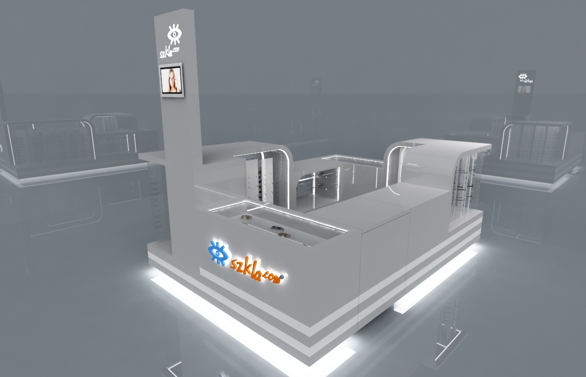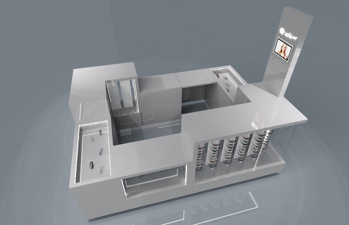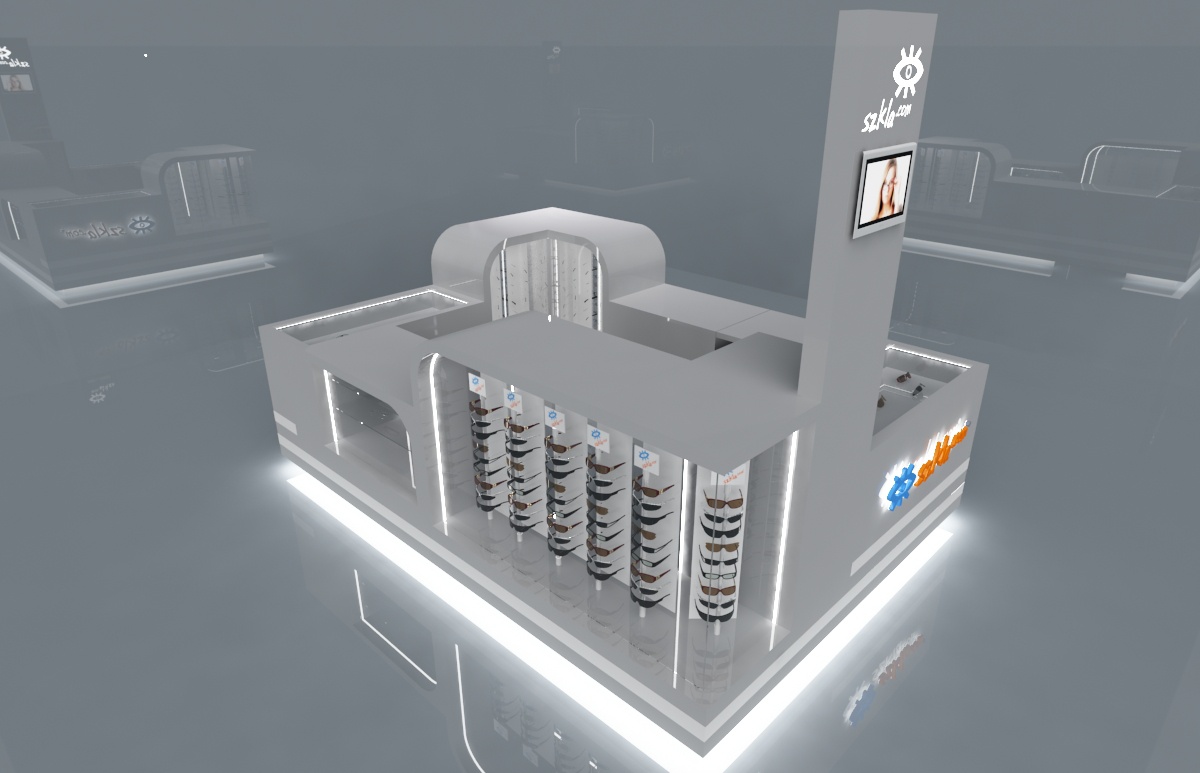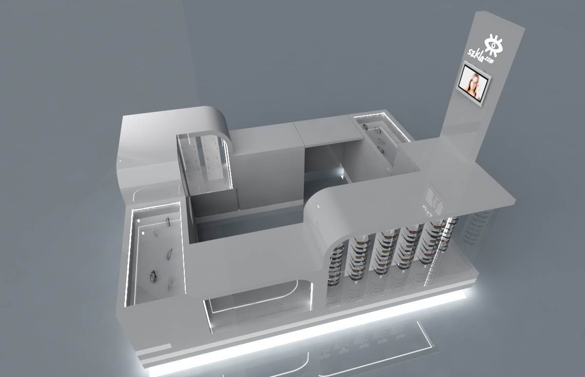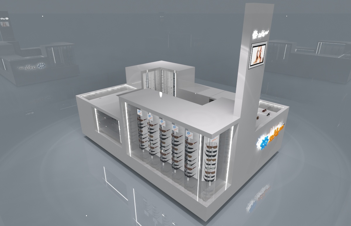 Projekt stoiska handlowego typu wyspa do galerii handlowej, prezentującego okulary słoneczne i optyczne.
