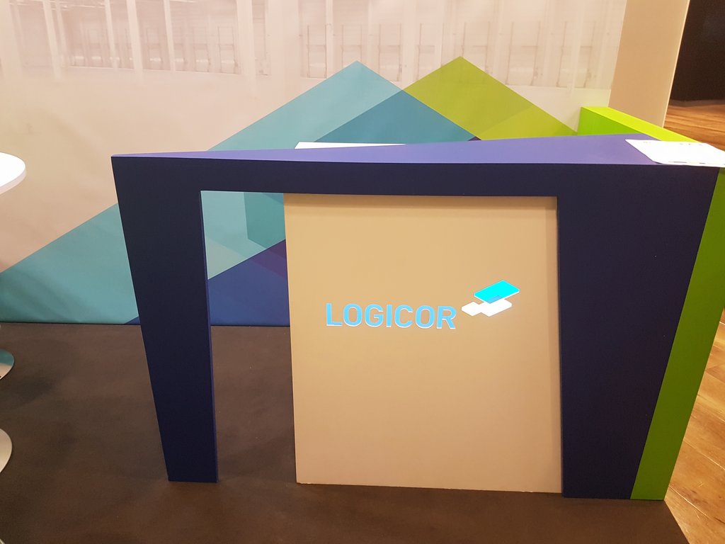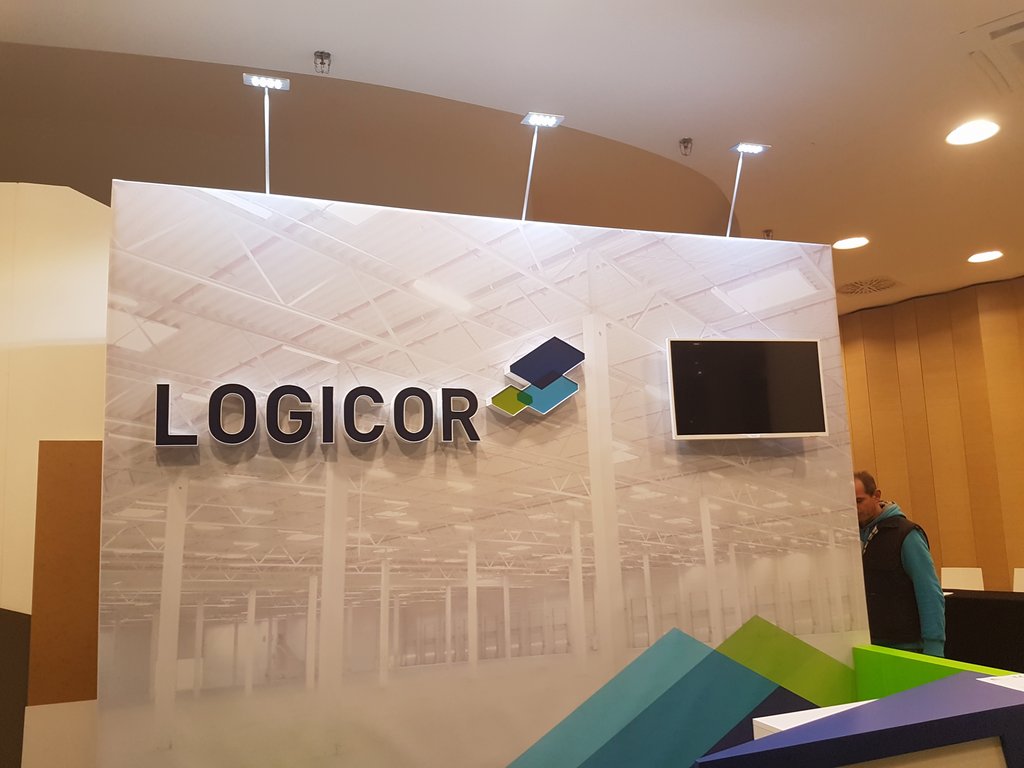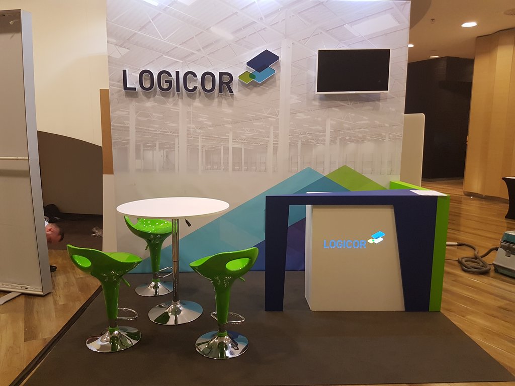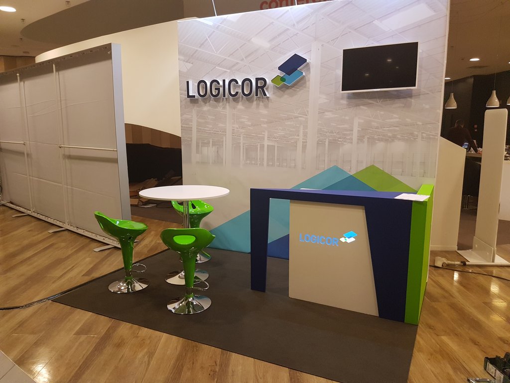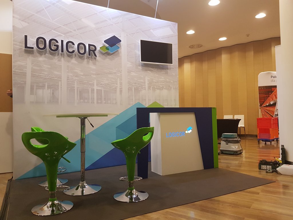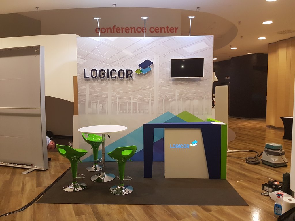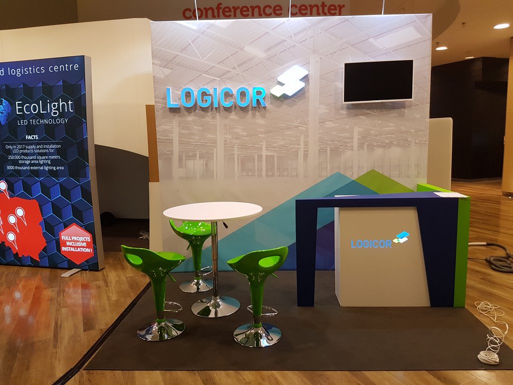 Przedstawiamy małe stoisko konferencyjne na zjazdy, sympozja i spotkania w hotelach oraz centrach konferencyjnych. Stoisko wielorazowe, budowlane, indywidualne z tylną ścianą z grafiką wielkoformatową, telewizorem LED TV oraz literami kasetonowymi przedstawiającymi logo klienta z branży logistycznej i magazynowej LOGICOR. Na stoisku znajduje się również nowoczesna, kolorowa, indywidualna lada recepcyjna z podświetlanym logo oraz meble ruchome w postaci białym nowoczesnych, zielonych hokerów i stolika regulowanego. Ściana tylna podświetlona dodatkowo lampami metalohalogenowymi HQ 150W. Podłoga stoiska z posadzką z wykładziny dywanowej lepszej jakości (grubość powyżej 4 mm) z certyfikatem PPOŻ. Stoisko mimo, iż indywidualne i o ciekawej, niebanalnej formie możliwe do złożenia i rozłożenia w czasie do trzech godzin.